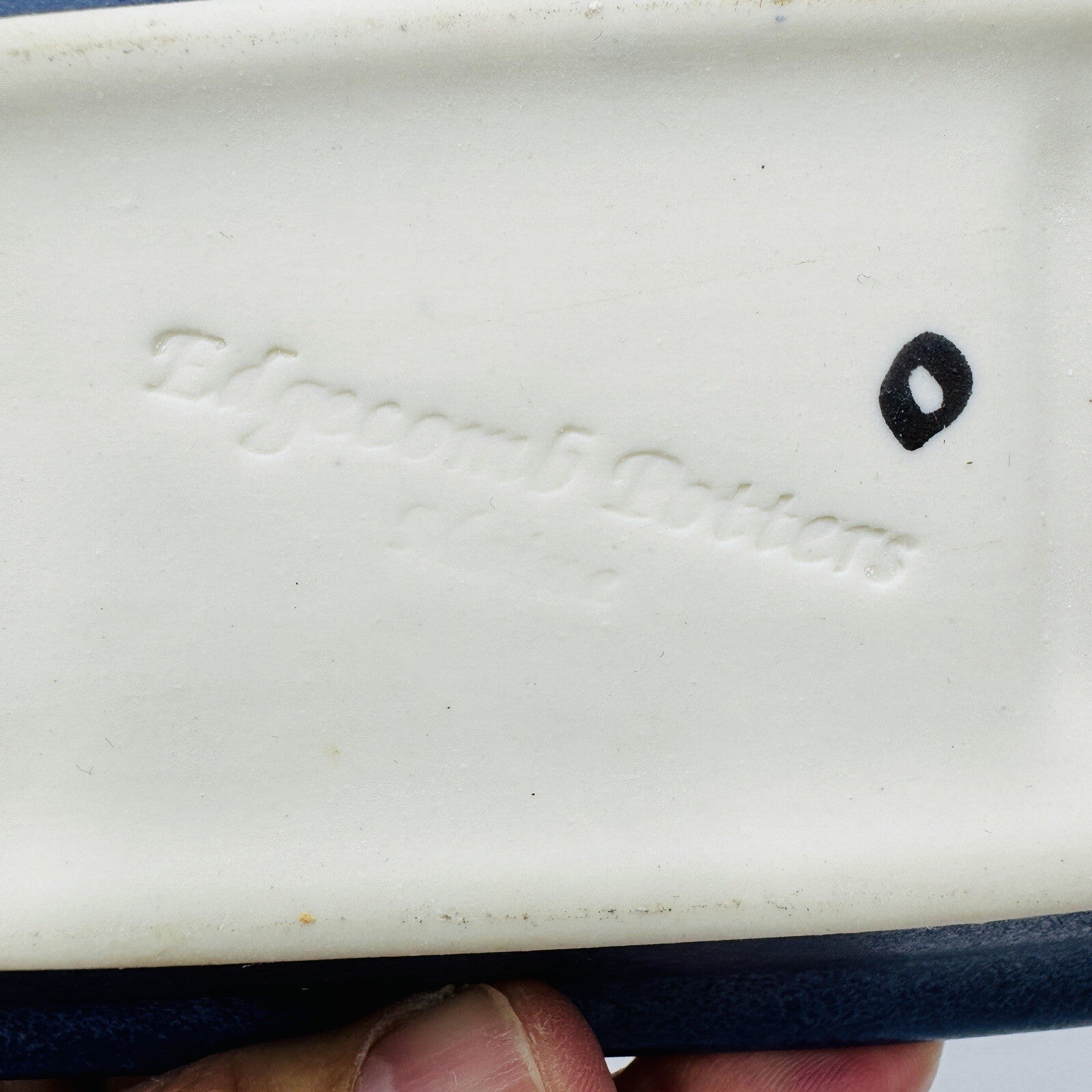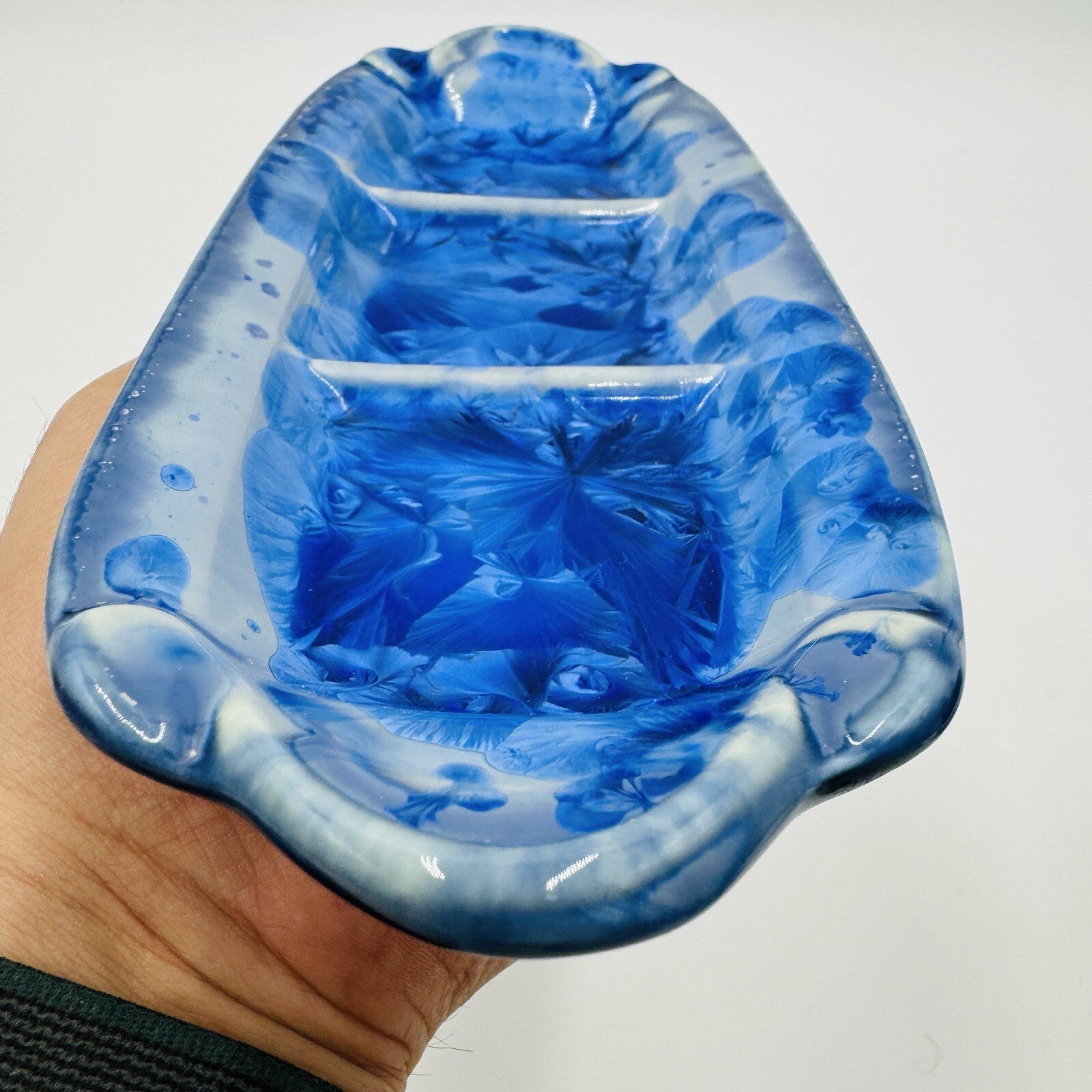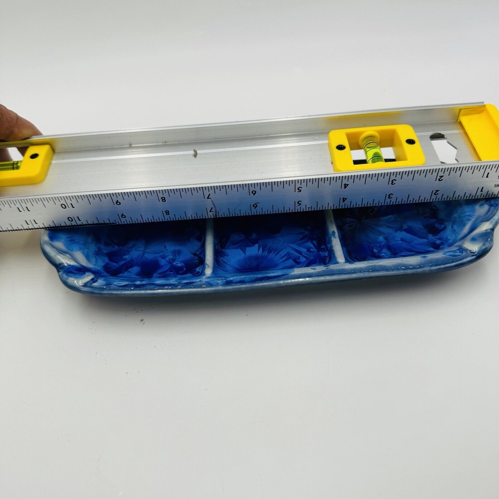 This is a vintage, signed, stoneware tray made by Edgecomb Potters in the United States. The tray is rectangular and divided, measuring 11 inches in length and 4 inches in width. It features an abstract, mid-century modern design with a blue crystalline finish.