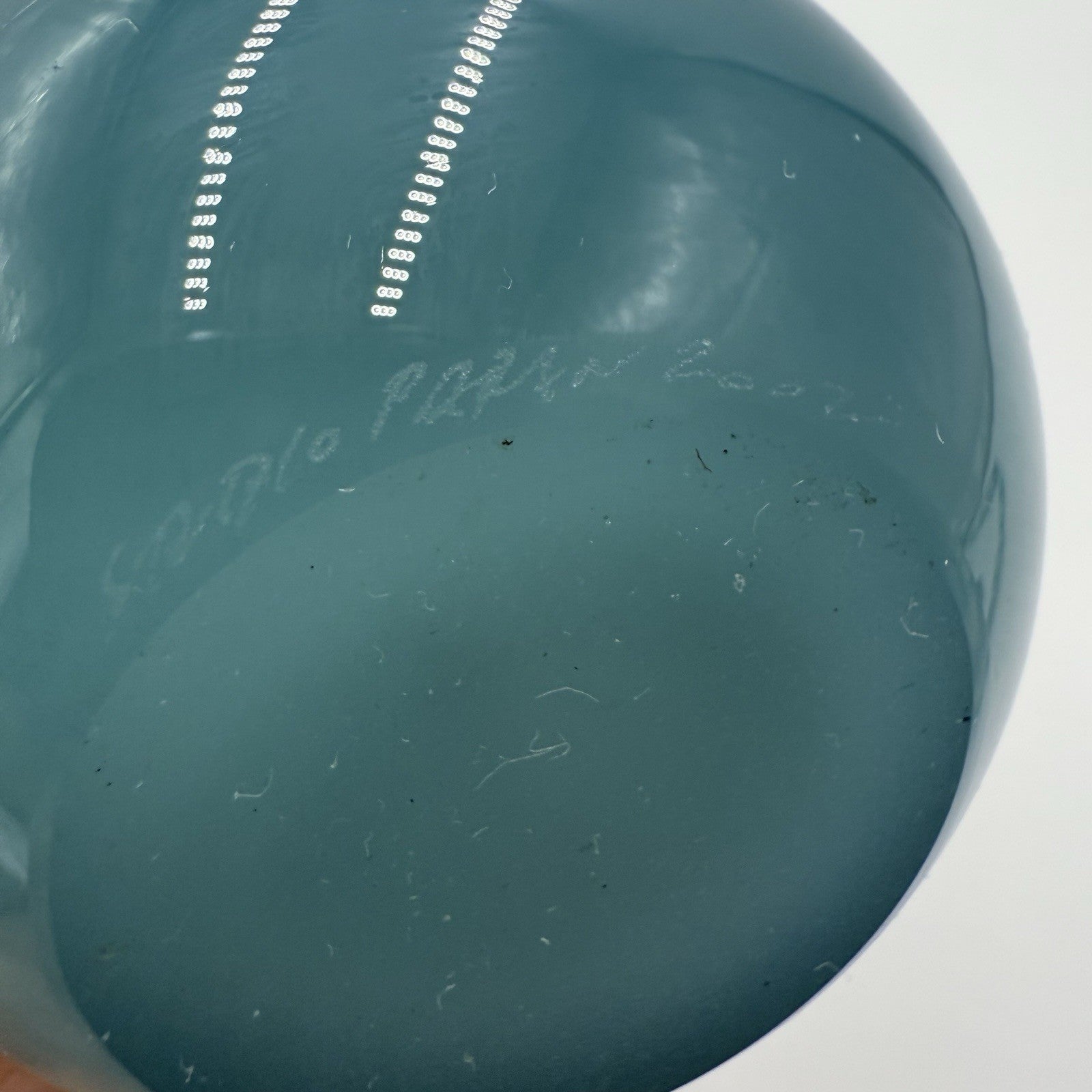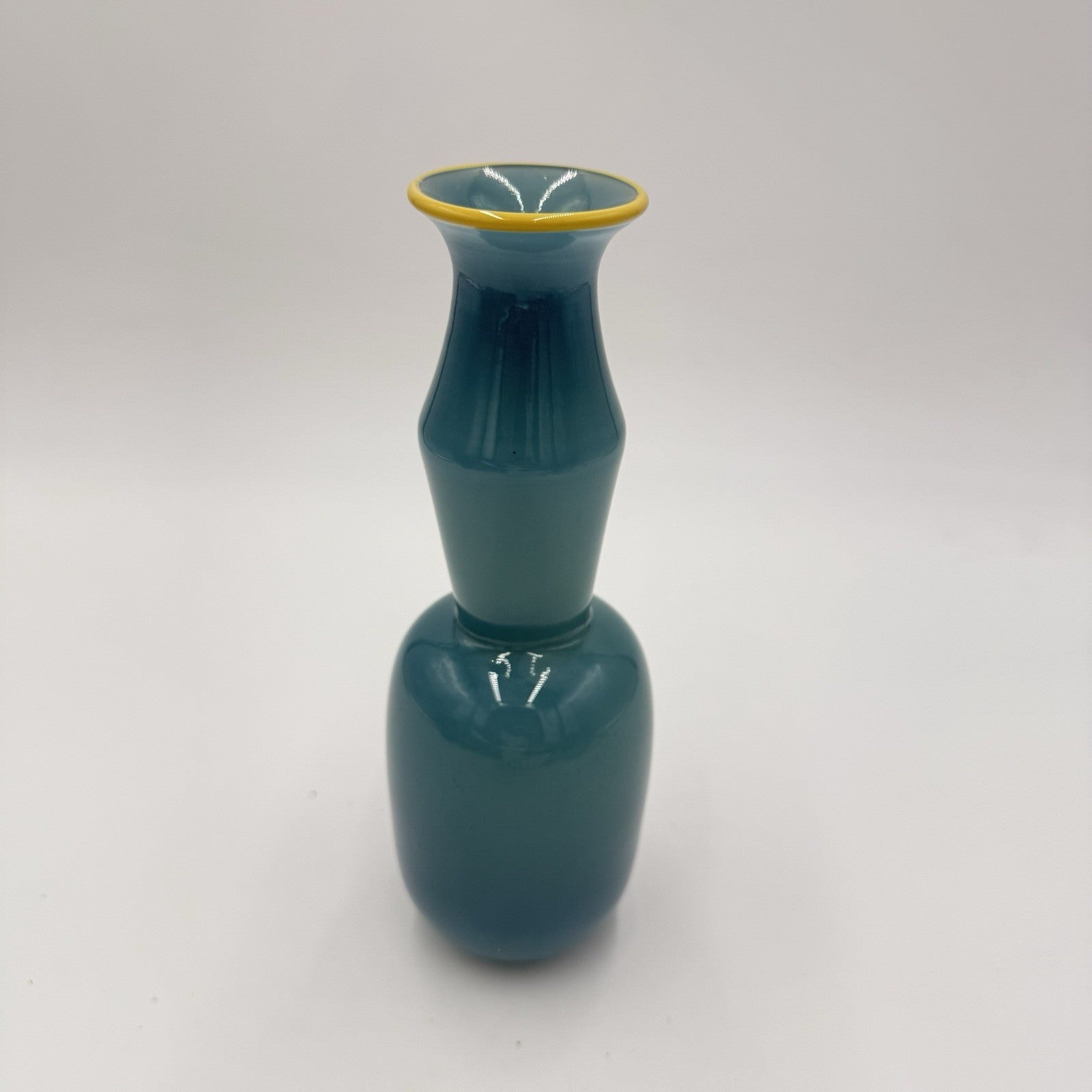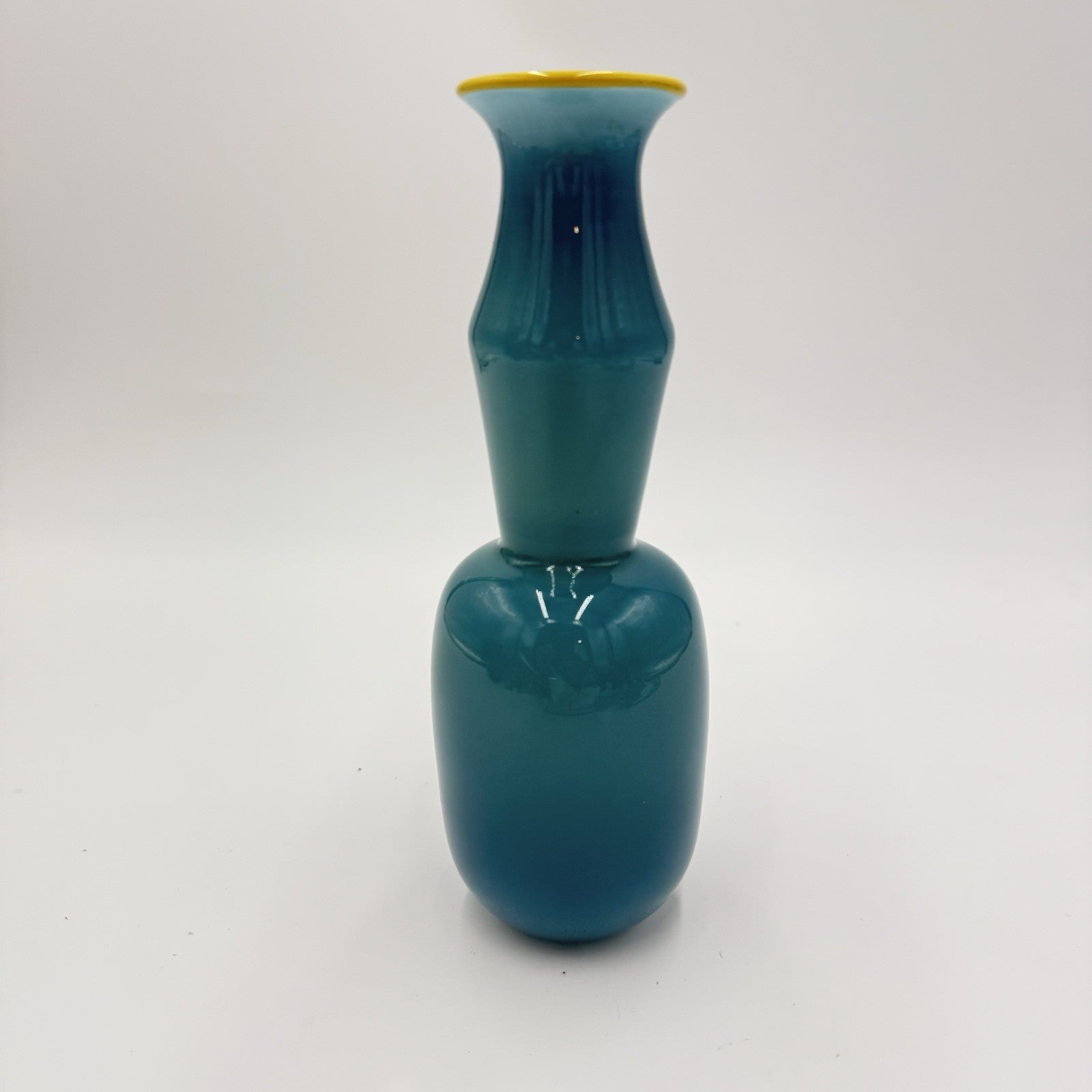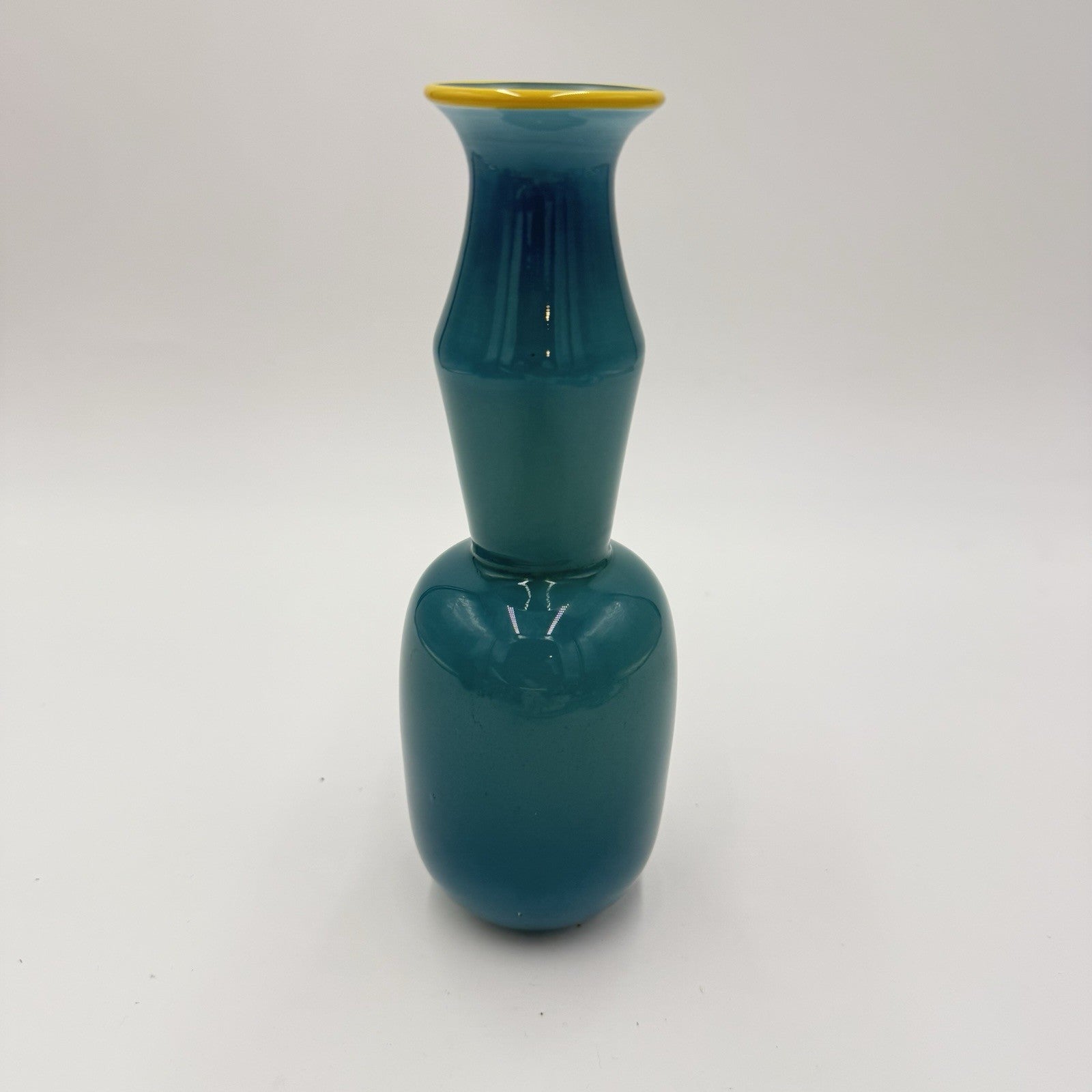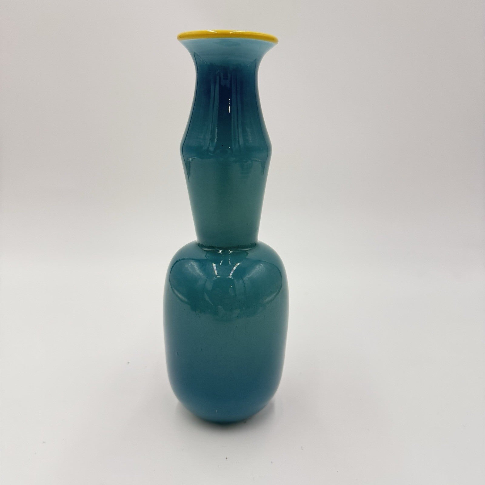 This hand-blown art glass vase in aqua color with a yellow rim is a stunning piece of vintage decor from Studio Paran. Signed by the artist in 2002, this original piece exudes a unique and artistic style. Made in North America, specifically in the United States, this 7.5" vase showcases the artisan's craftsmanship and attention to detail. The glossy finish and hand-blown production technique add to its appeal, making it a timeless piece for any collector or home décor enthusiast.