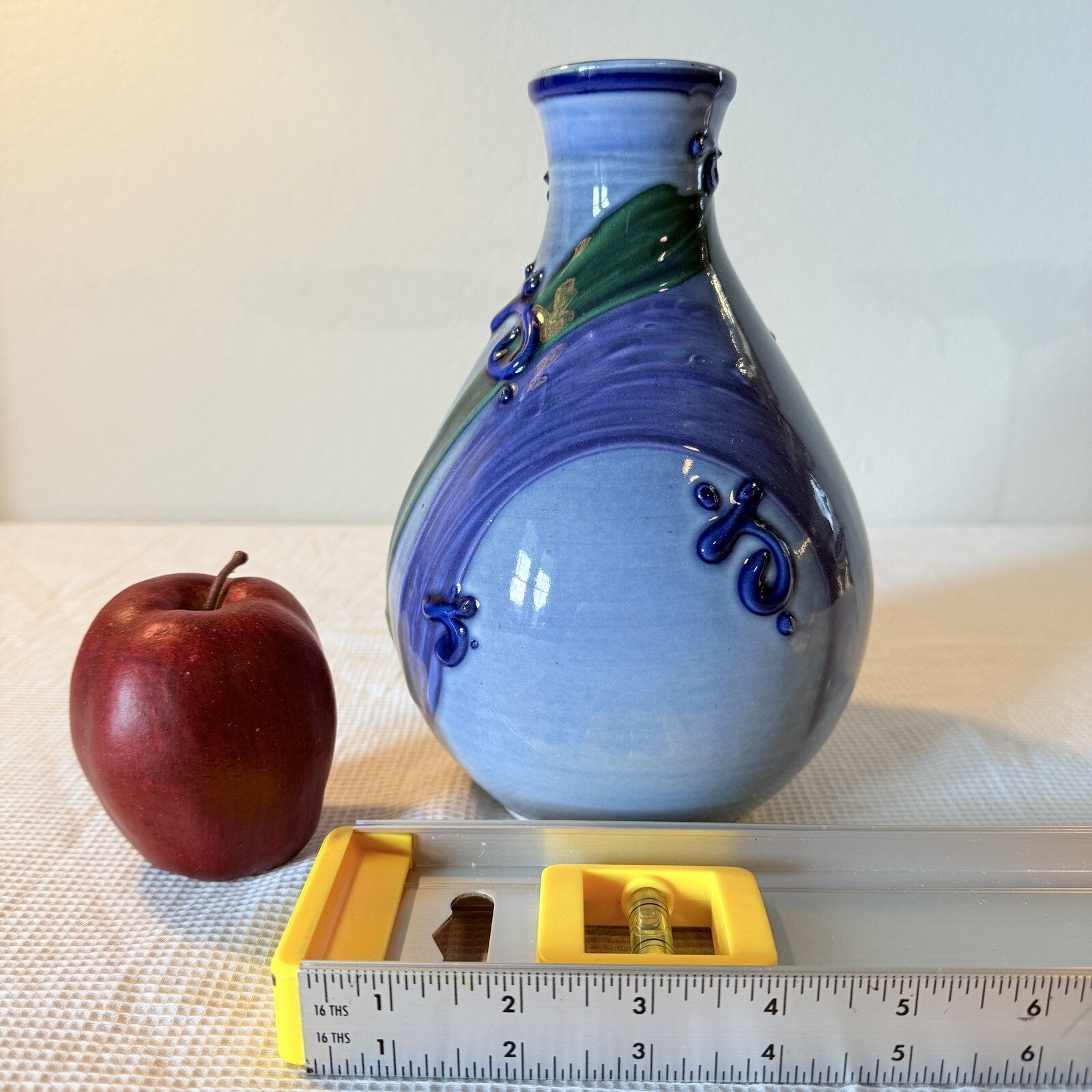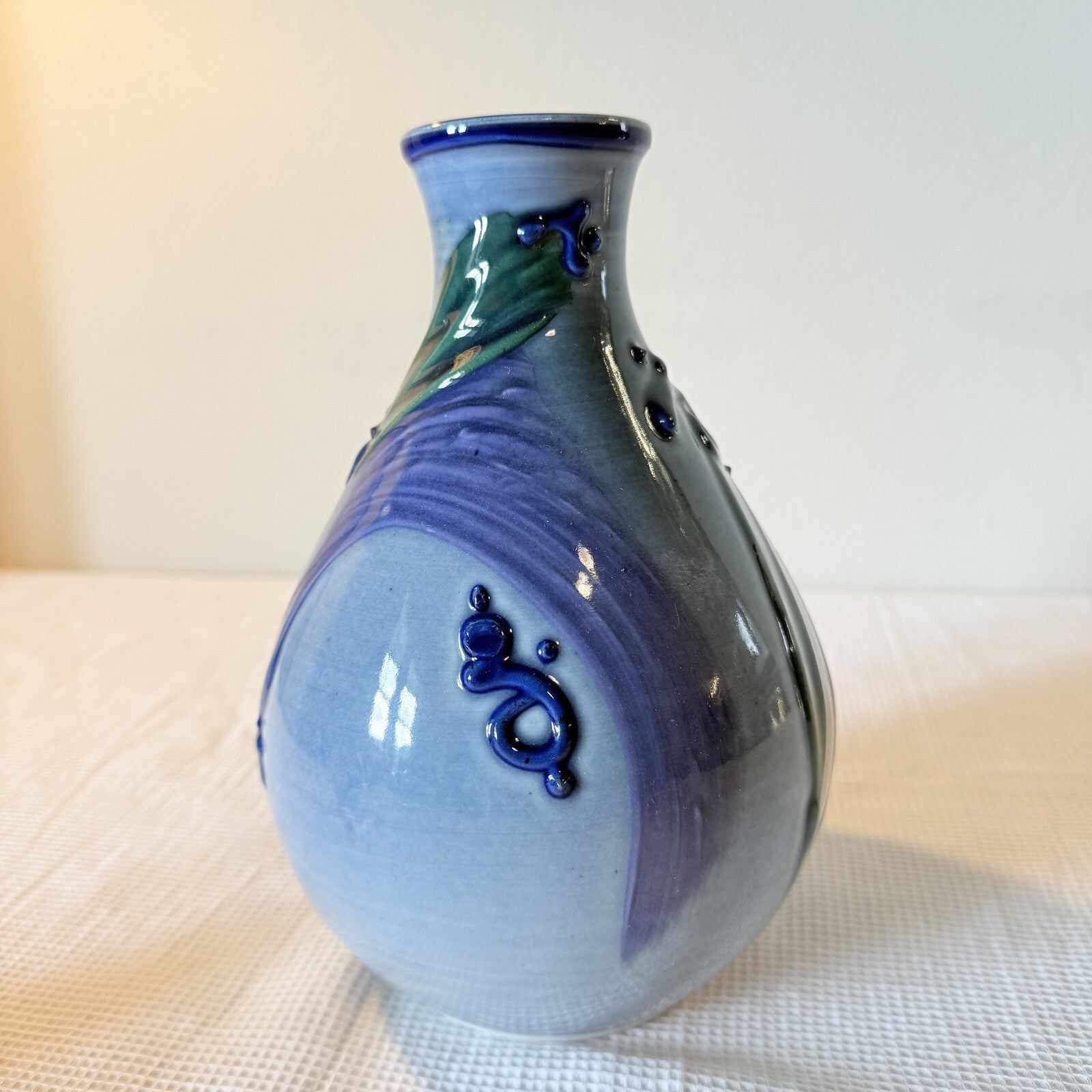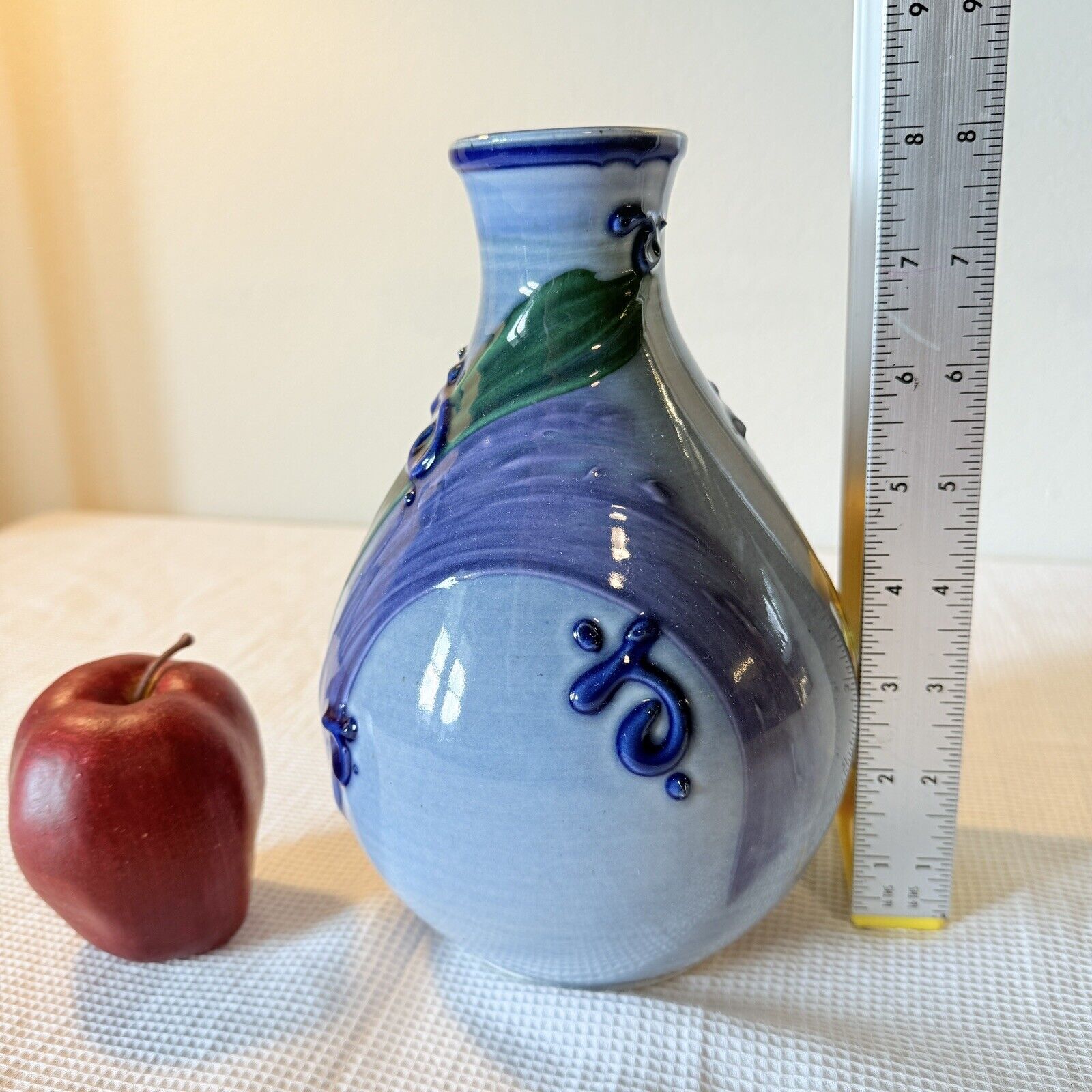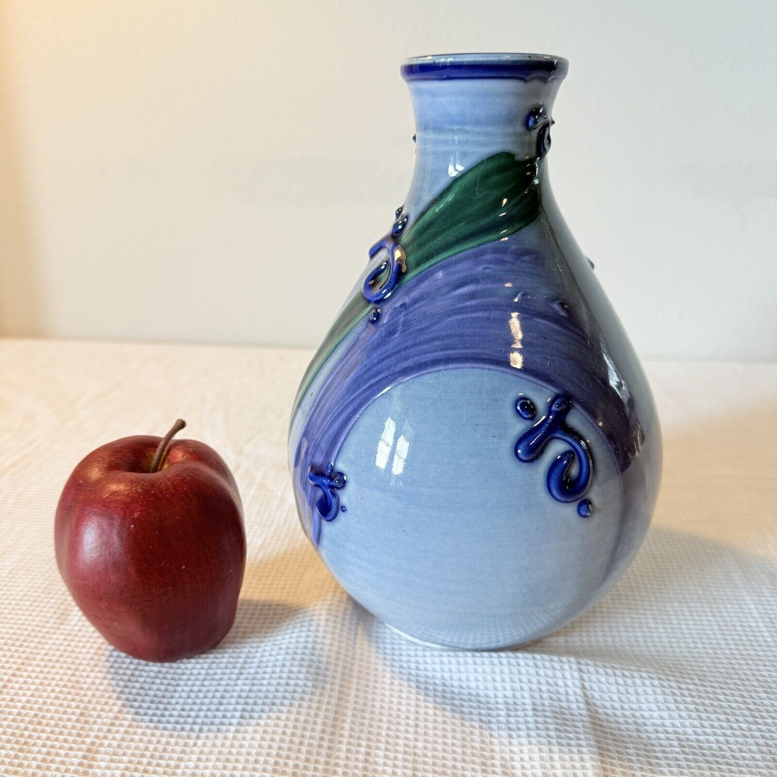 Studio Pottery Flower Vase Blue Purple Drip Ceramic Signed 8in H Swirls Leaf