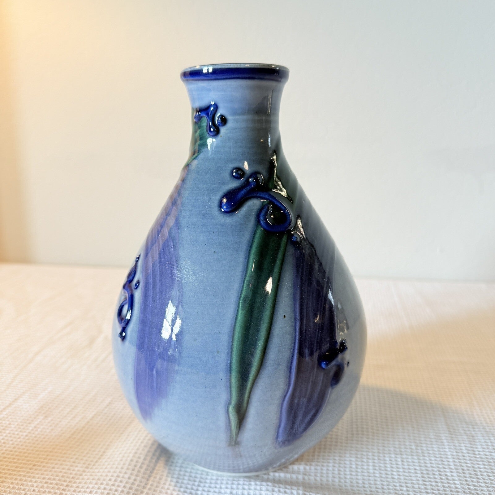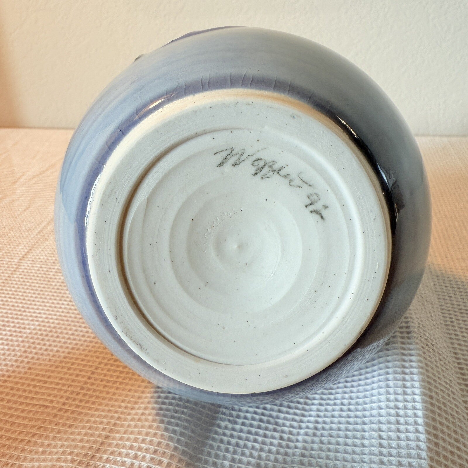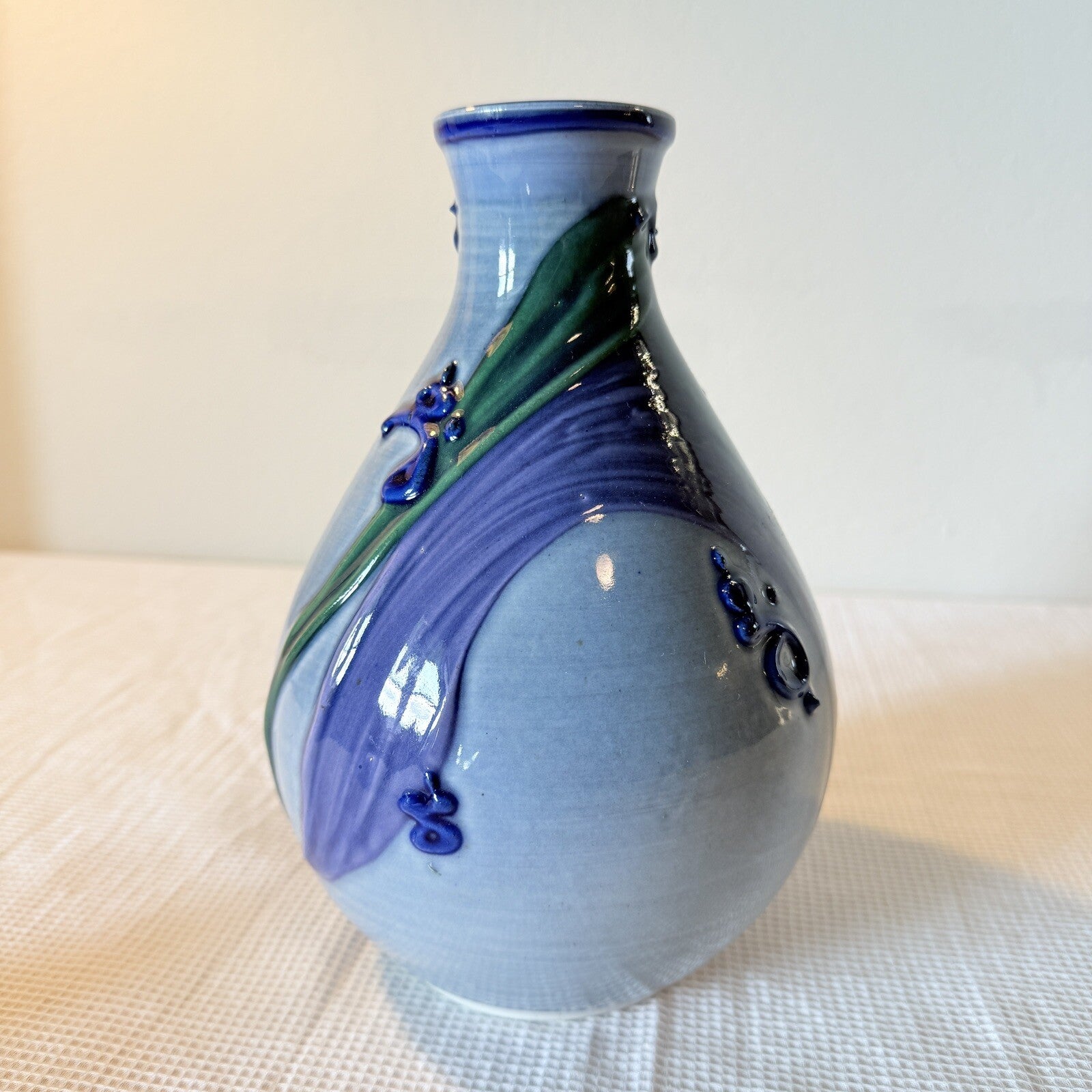 This beautiful studio pottery flower vase is a one-of-a-kind piece that will add a touch of contemporary style to any room. Handmade in the United States using traditional pottery techniques, this vase features a glossy finish and abstract pattern in shades of blue and purple. The vase stands at 8 inches tall and is signed by the artist.