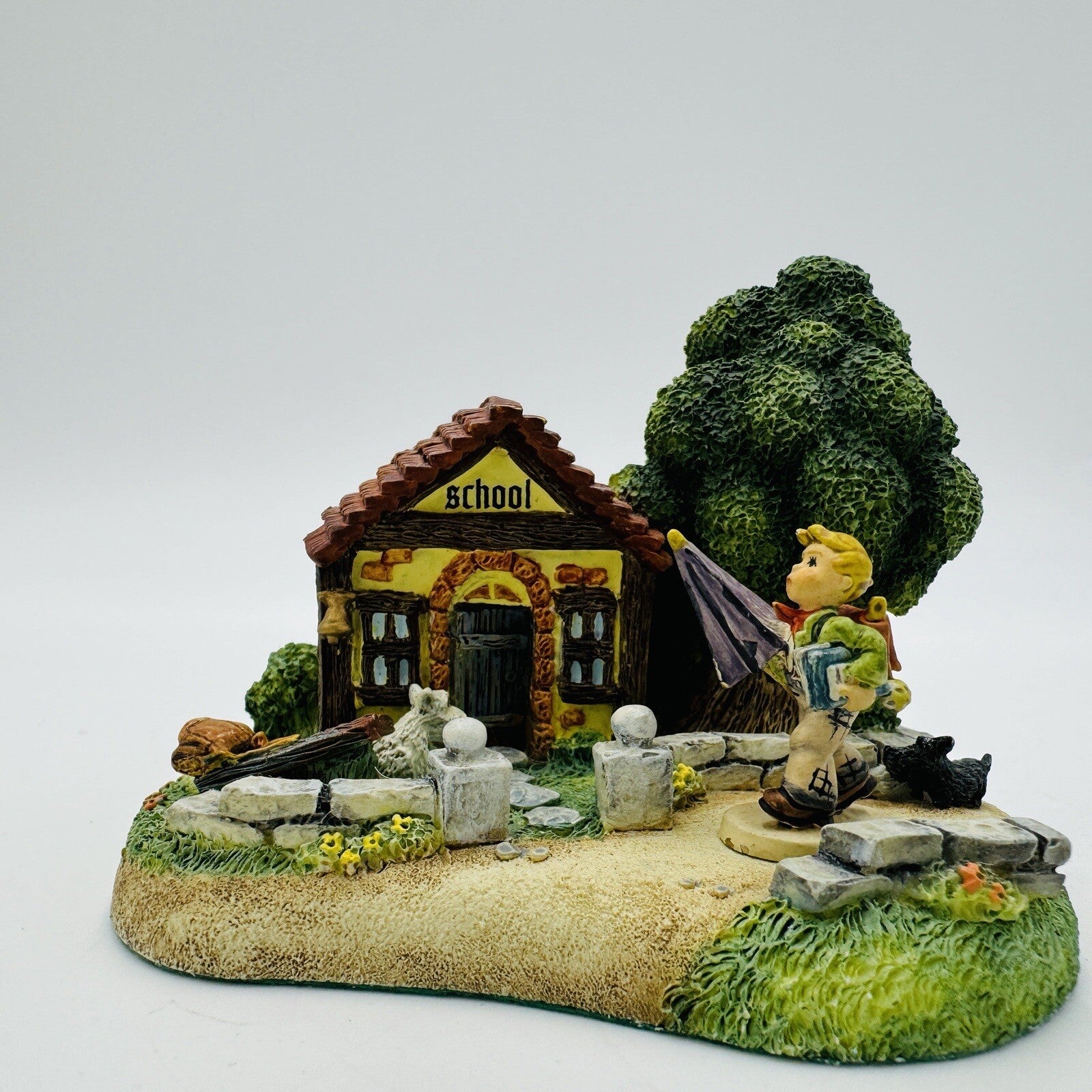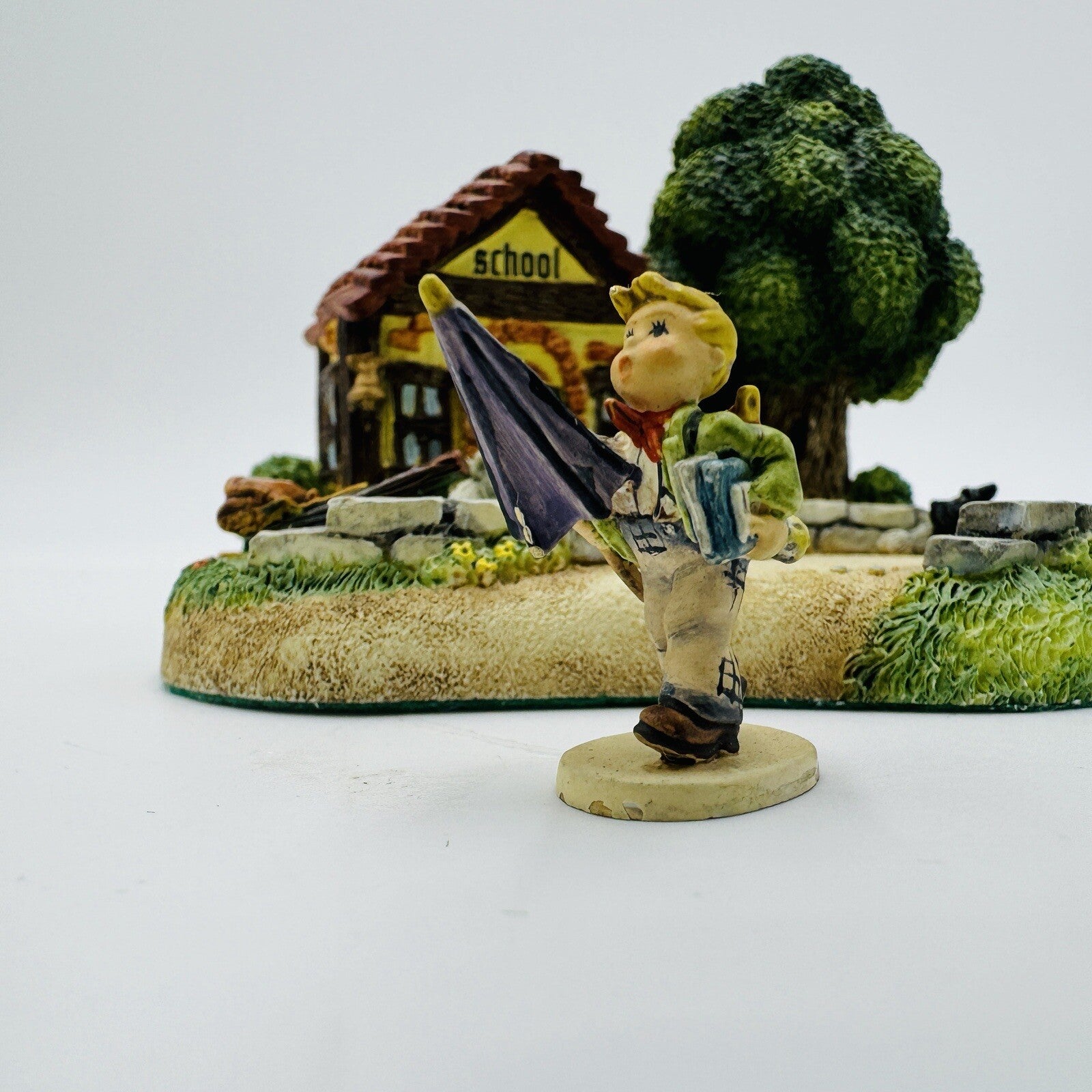 This miniature figurine from The Danbury Mint features a boy walking to school in rainy weather. The piece is made of resin and metal, and stands at 3 inches tall. It is part of the School Hummel collection, and is an original, hand-painted item from 1985.