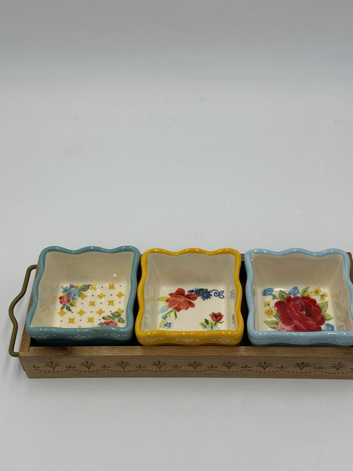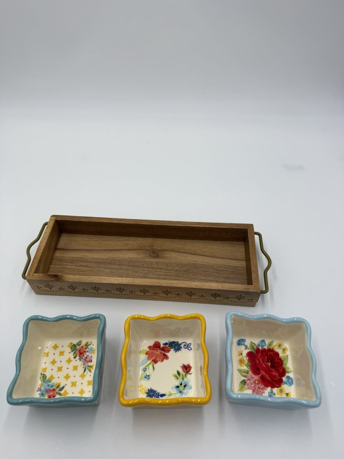 The Pioneer Woman FLORAL MEDLY Four Piece Condiment Set w/Wooden Tray Country