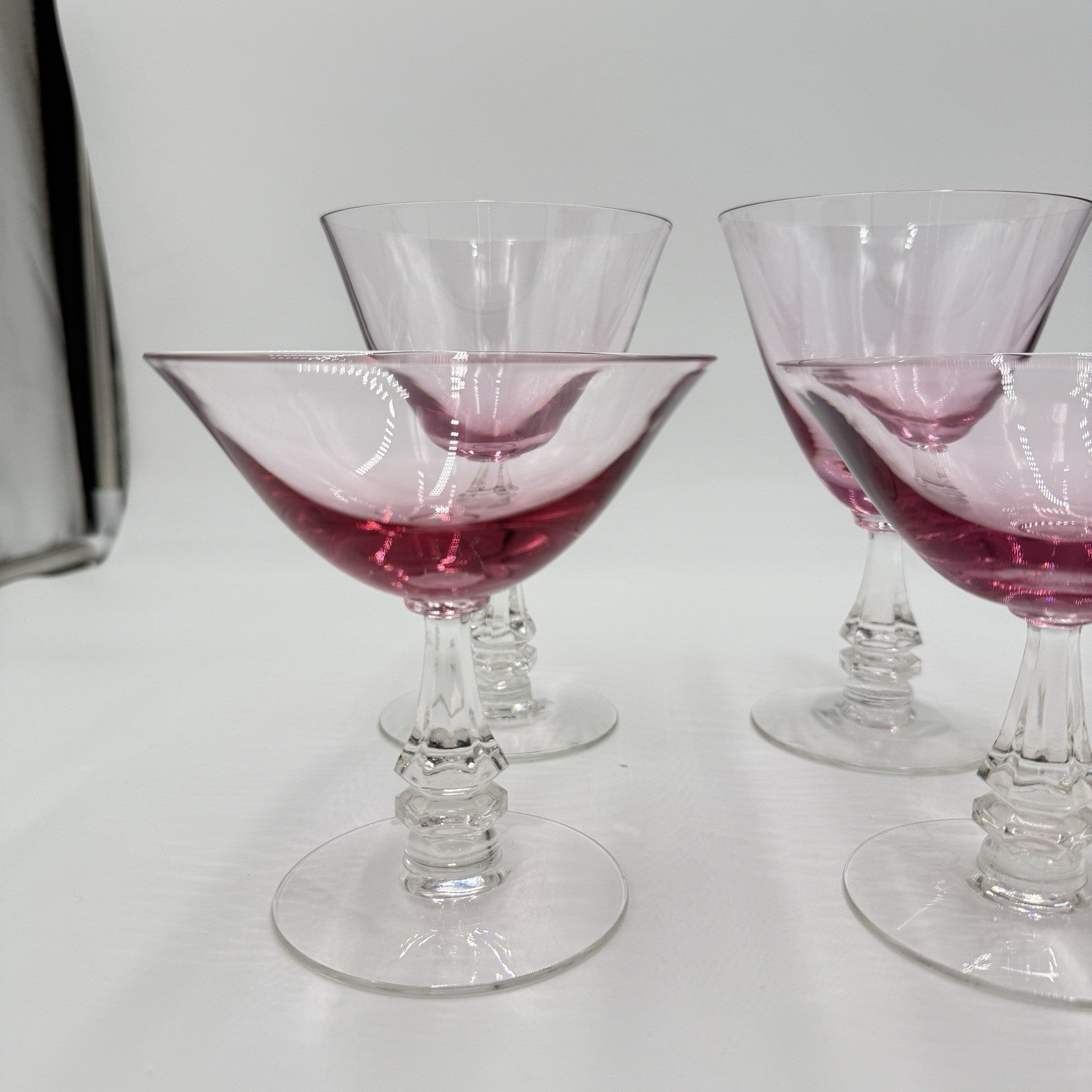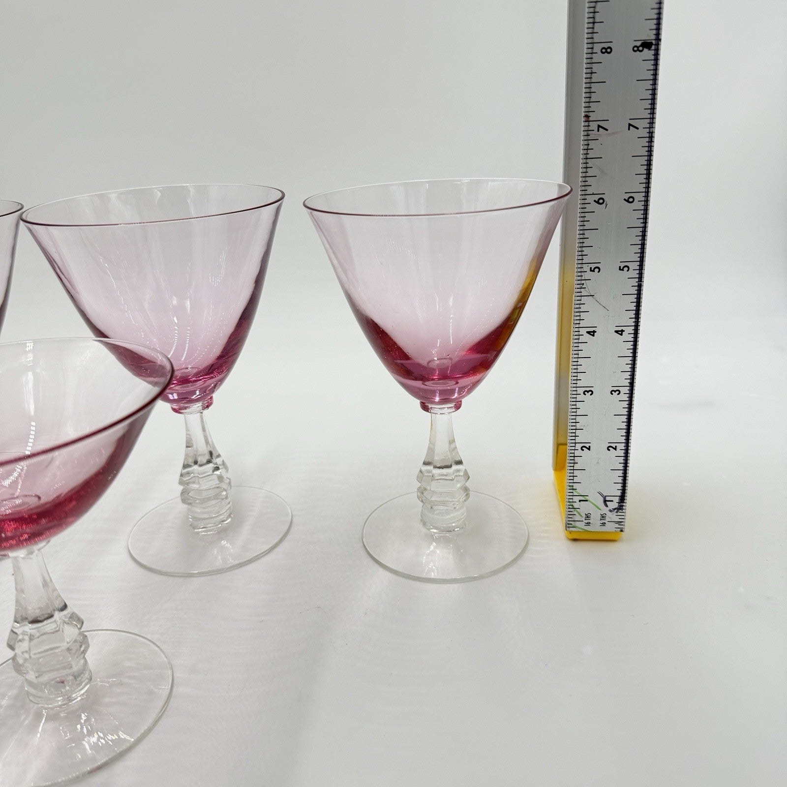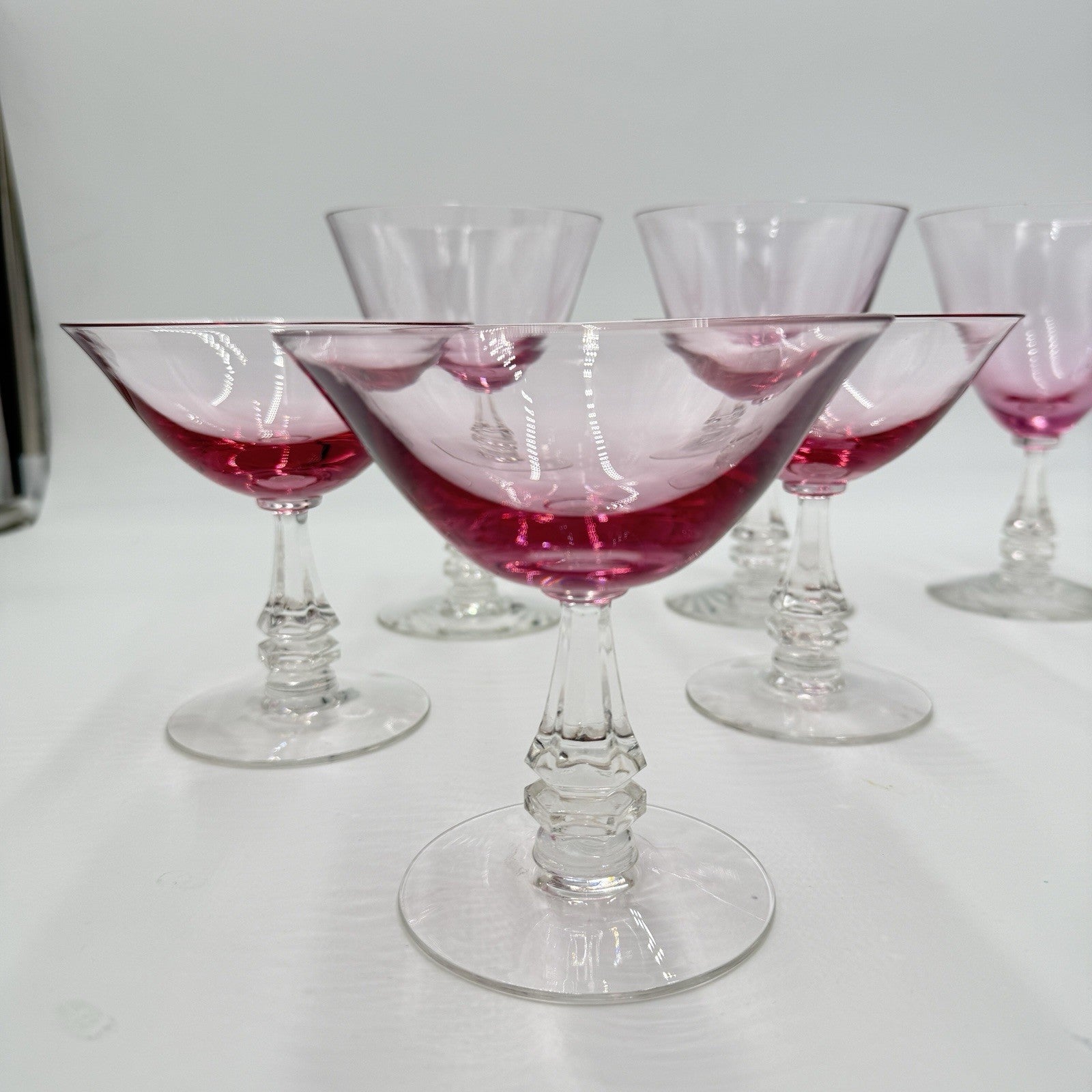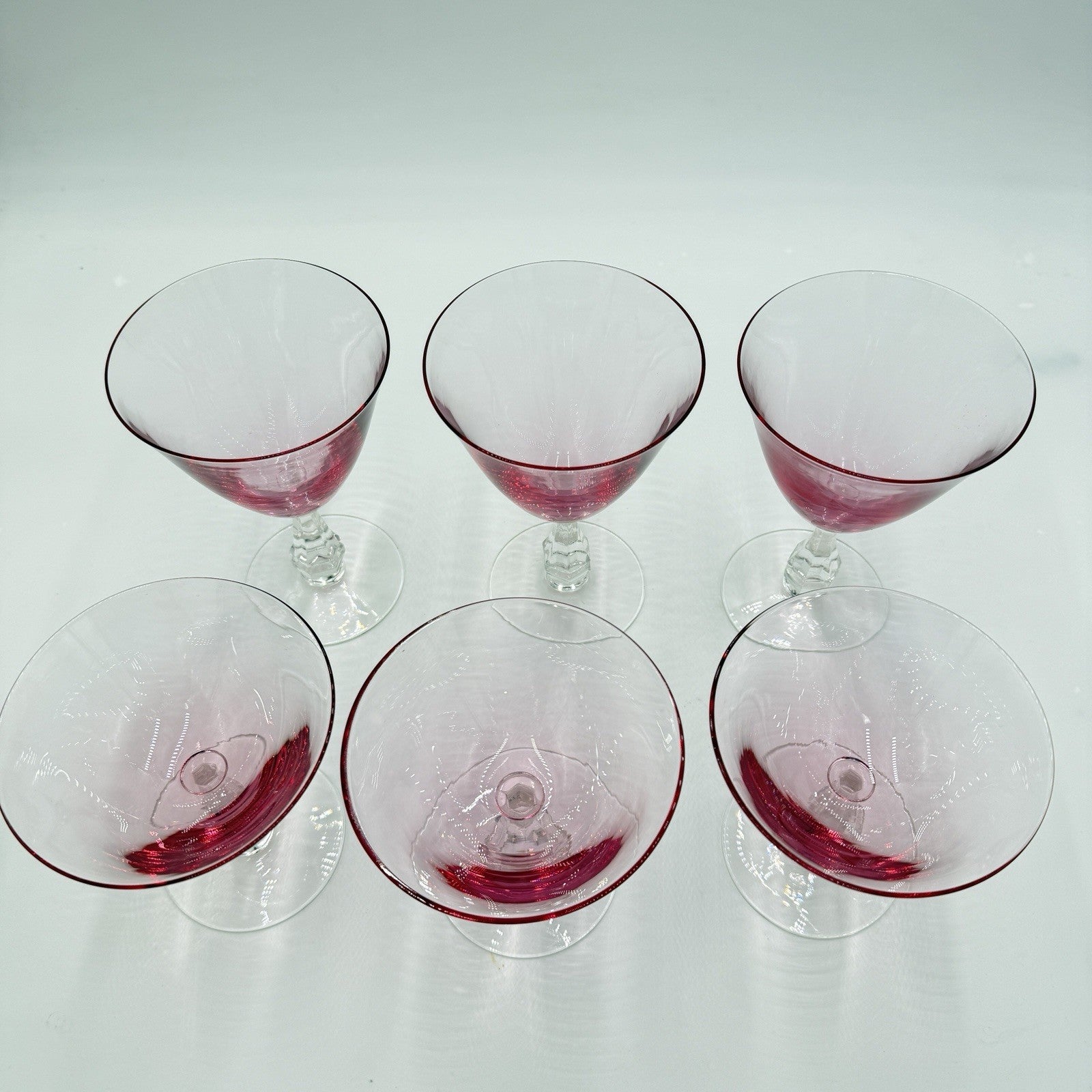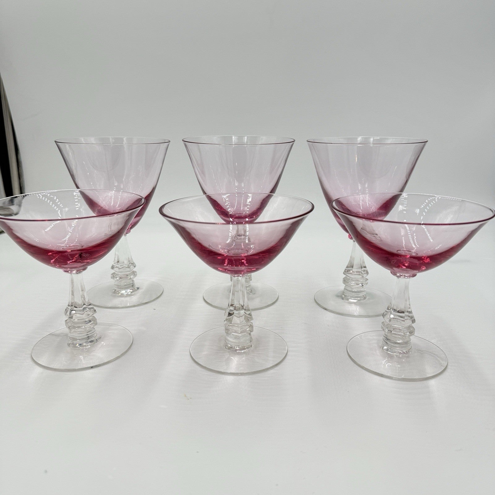 This elegant glass set from Tiffin Franciscan, produced in the 1950s, features a beautiful Wistaria Pink pattern with six pieces in total, including three wine glasses and three martini/dessert glasses. The glasses are hand-blown and have a glossy finish, making them perfect for all occasions.