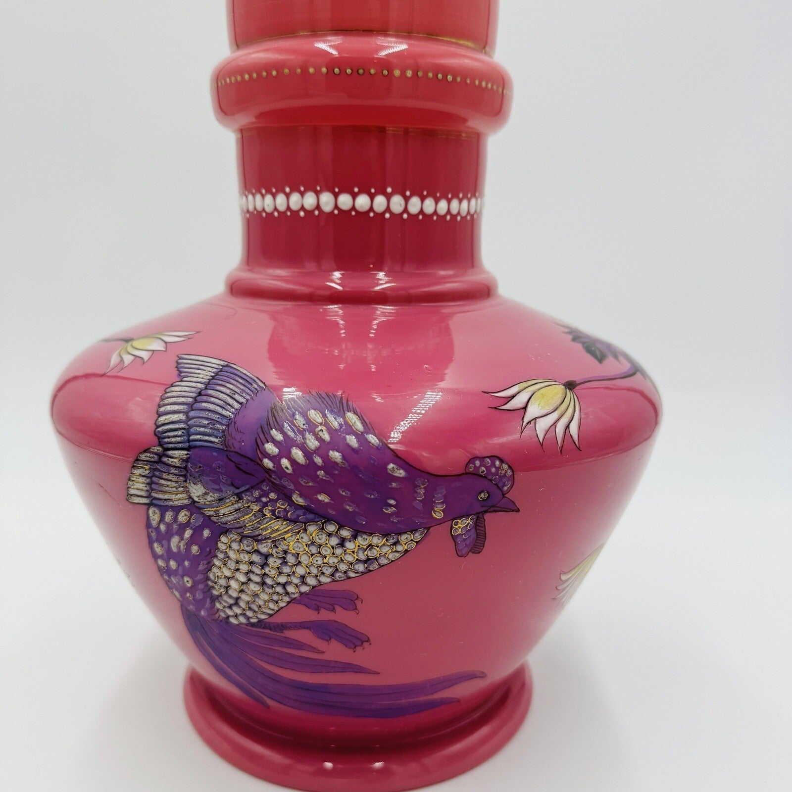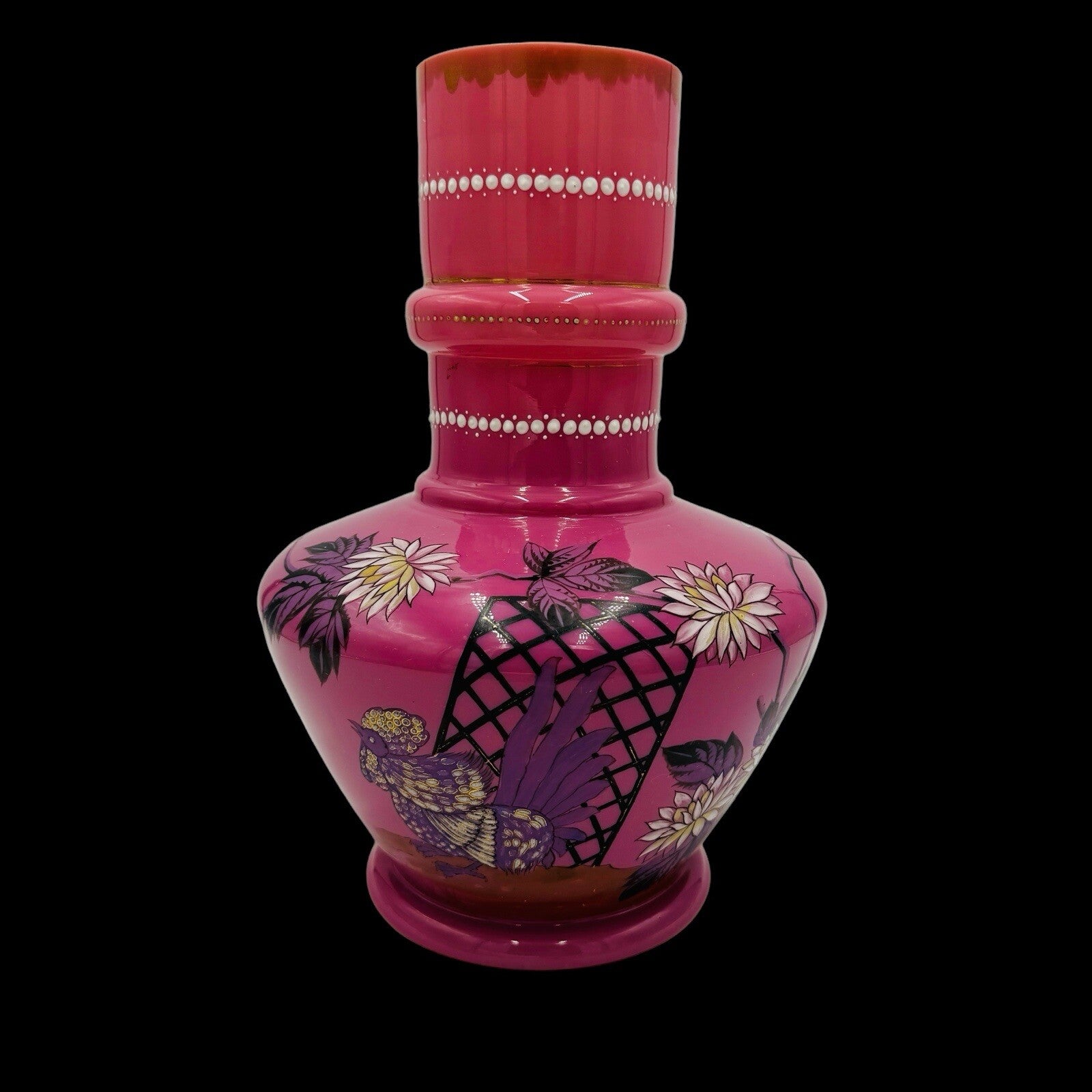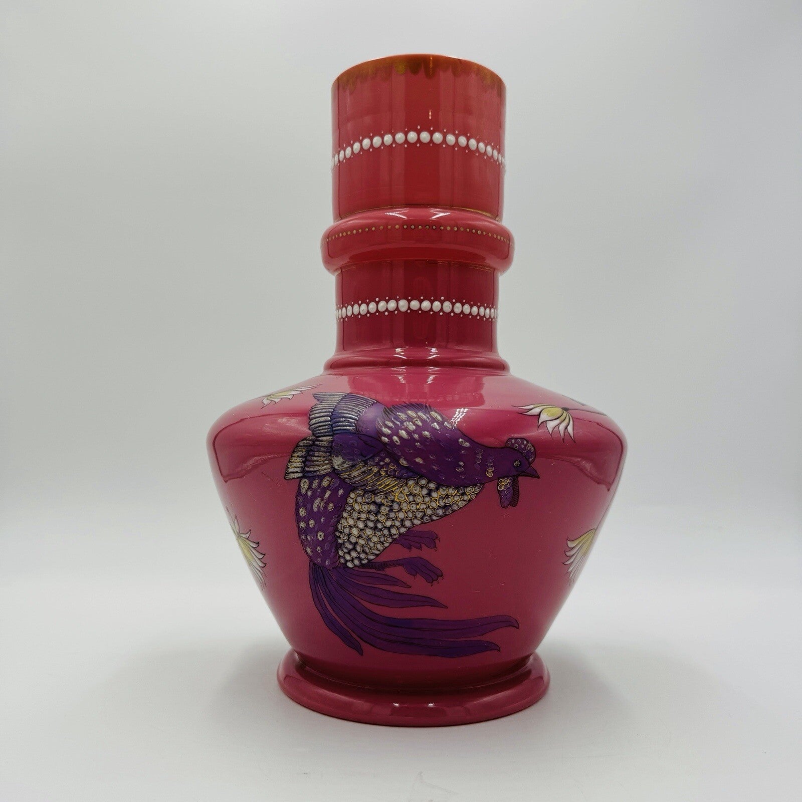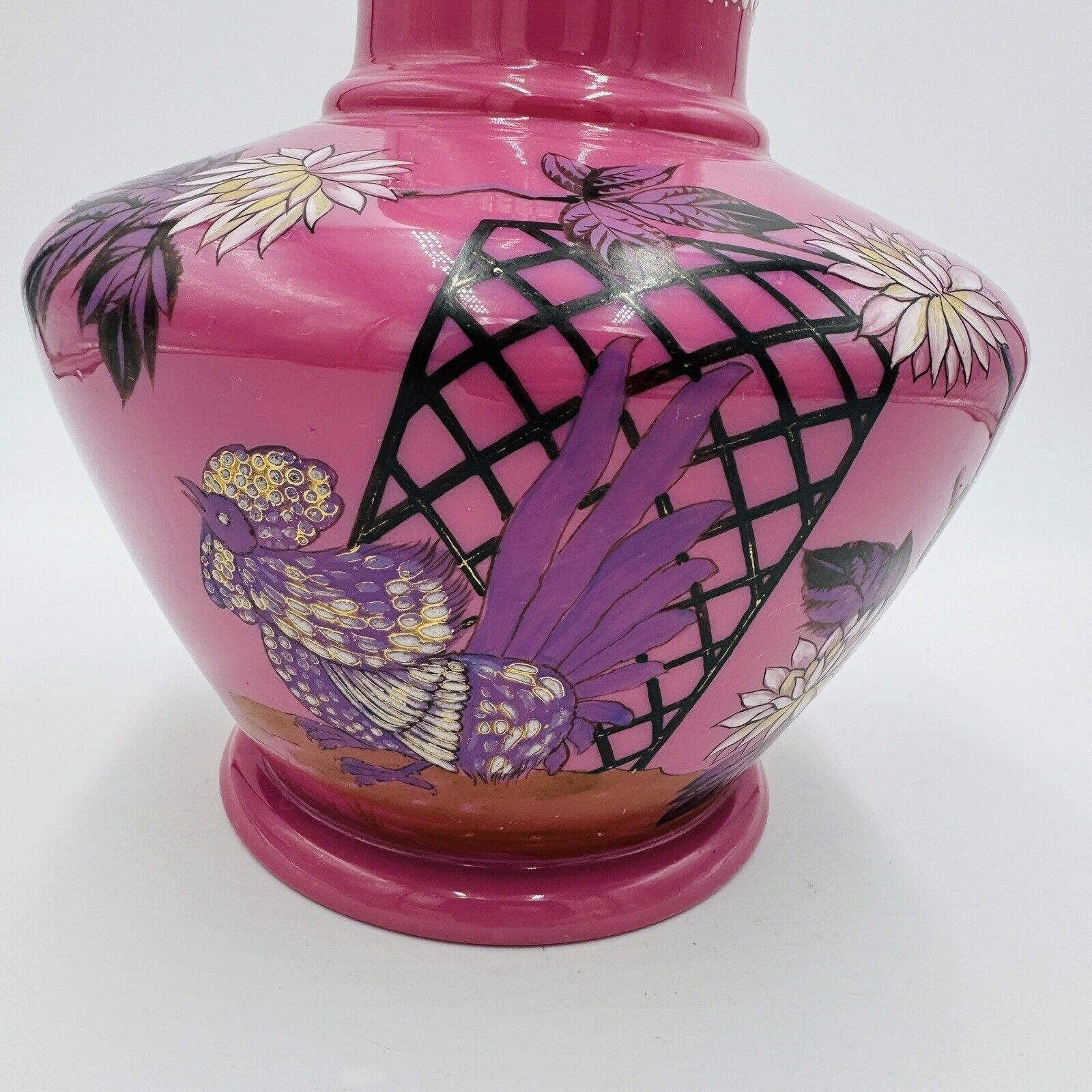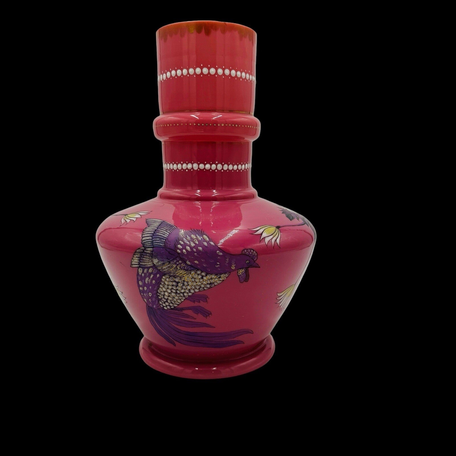 This large, round vase features a beautiful abstract pattern with roosters and daisies enameled painted. The antique Victorian pink opaline glass material is hand-painted with a glossy finish, making it a rare and unique addition to any collection. The vase stands at 12.5 inches tall and is perfect for all occasions, adding a touch of elegance to any room. The brand is Antique Victorian Pink Opaline Glass and it is an original piece from the 1950s. This vase is perfect for adults who appreciate the Victorian style and theme of roosters and flowers.