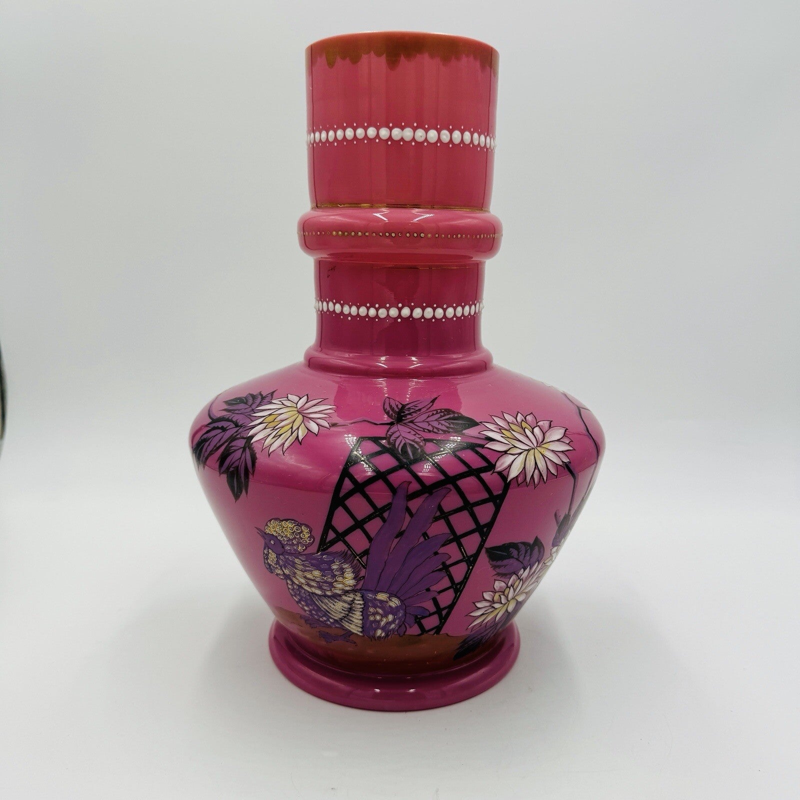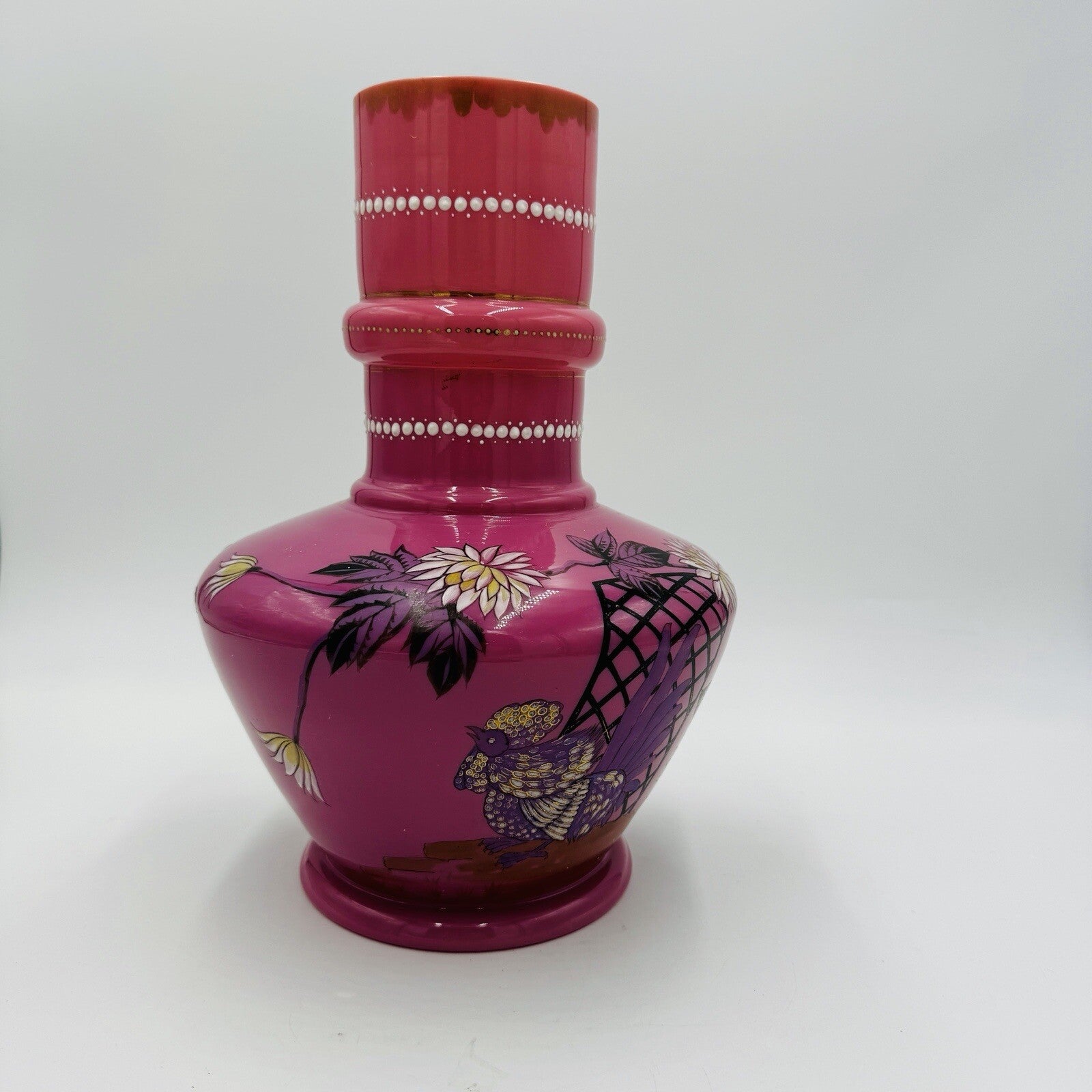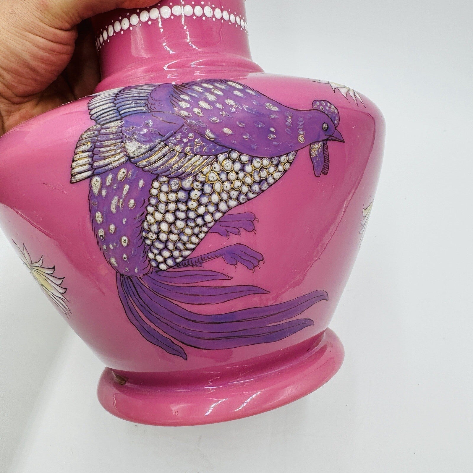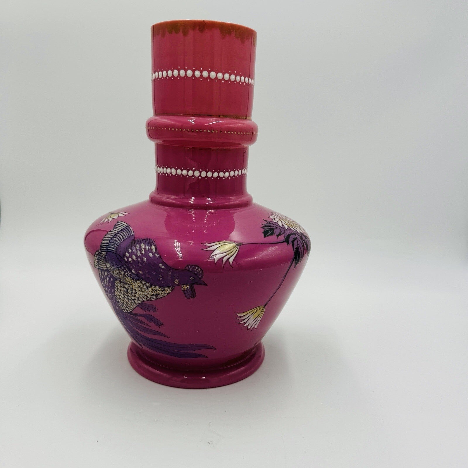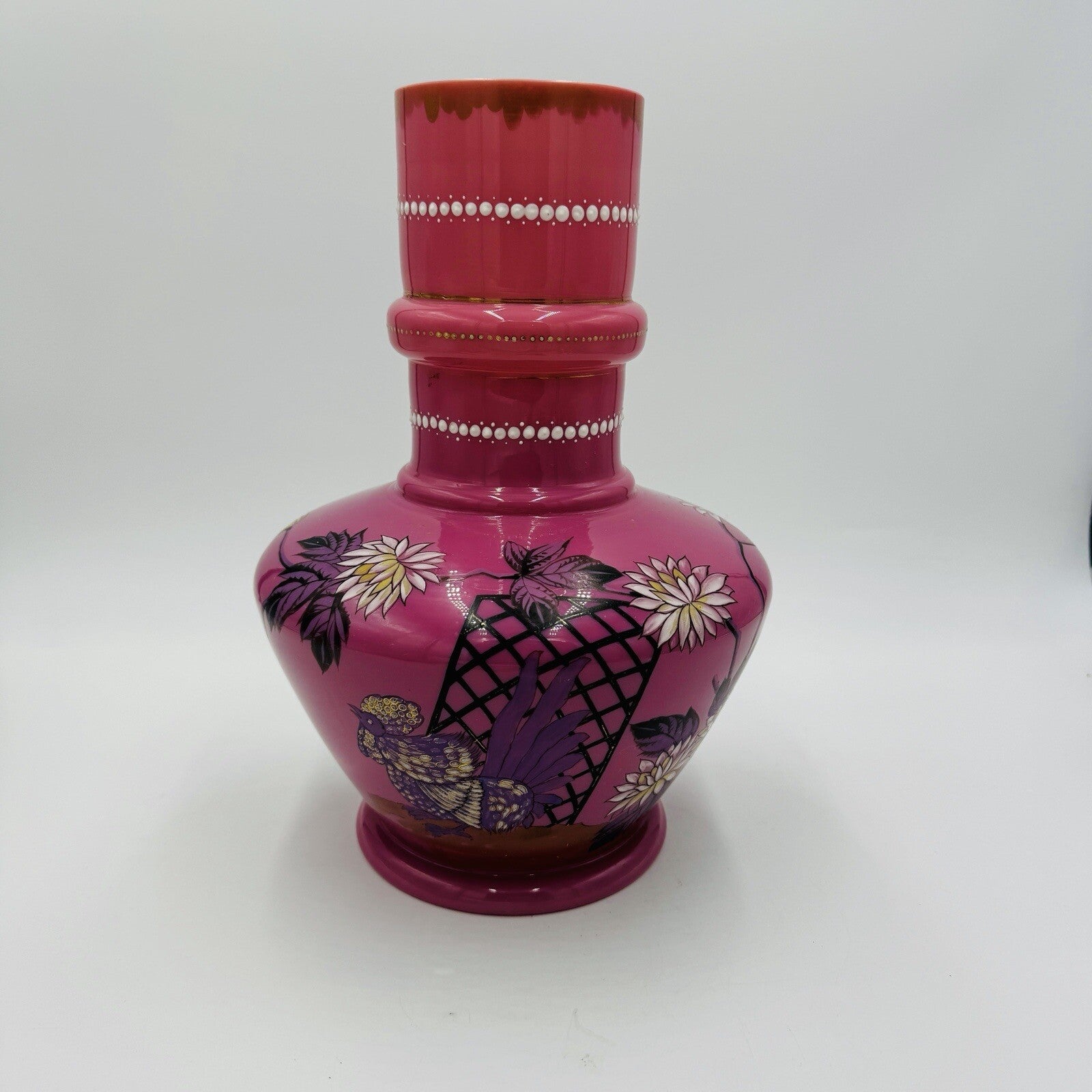 This large, round vase features a beautiful abstract pattern with roosters and daisies enameled painted. The antique Victorian pink opaline glass material is hand-painted with a glossy finish, making it a rare and unique addition to any collection. The vase stands at 12.5 inches tall and is perfect for all occasions, adding a touch of elegance to any room. The brand is Antique Victorian Pink Opaline Glass and it is an original piece from the 1950s. This vase is perfect for adults who appreciate the Victorian style and theme of roosters and flowers.