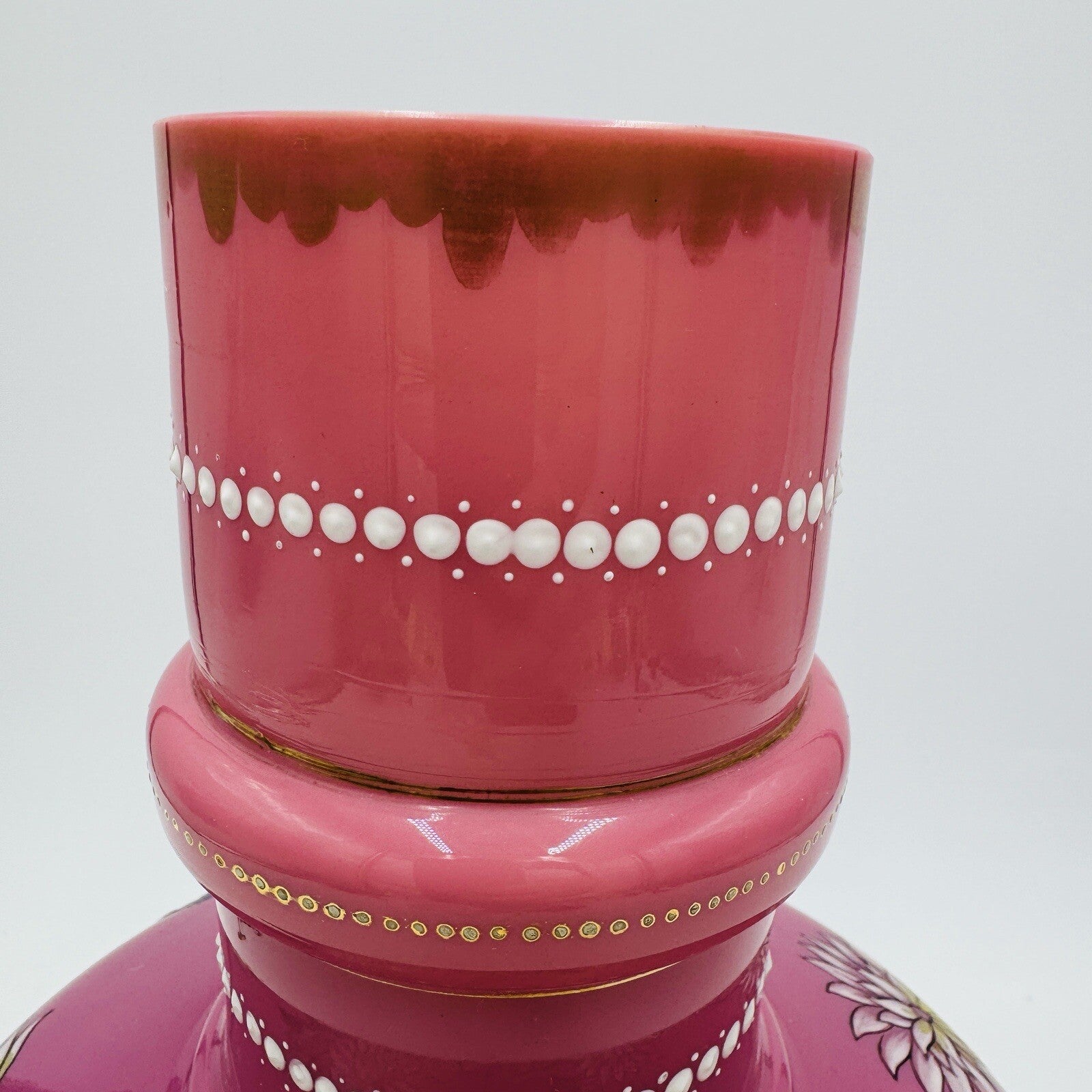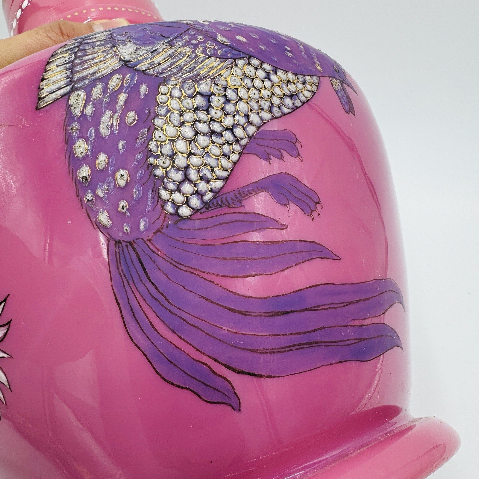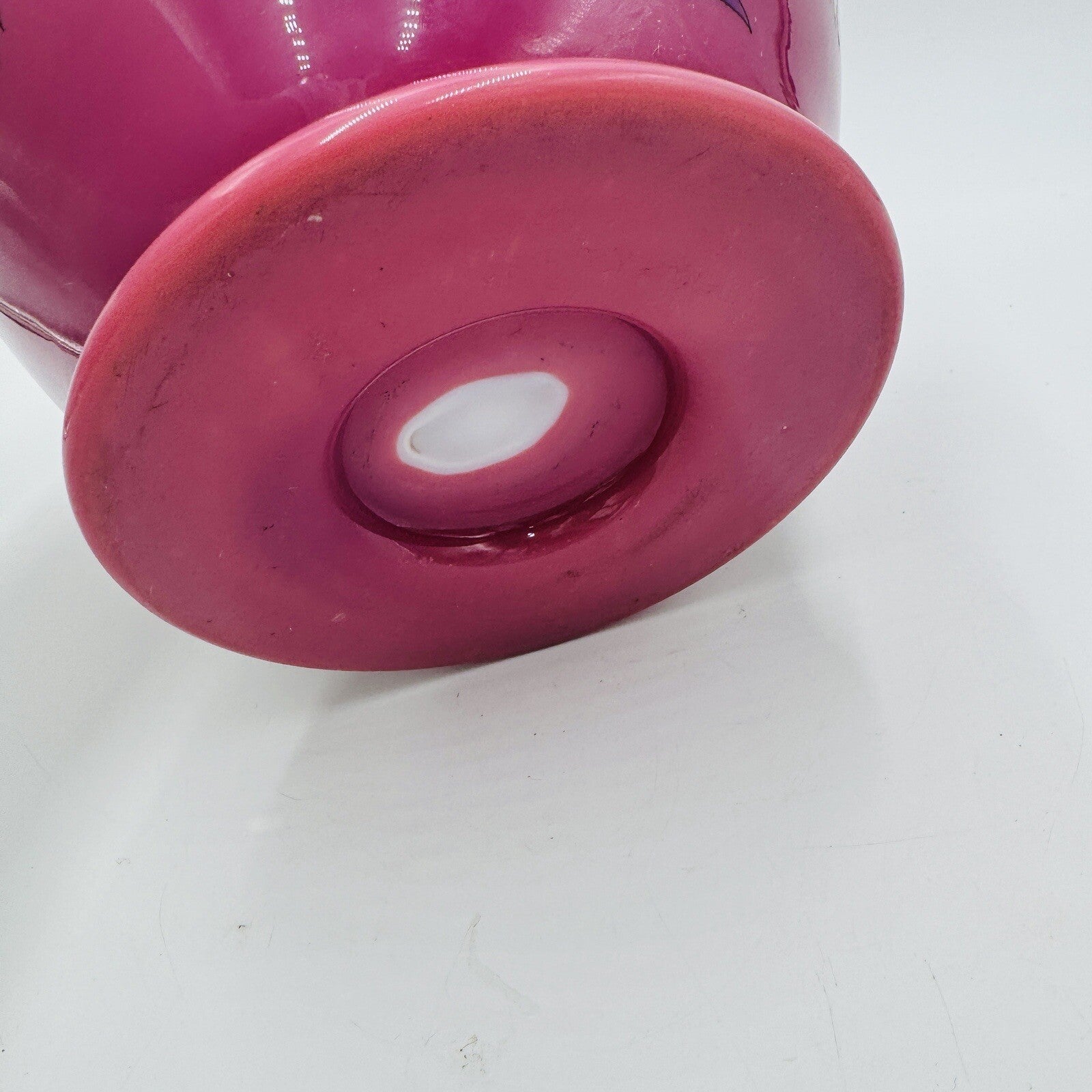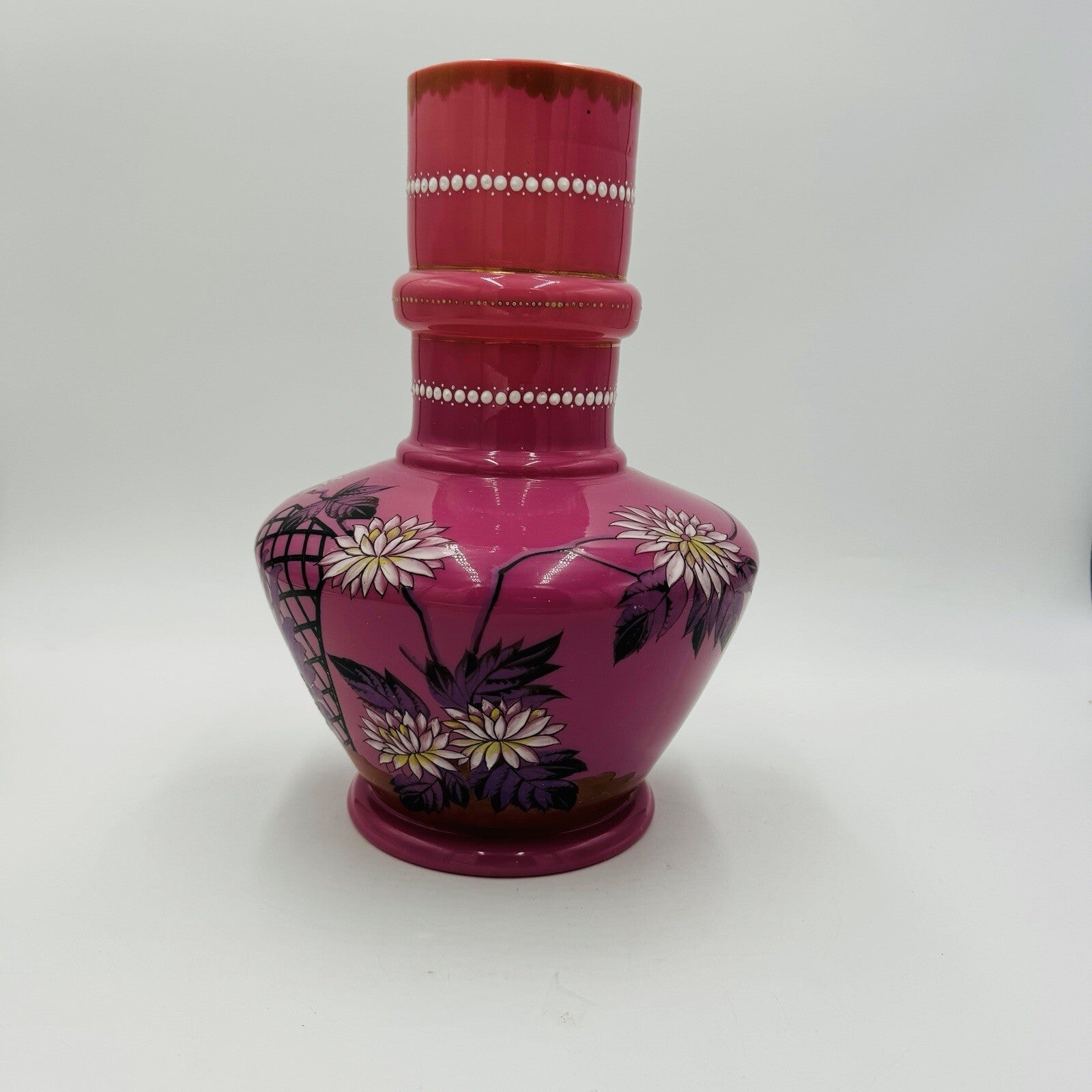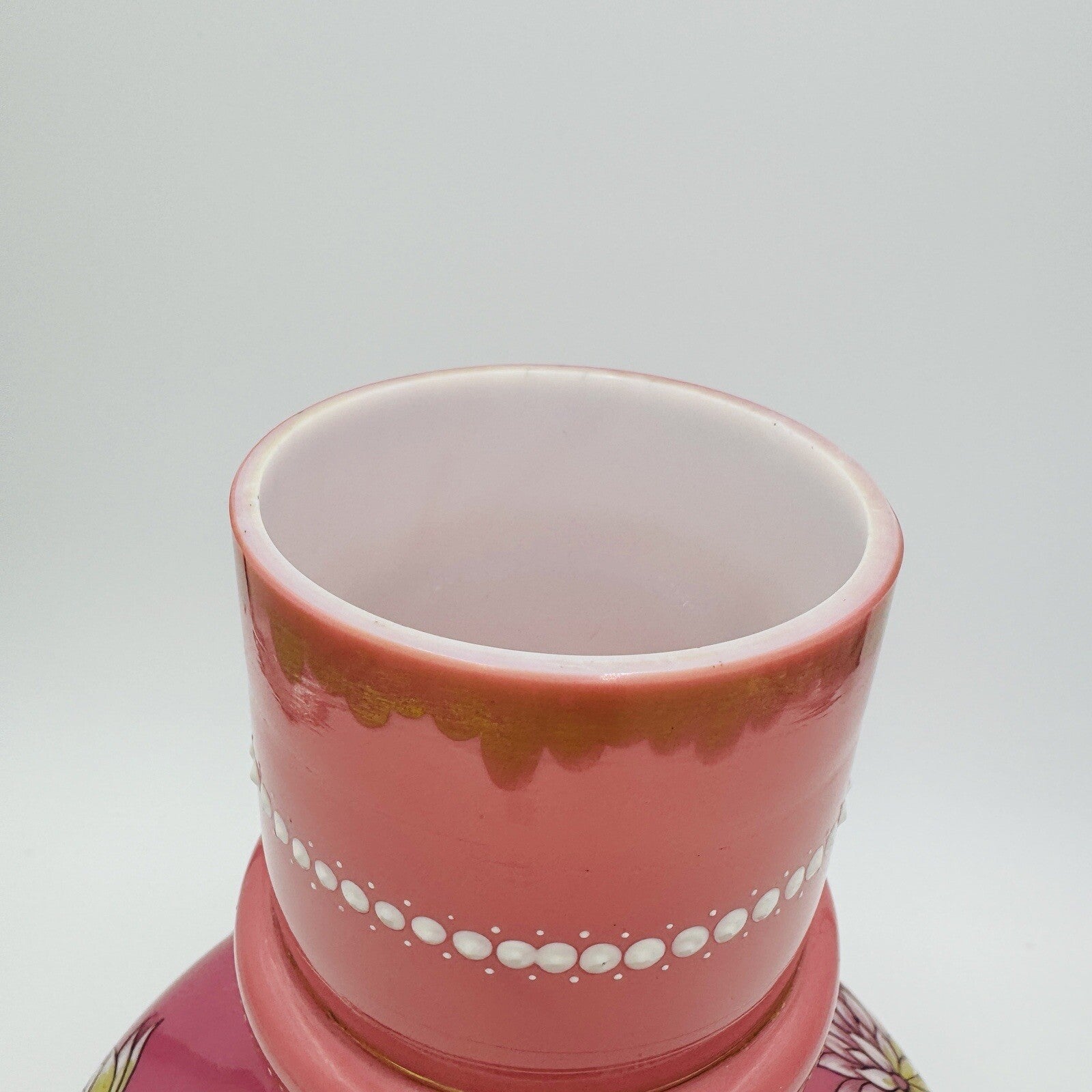 This large, round vase features a beautiful abstract pattern with roosters and daisies enameled painted. The antique Victorian pink opaline glass material is hand-painted with a glossy finish, making it a rare and unique addition to any collection. The vase stands at 12.5 inches tall and is perfect for all occasions, adding a touch of elegance to any room. The brand is Antique Victorian Pink Opaline Glass and it is an original piece from the 1950s. This vase is perfect for adults who appreciate the Victorian style and theme of roosters and flowers.
