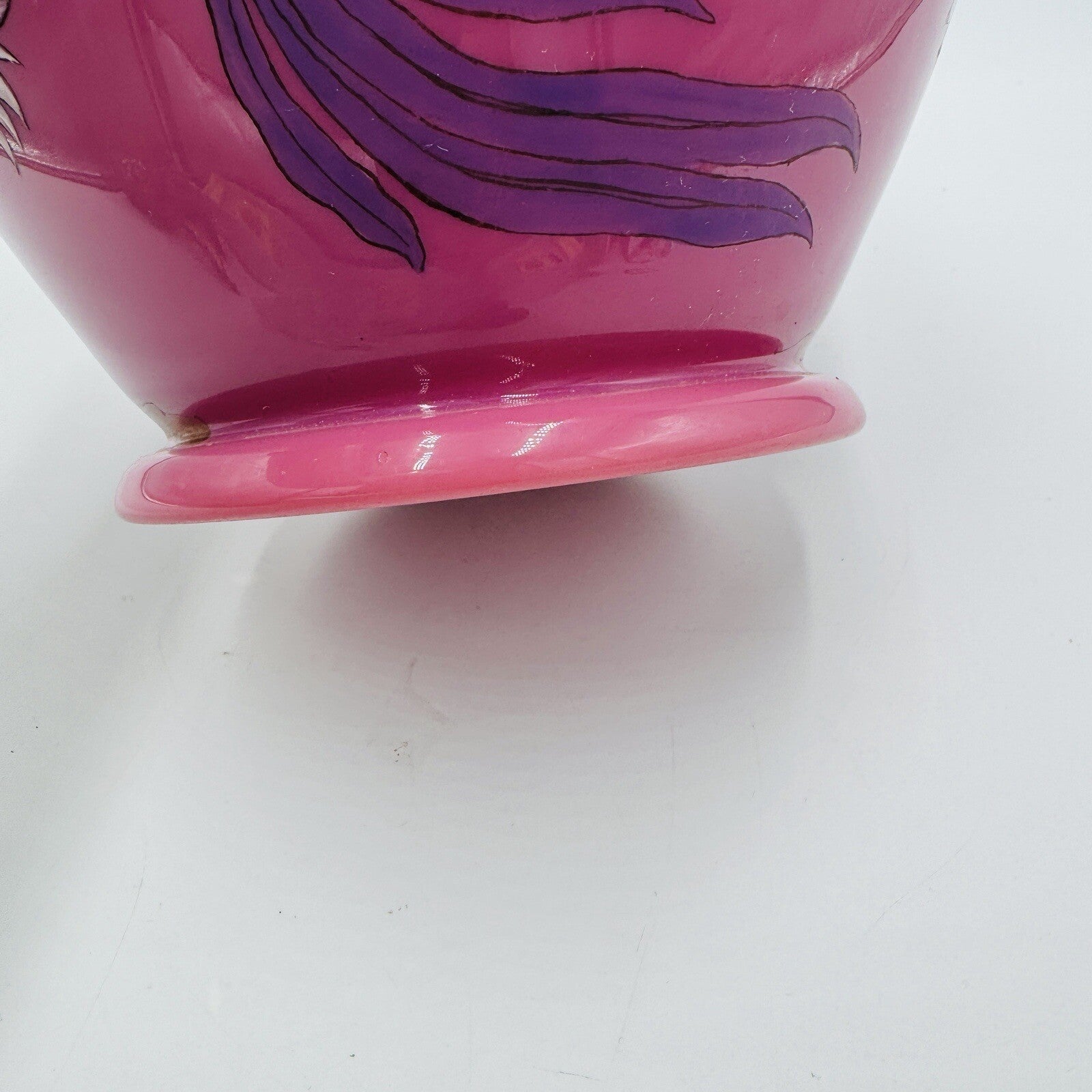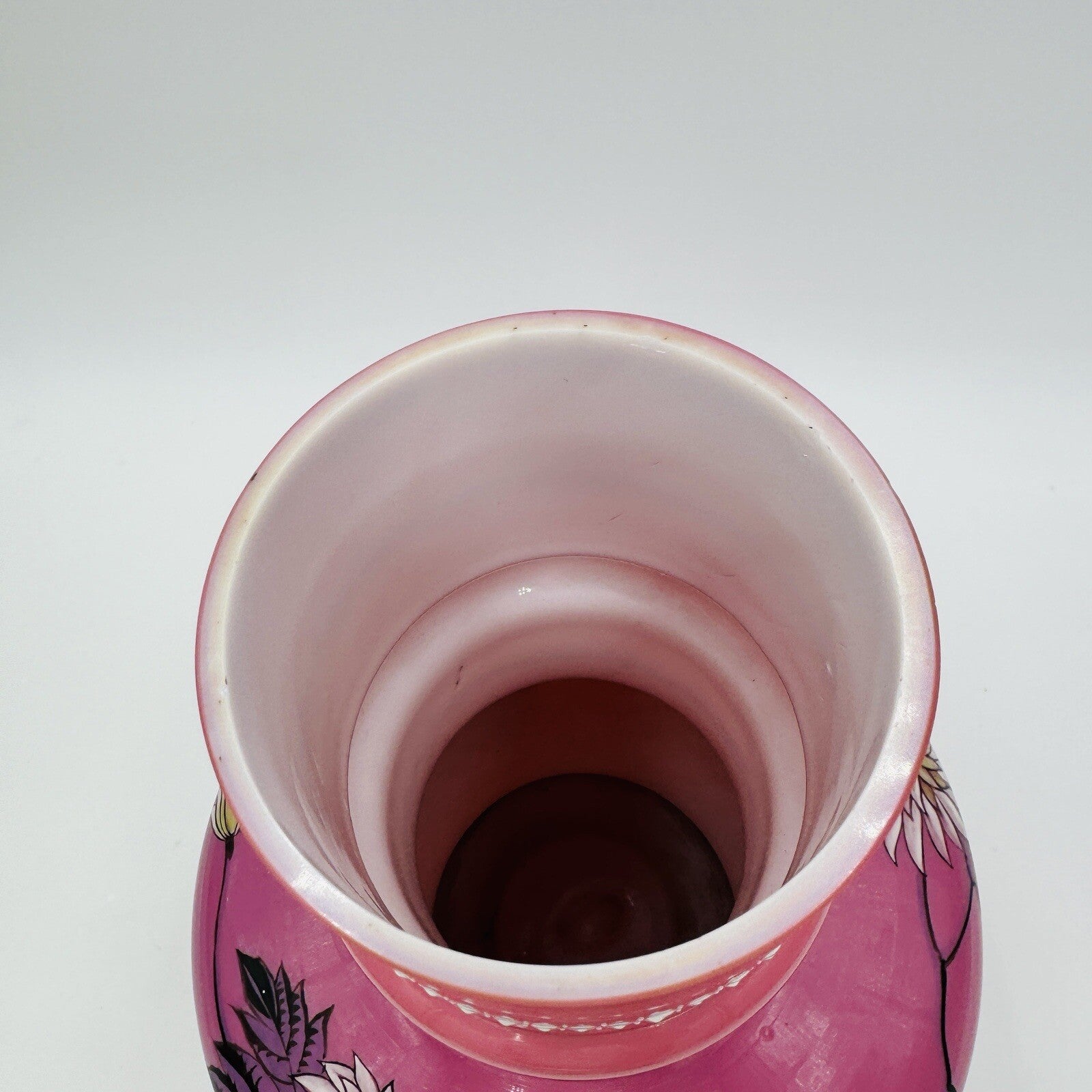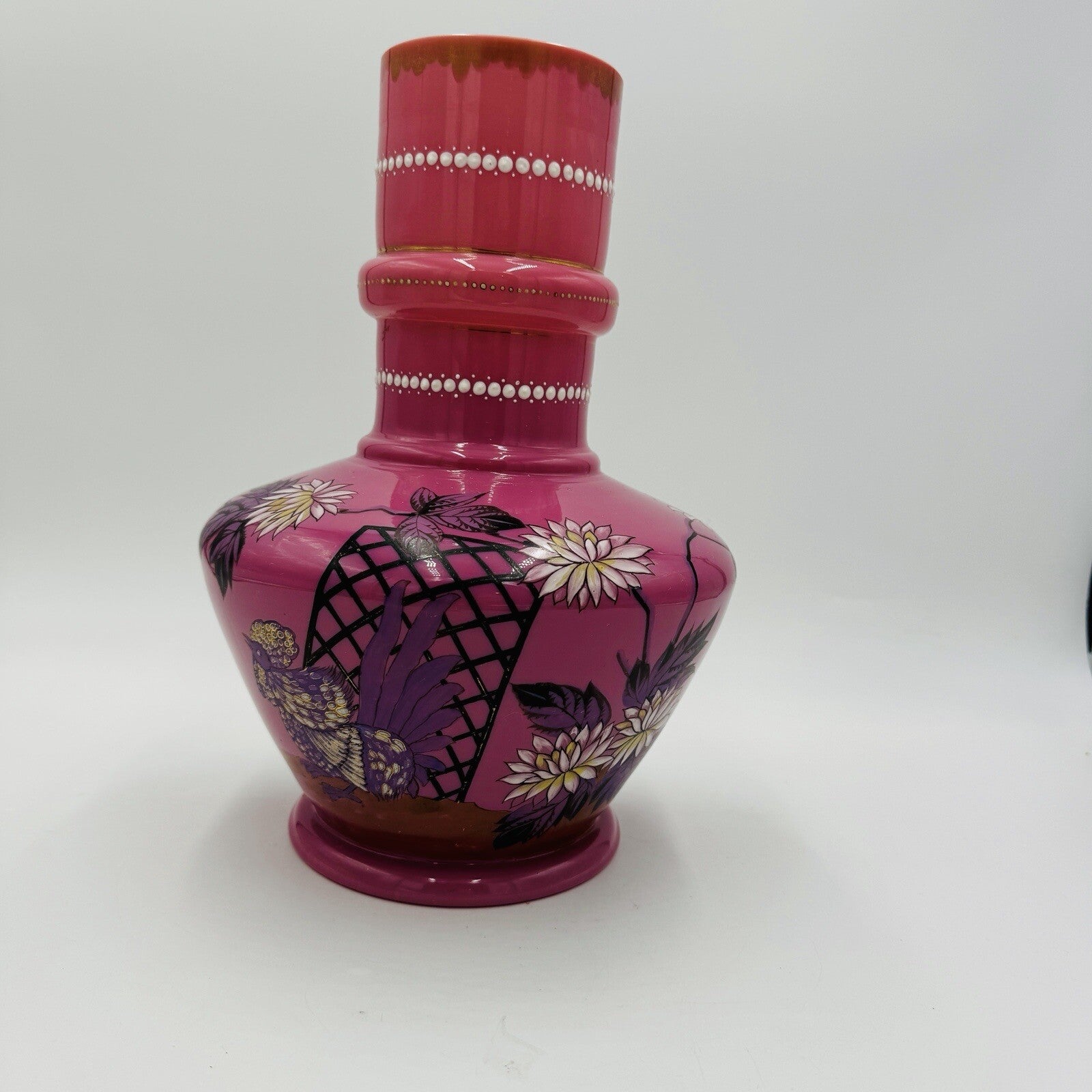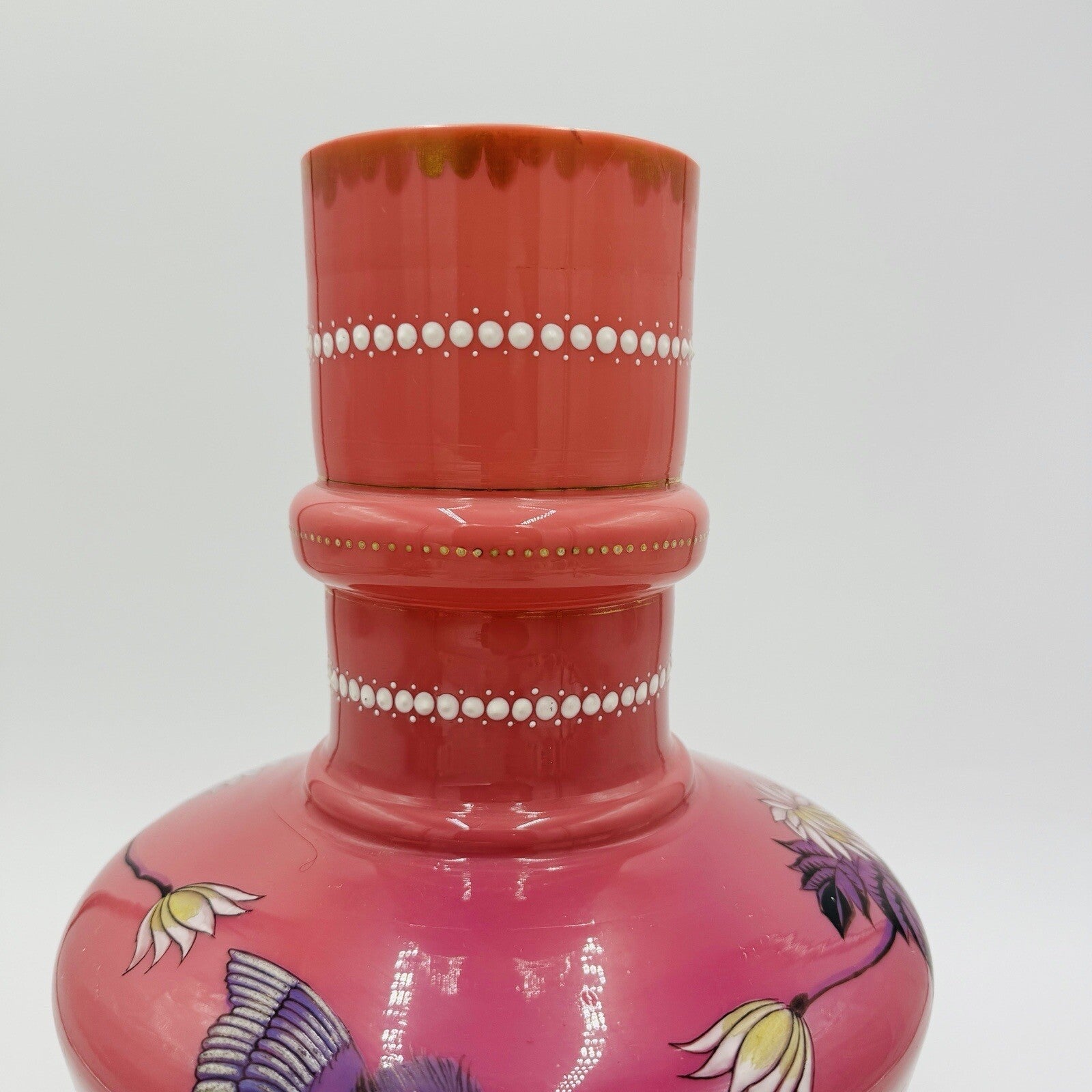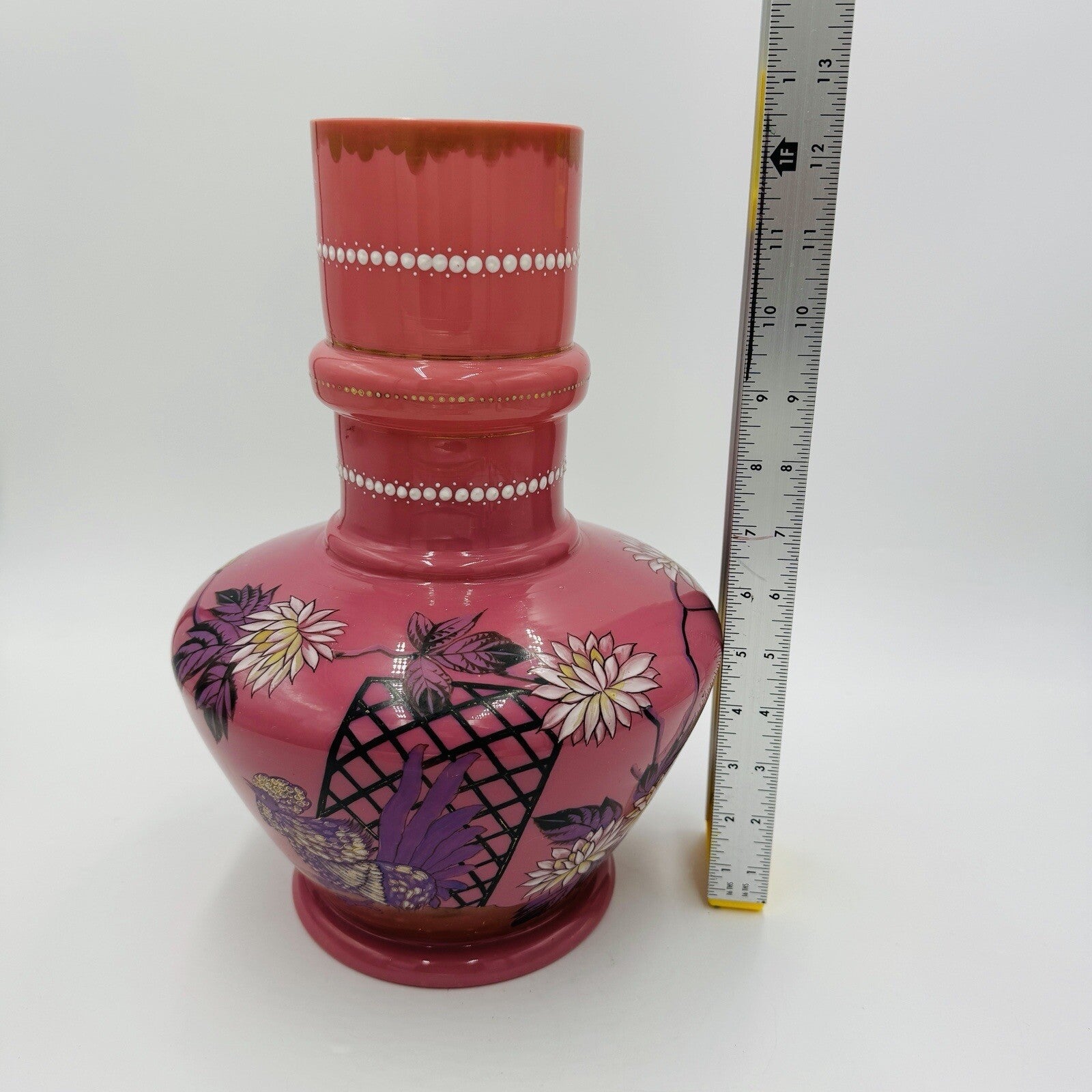 Victorian aesthetic pink opaline glass vase Roosters Fighting Daisies Large Rare