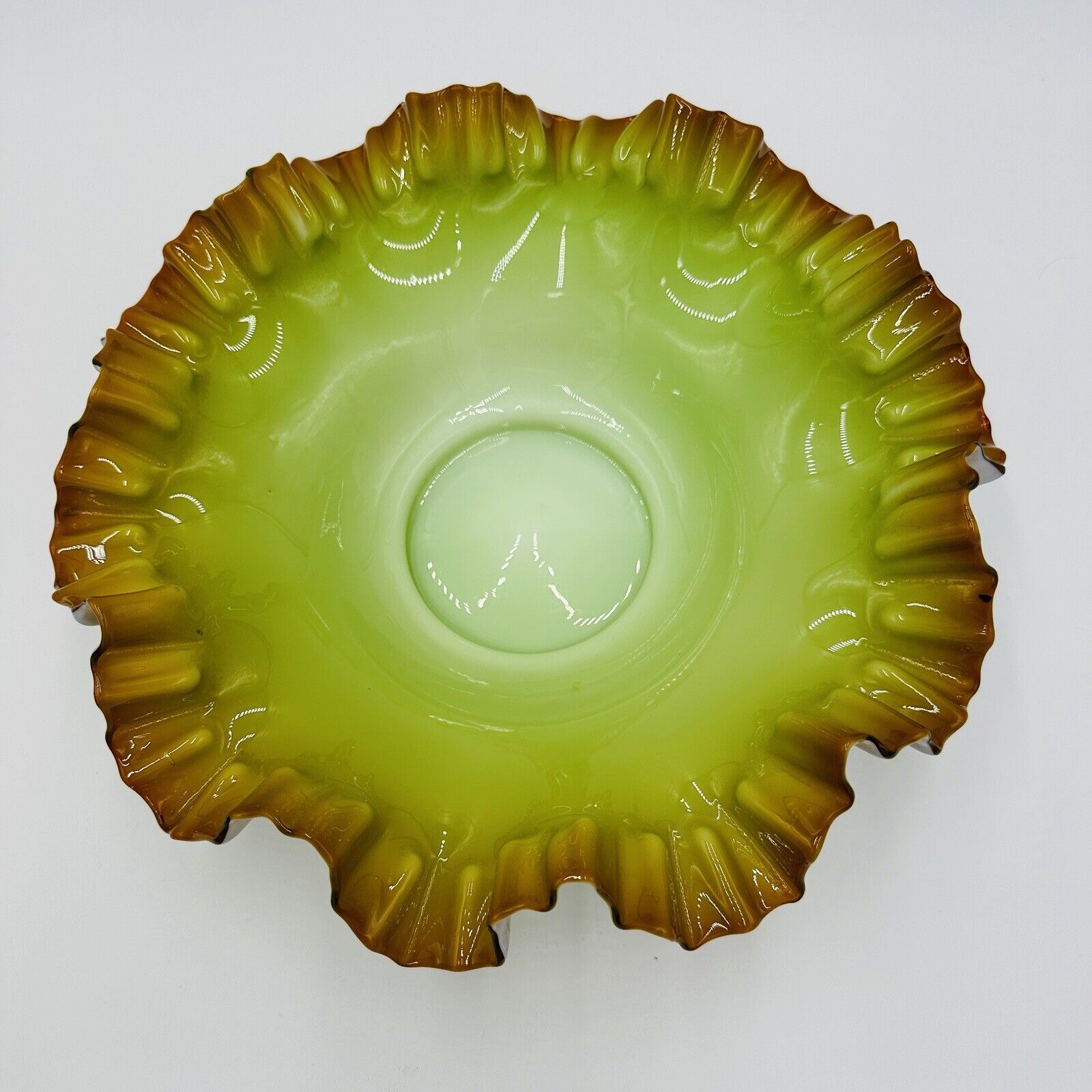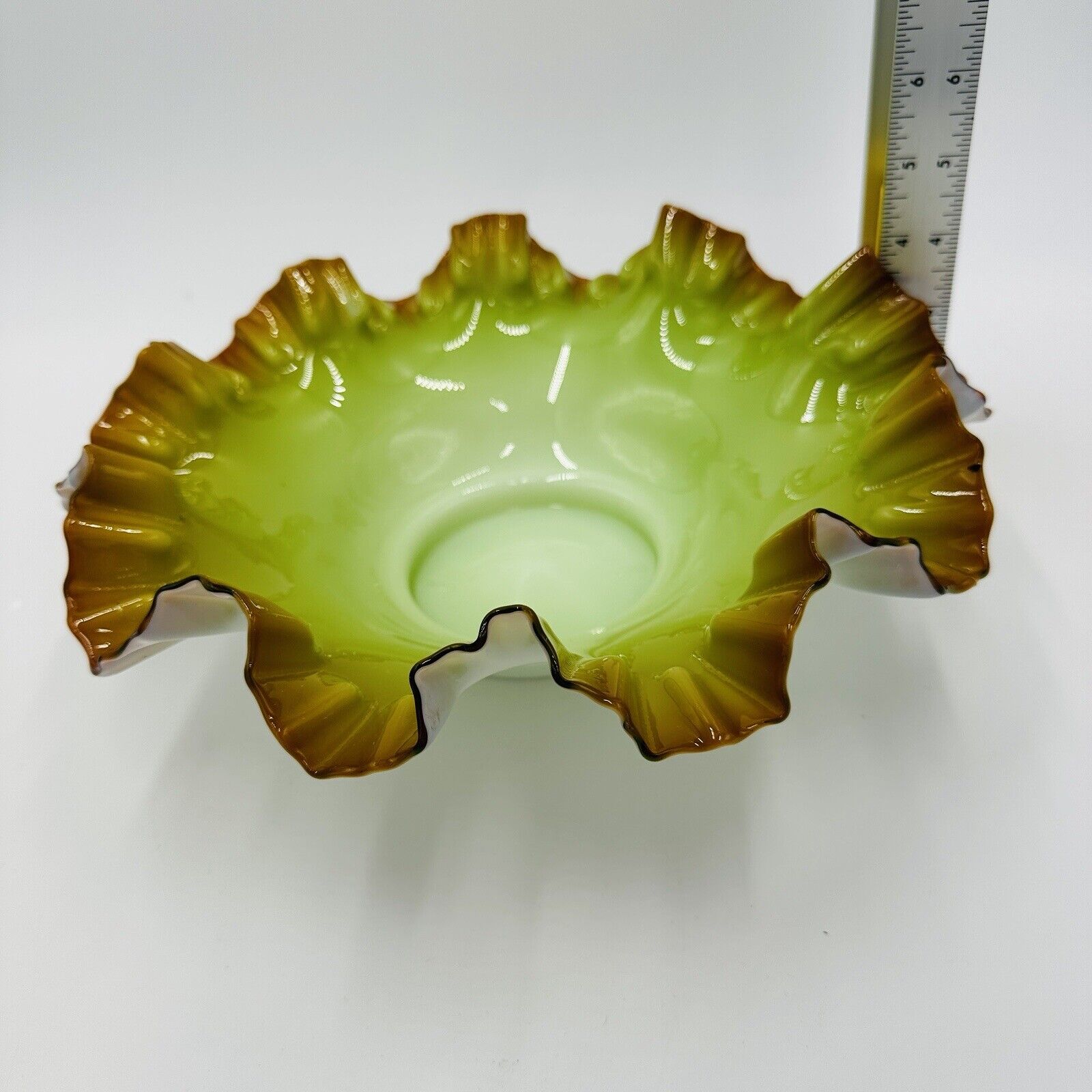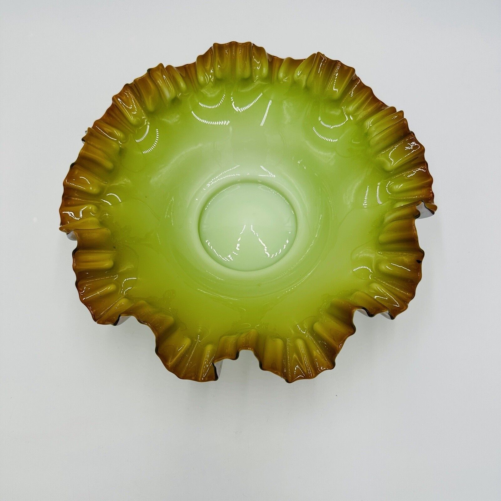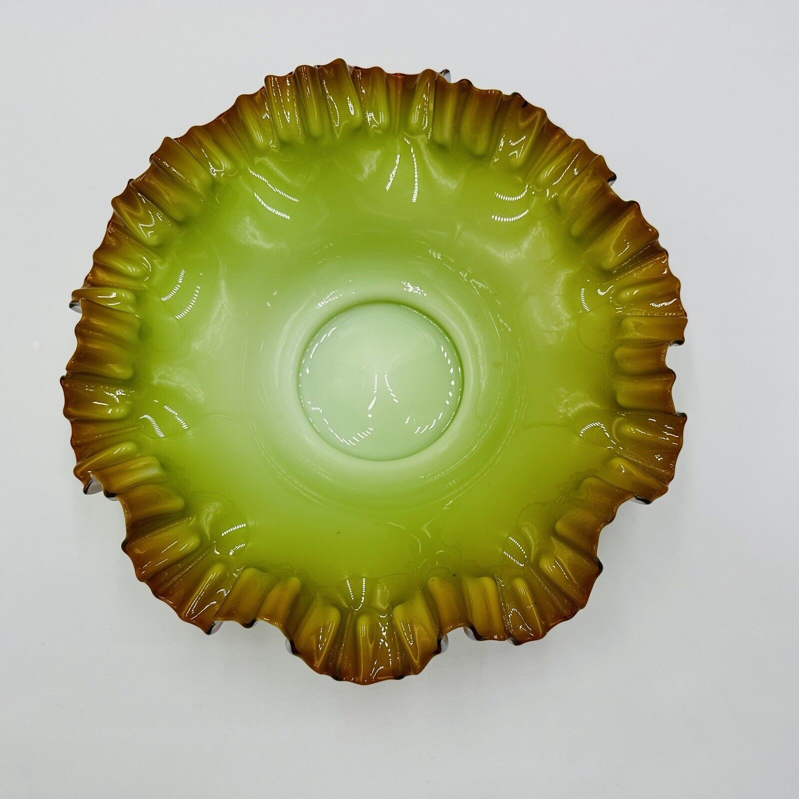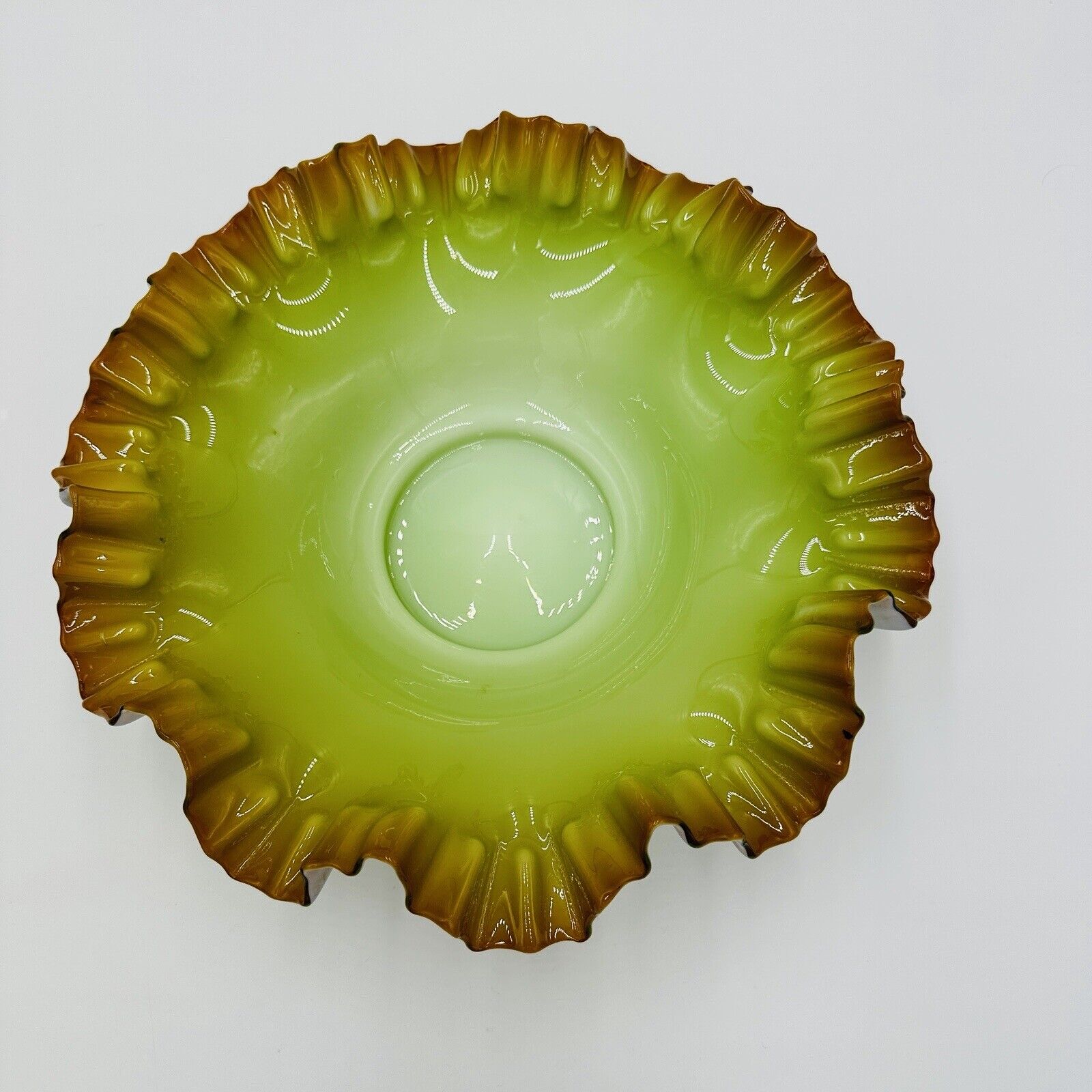 Victorian art glass Pistachio Green Cased Glass Ruffled Bowl W Ox Blood Red Rim.