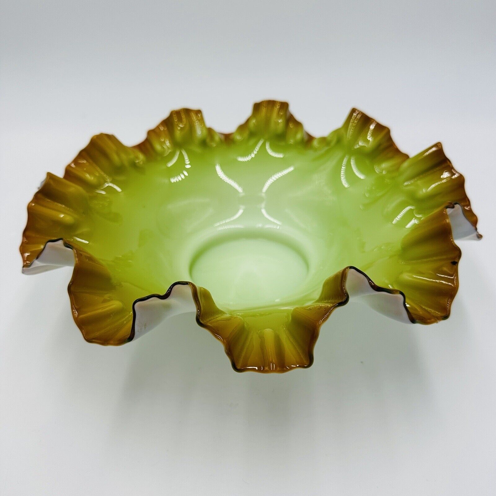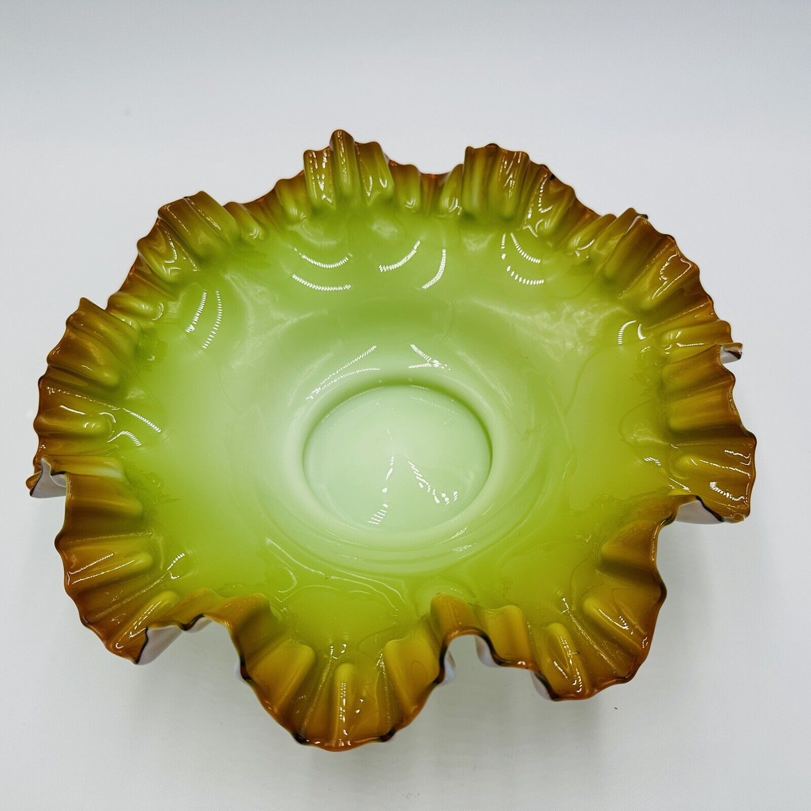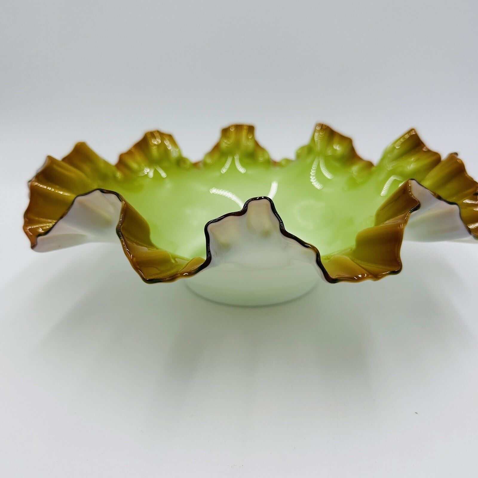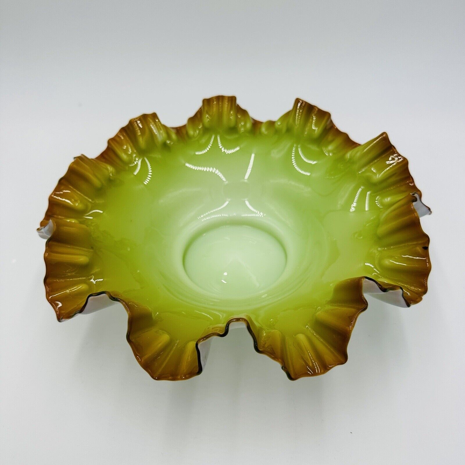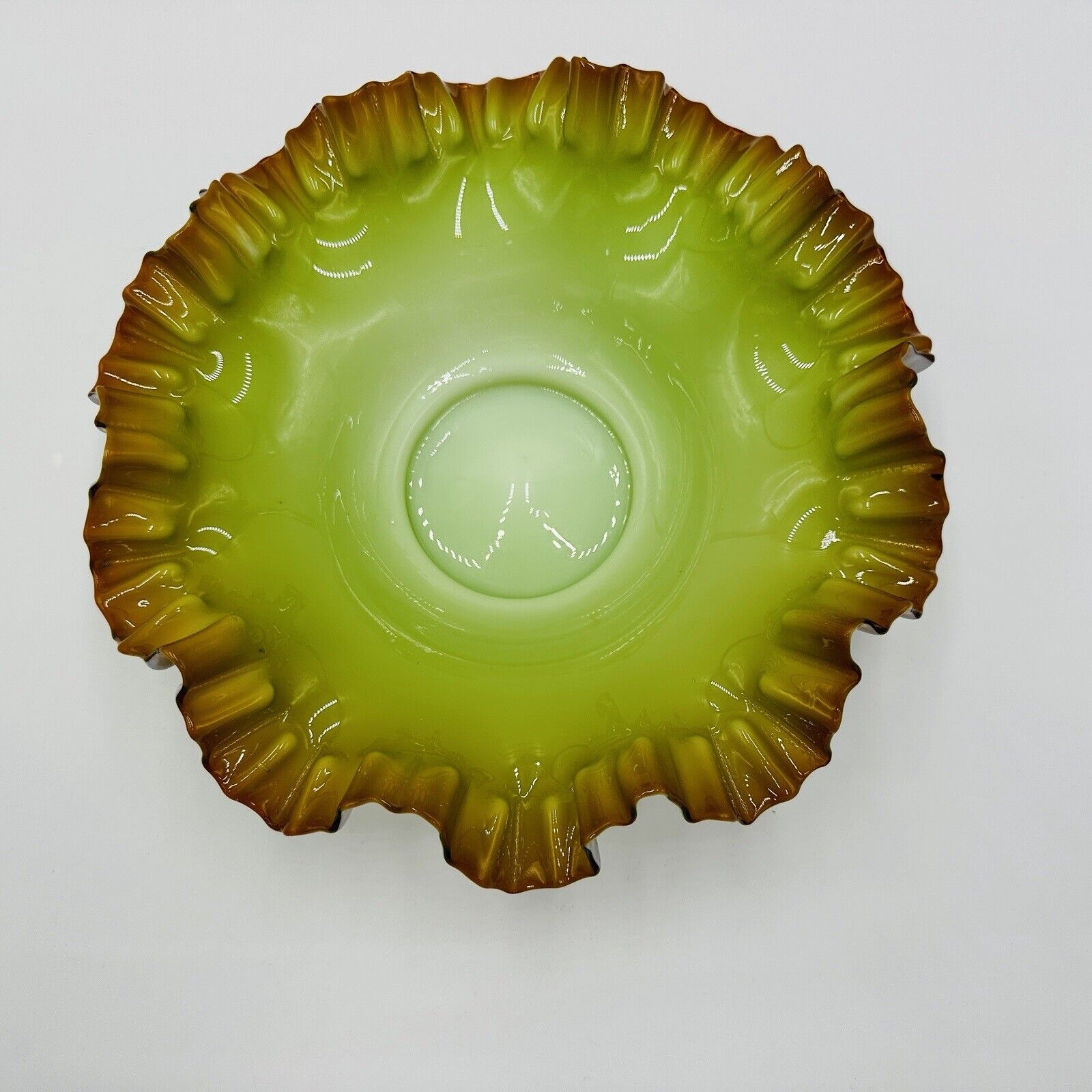 Victorian art glass Pistachio Green Cased Glass Ruffled Bowl W Ox Blood Red Rim.