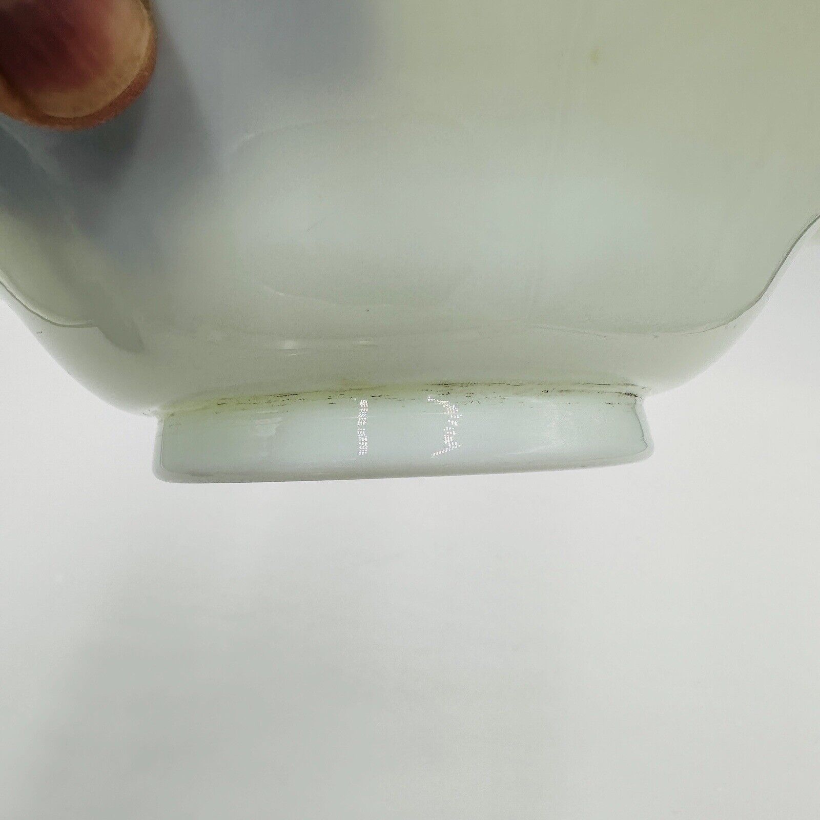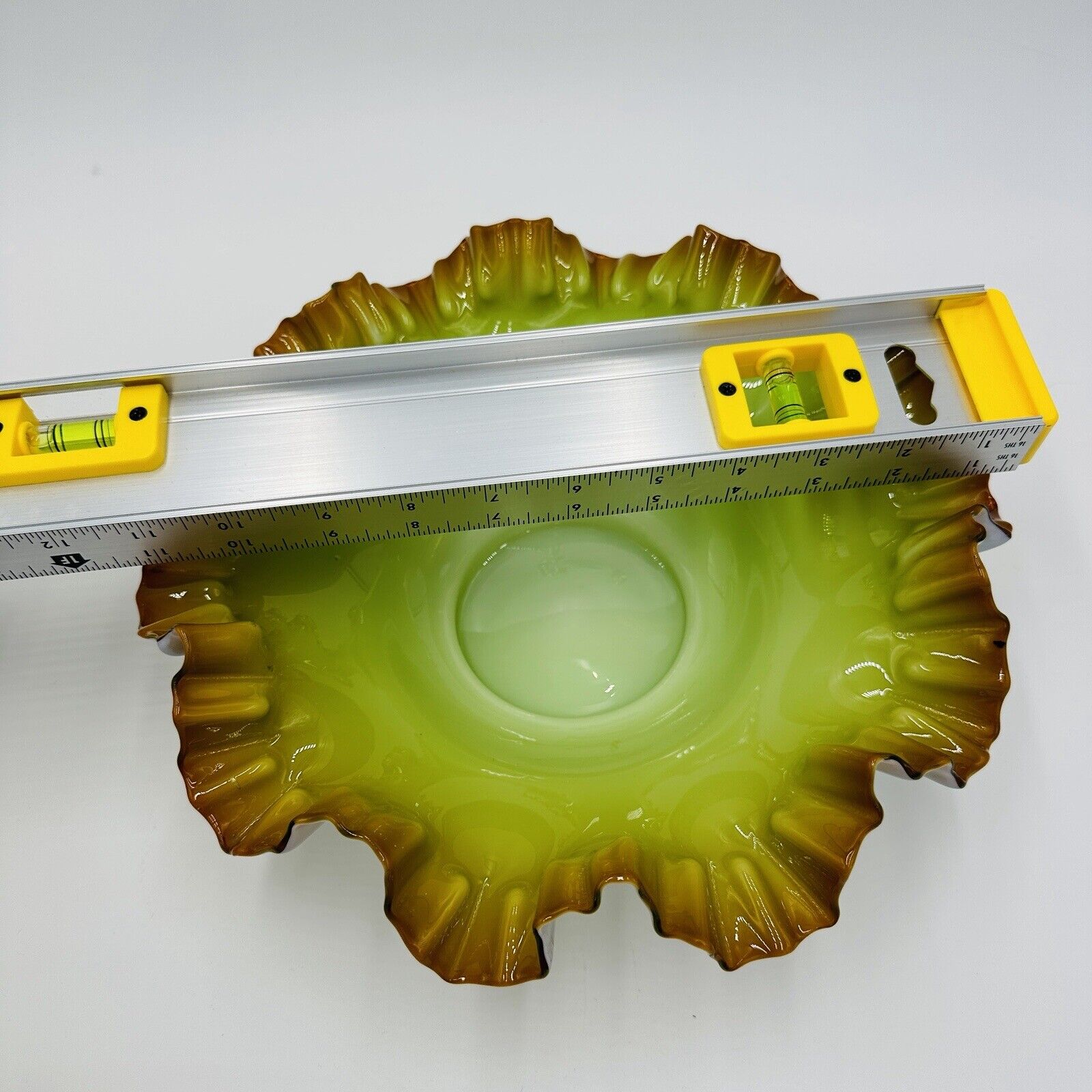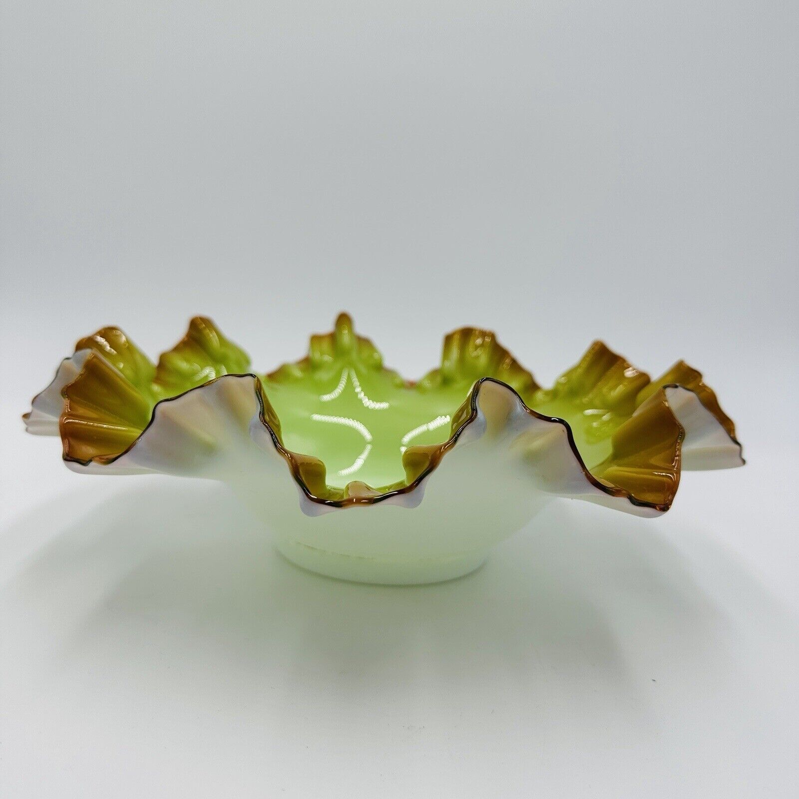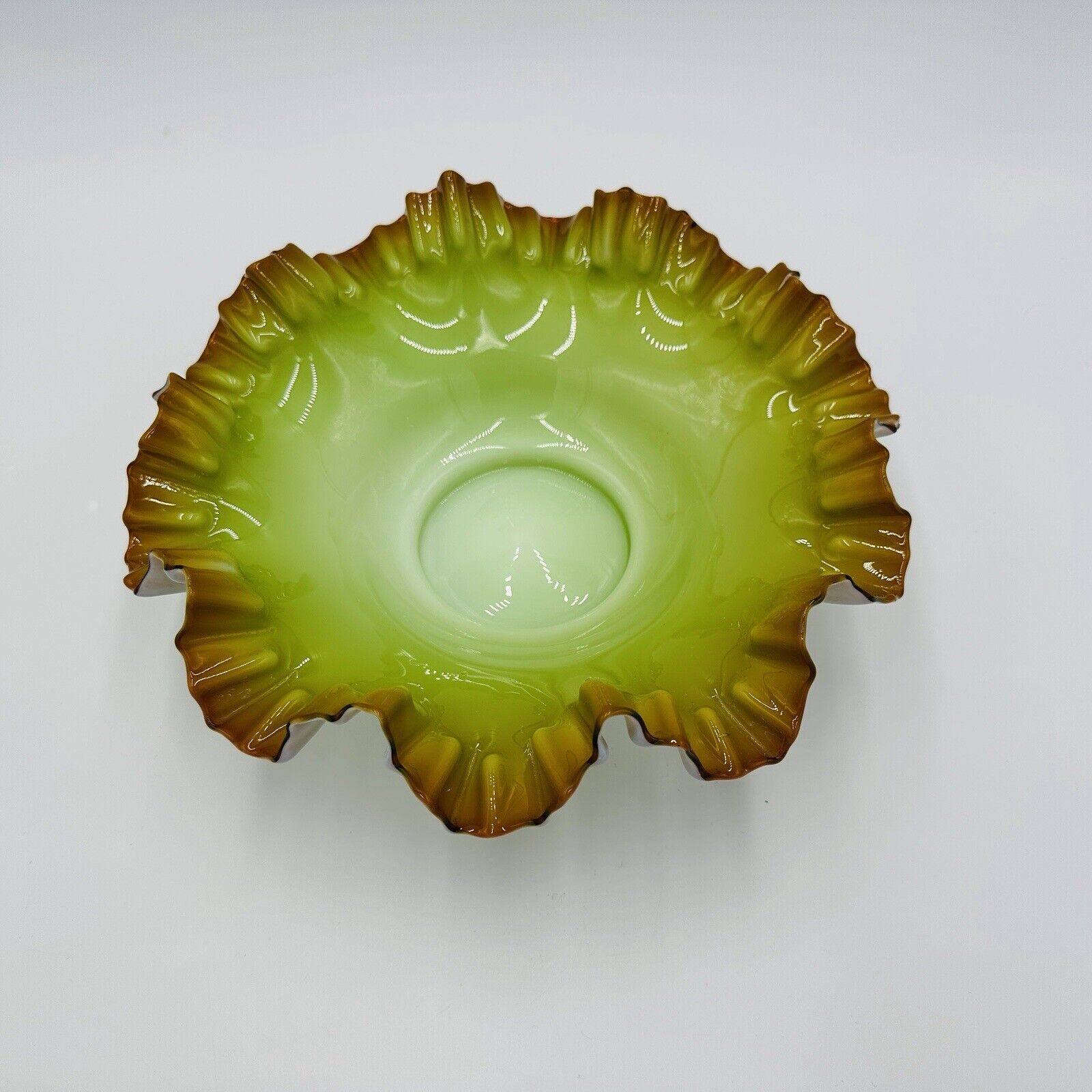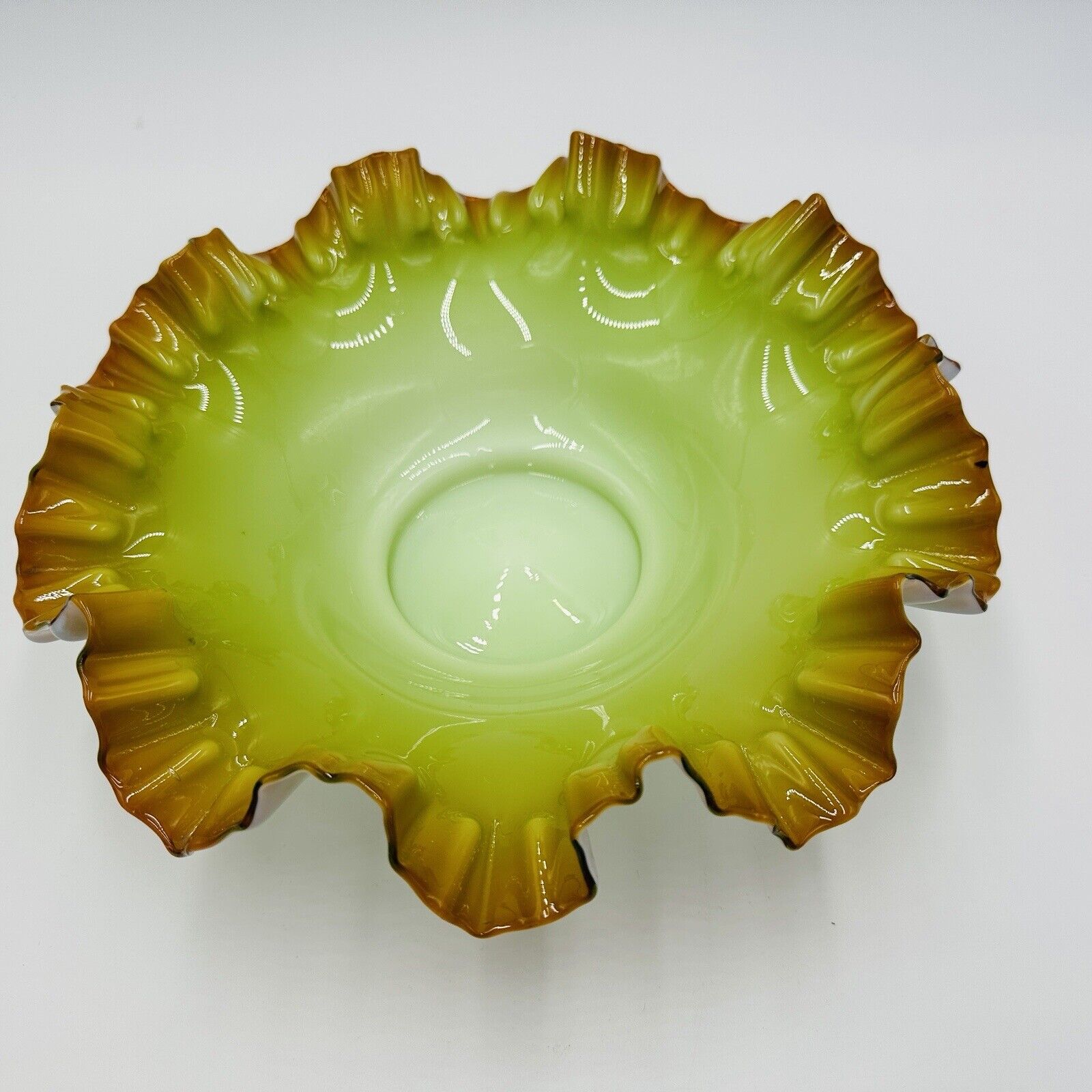 Victorian art glass Pistachio Green Cased Glass Ruffled Bowl W Ox Blood Red Rim.