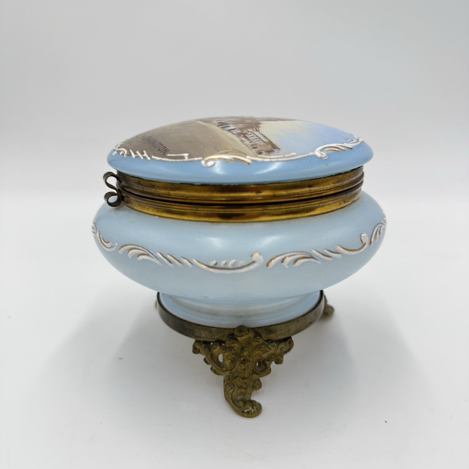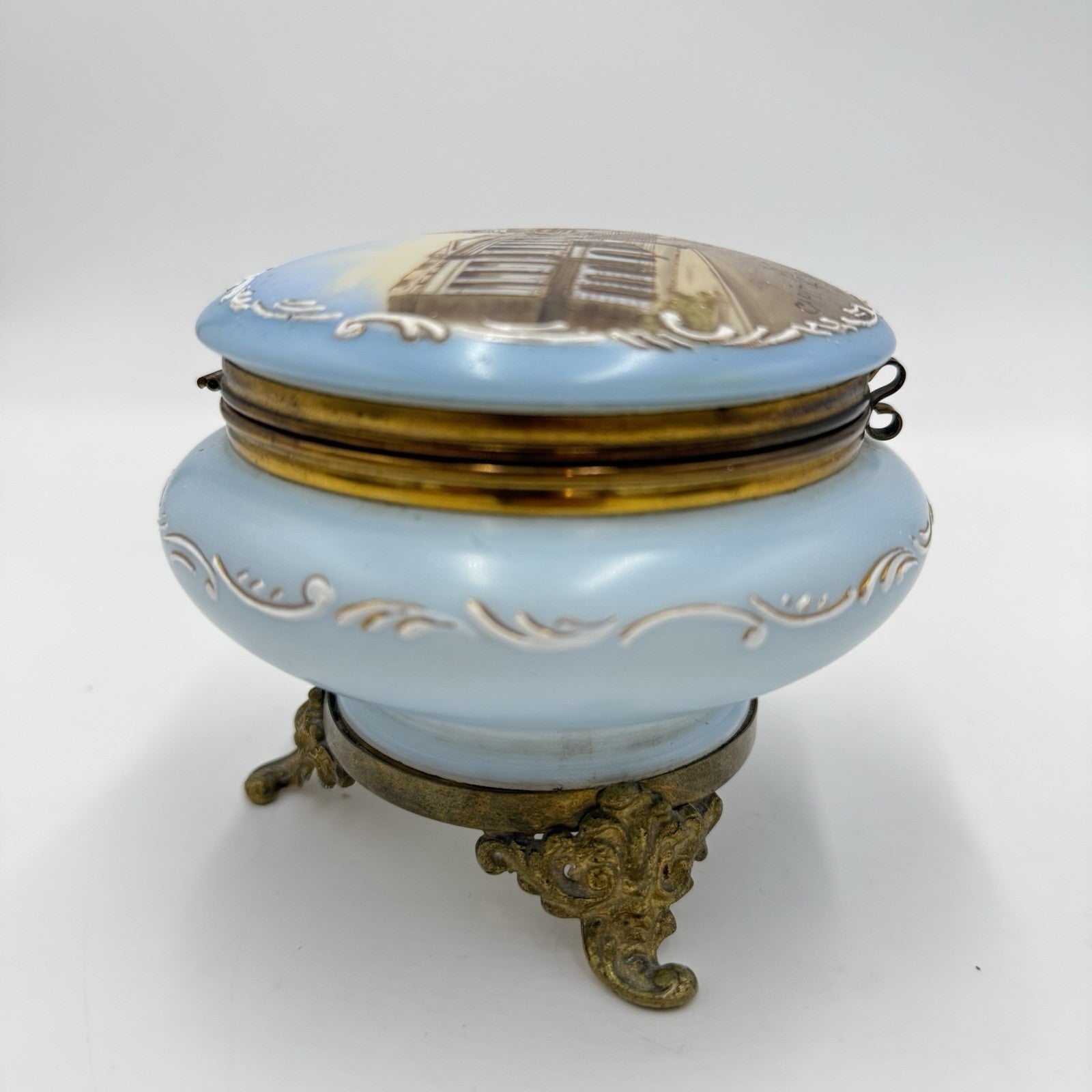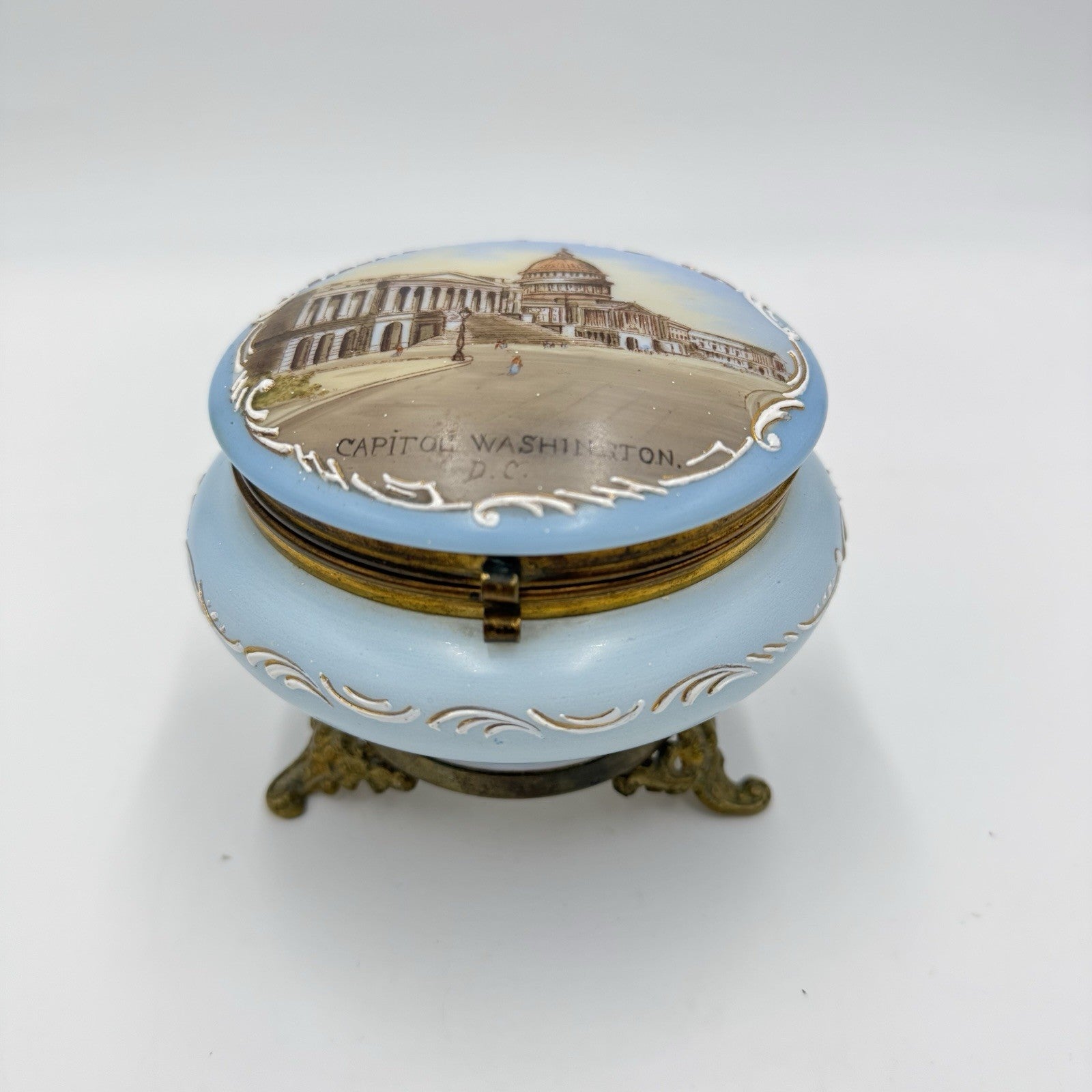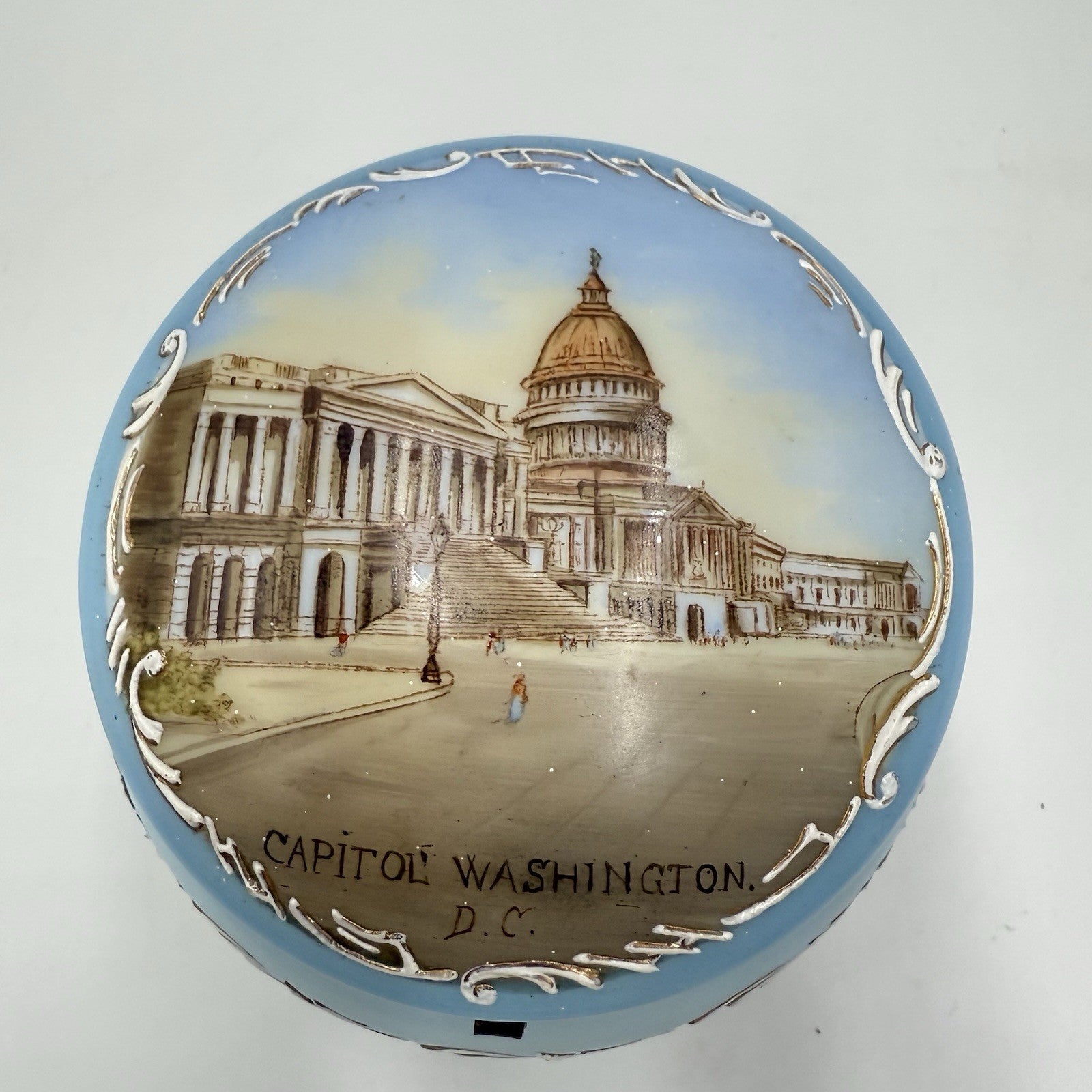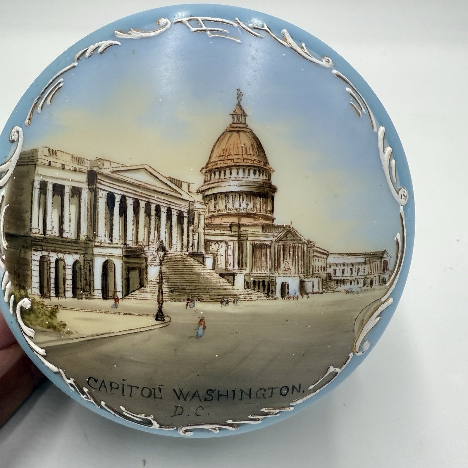 Victorian opaline Capitol Washington painted vanity trinket powder Box Antique