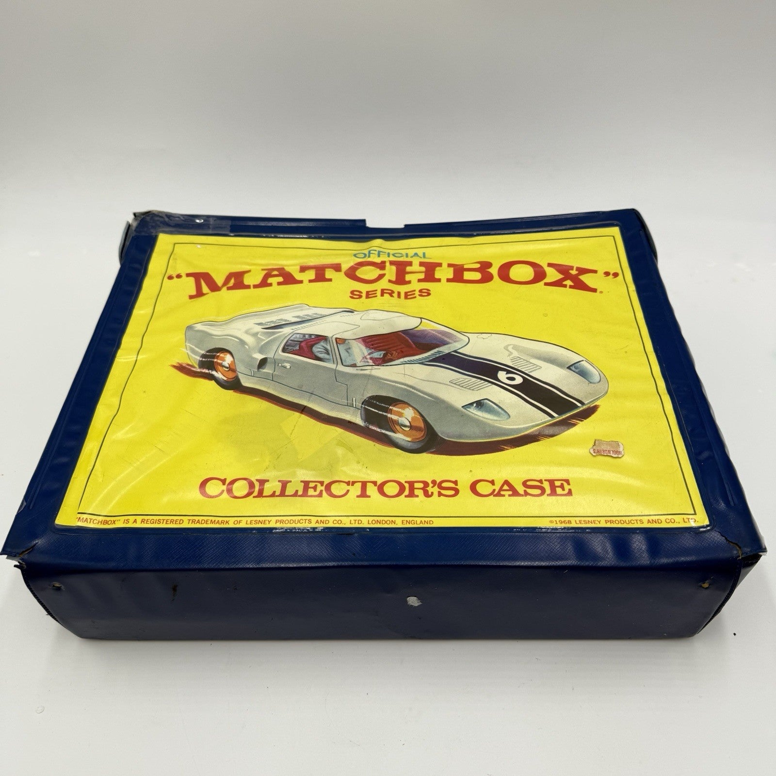 The product is a vintage 1968 Official Lesney Matchbox Deluxe Collector Case filled with Lesney cars. This blue acrylic case features a 1:64 scale display of various Matchbox cars from the Series Deluxe collection. Manufactured in the United Kingdom, this case serves as a protective and stylish storage solution for diecast toy vehicles, showcasing the character family of Matchbox. Perfect for collectors looking to organize and showcase their cherished Matchbox cars.