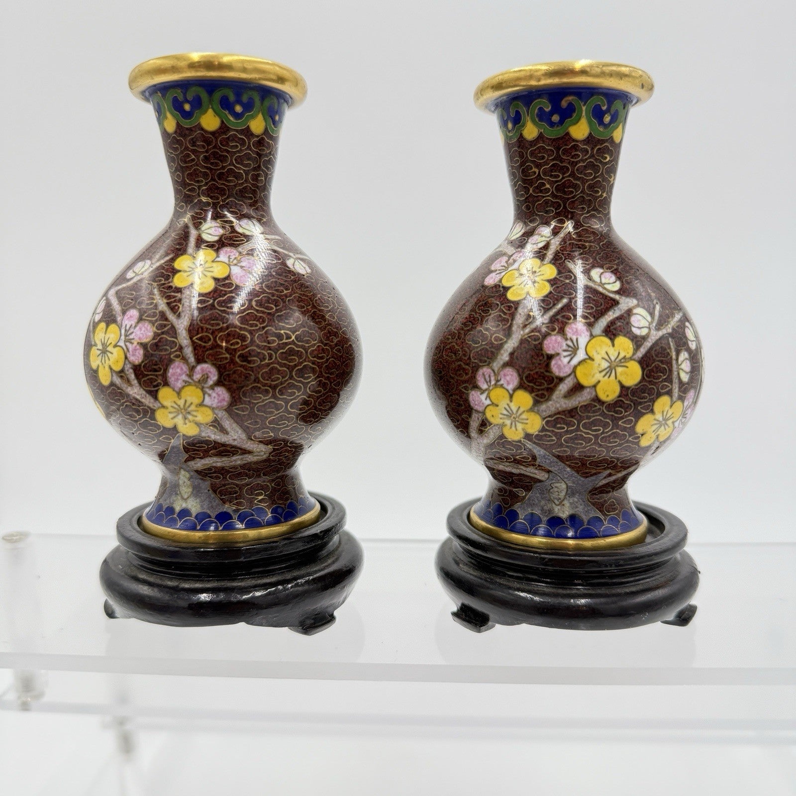 Vintage Cloisonne Enameled Cherry Blossom Brown Mini Vases Brass Chinese 4” Pair