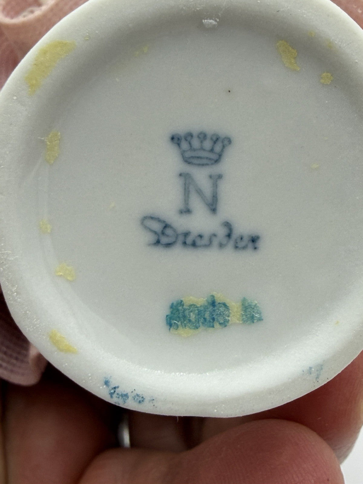 This vintage Dresden Porcelain figurine features a Victorian lady in a pink dress, standing at 4 inches tall. The intricate lace pattern on the dress adds a delicate touch to the collectible, making it a charming addition to any decorative display. Made in Germany, this figurine captures the elegance and sophistication of the Victorian era, making it a timeless piece for collectors or those who appreciate fine craftsmanship and unique design.