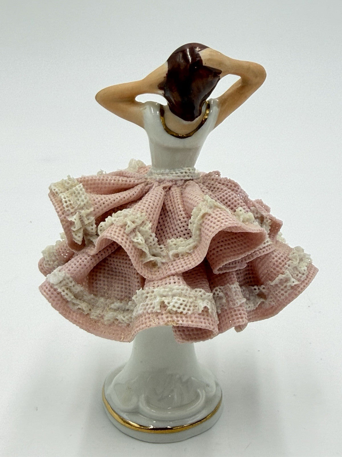 Vintage Dresden Porcelain Lace Victorian Lady Figurine Pink Dress 4” Germany