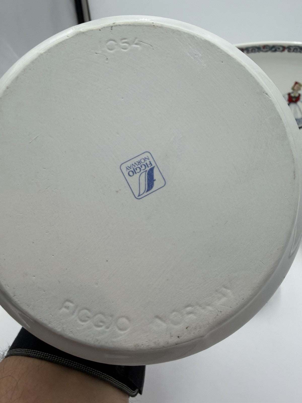 This Vintage Figgjo Flint Hardanger Dancers Teapot Creamer Sugar Bowl Platter from Norway is a charming set of 4 pieces featuring a colorful dancer pattern. The large ceramic and porcelain items, manufactured in 1975, boast a glossy finish and are perfect for all occasions. With a Scandinavian/Nordic style and original design, this tea set captures the essence of traditional Norwegian culture, making it a unique and collectible addition to any kitchen or home decor.