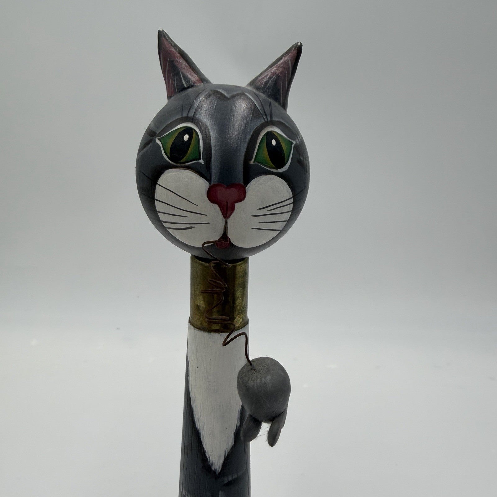 The product is a vintage folk art American spindle art cat with mice, carved from wood and measuring 10.5 inches in height. Handmade in the United States, this unique piece features a cat clas with intricate details of mice, showcasing the artistry and craftsmanship of folk art. Perfect for collectors of handmade items or cat enthusiasts, this wood-carved sculpture adds a touch of whimsy and charm to any space.