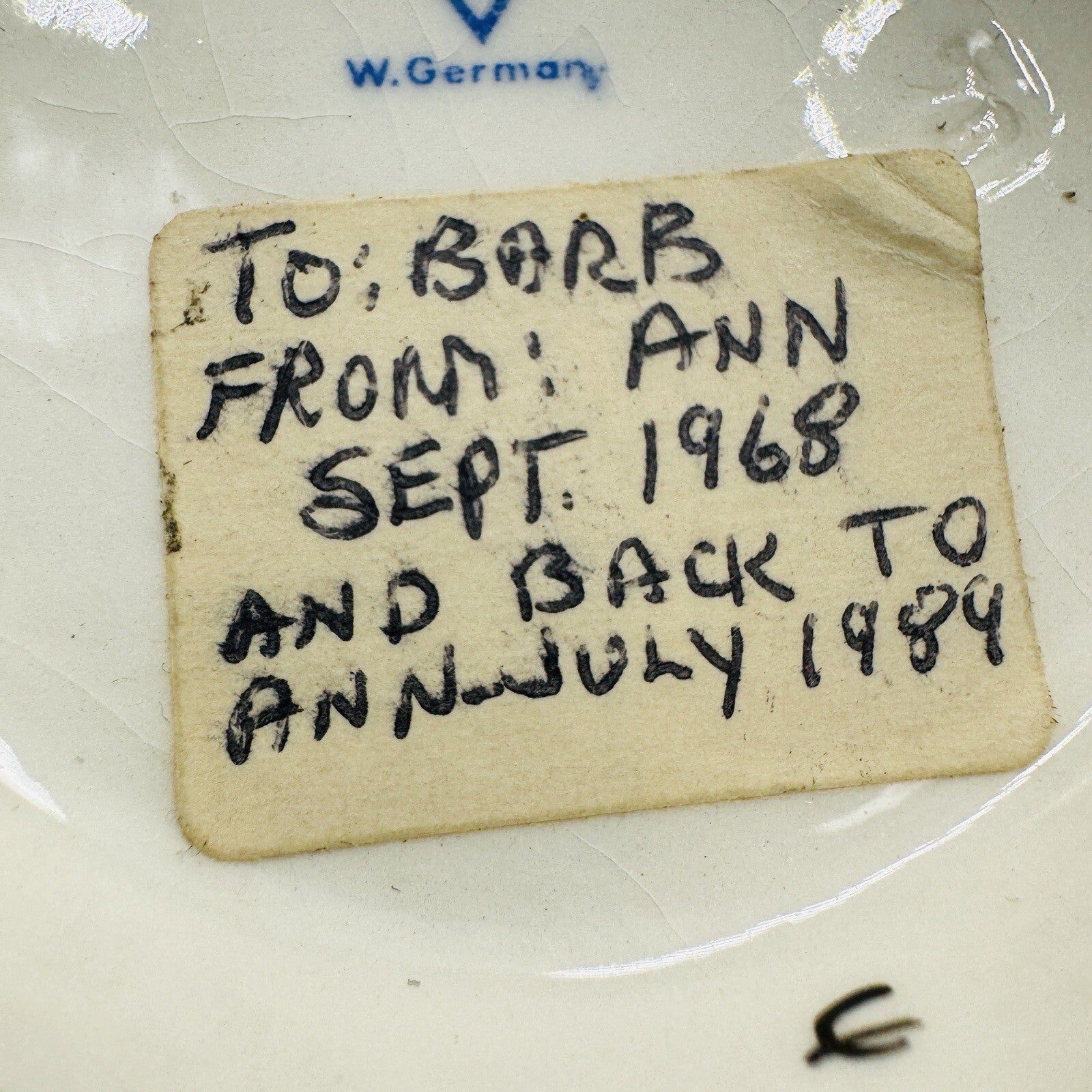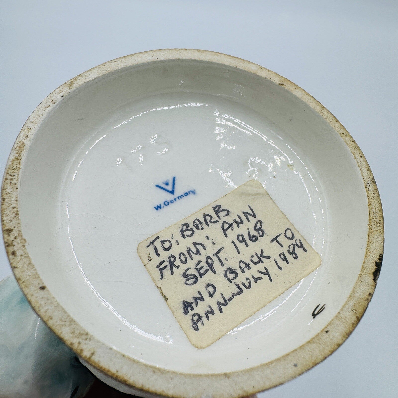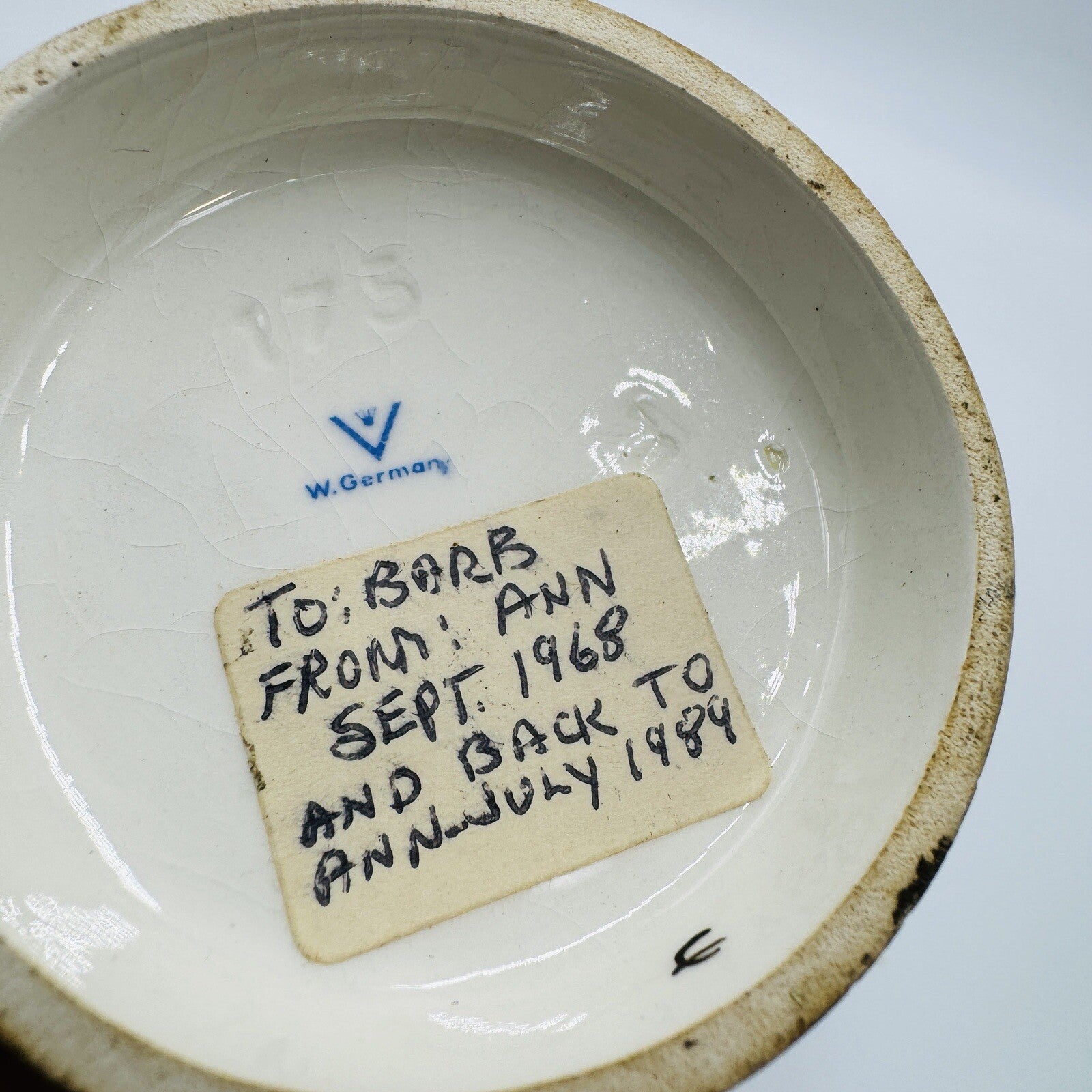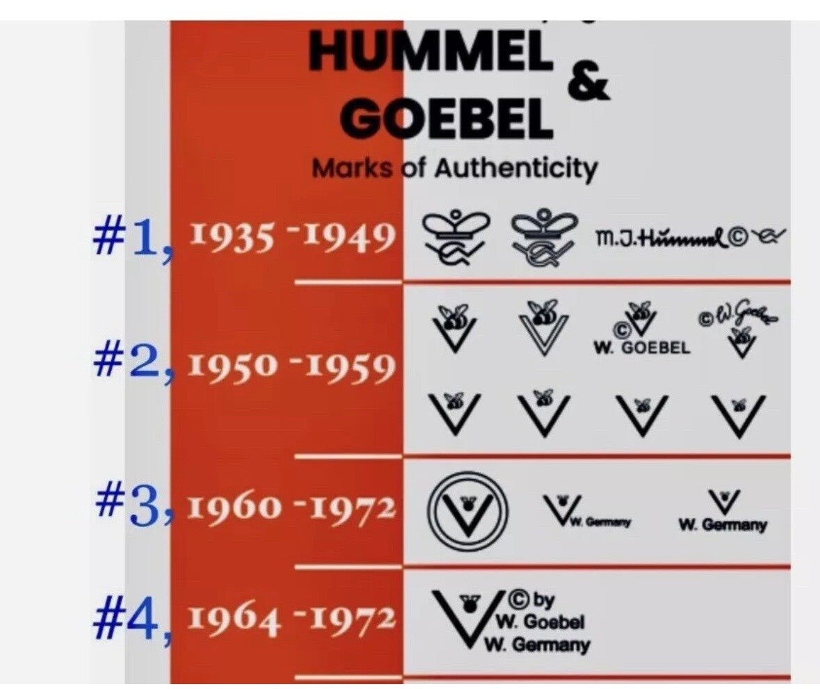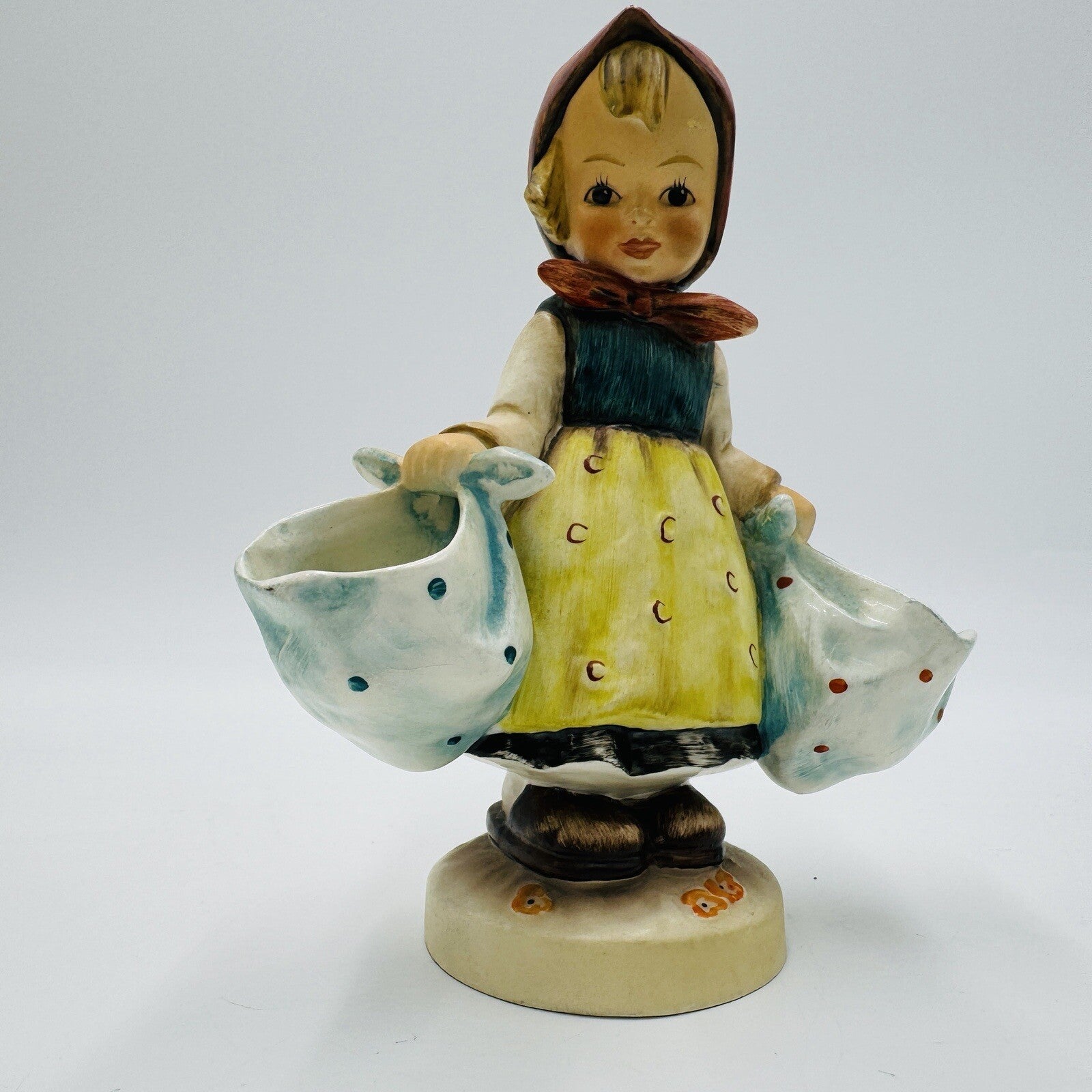 vintage Goebel Hummel figurine from Germany, manufactured in the 1960s. The figurine depicts a girl carrying bags and is hand-painted with an all-over pattern. It stands at 5.2 inches tall and is made of ceramic. The figurine is signed and is part of the Hummel collection. The theme of the figurine is "Mother's Darling".