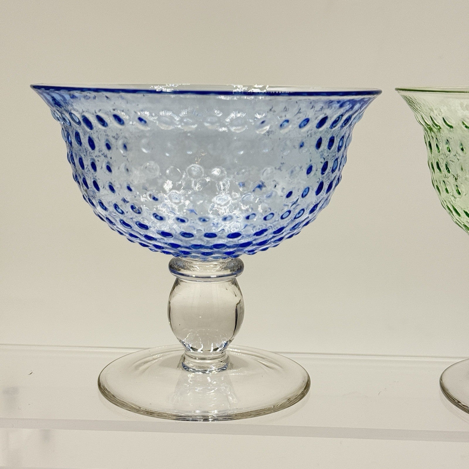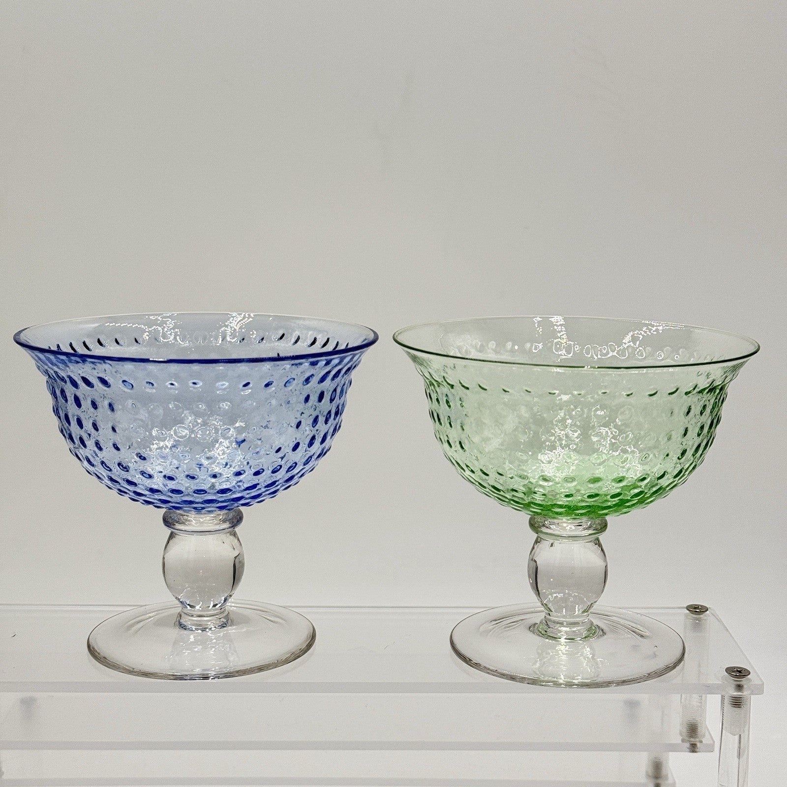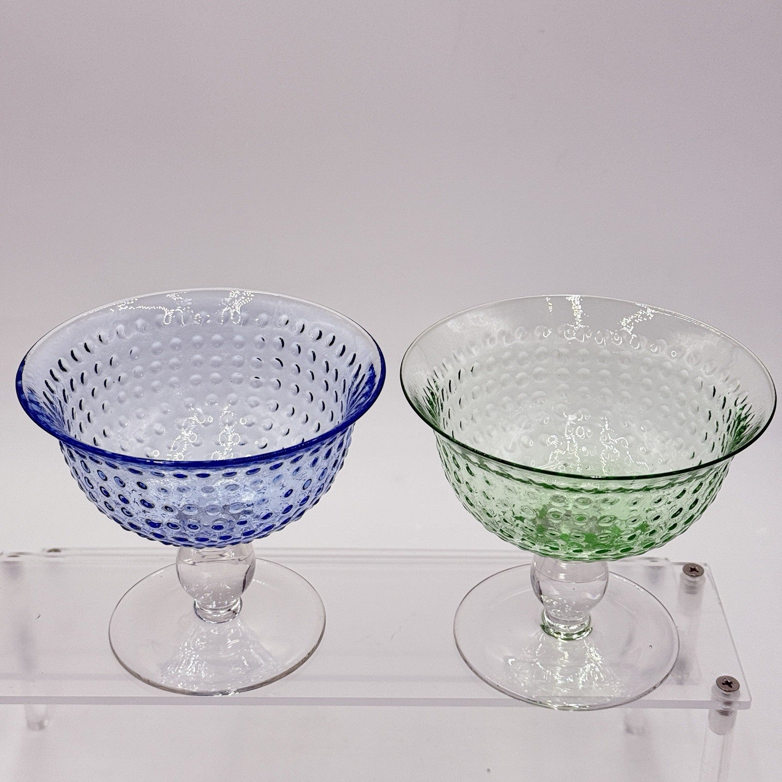 Add a touch of vintage elegance to your serving collection with this pair of blue-green art glass dessert cups. The hobnail pattern etched into the glossy finish gives these round glasses a timeless look, perfect for any occasion. Each cup measures 5 inches in diameter and 4.3 inches in height, making them ideal for sherbet or other desserts. These unmarked glasses are believed to be from the United States, and their beautiful design is sure to impress guests.