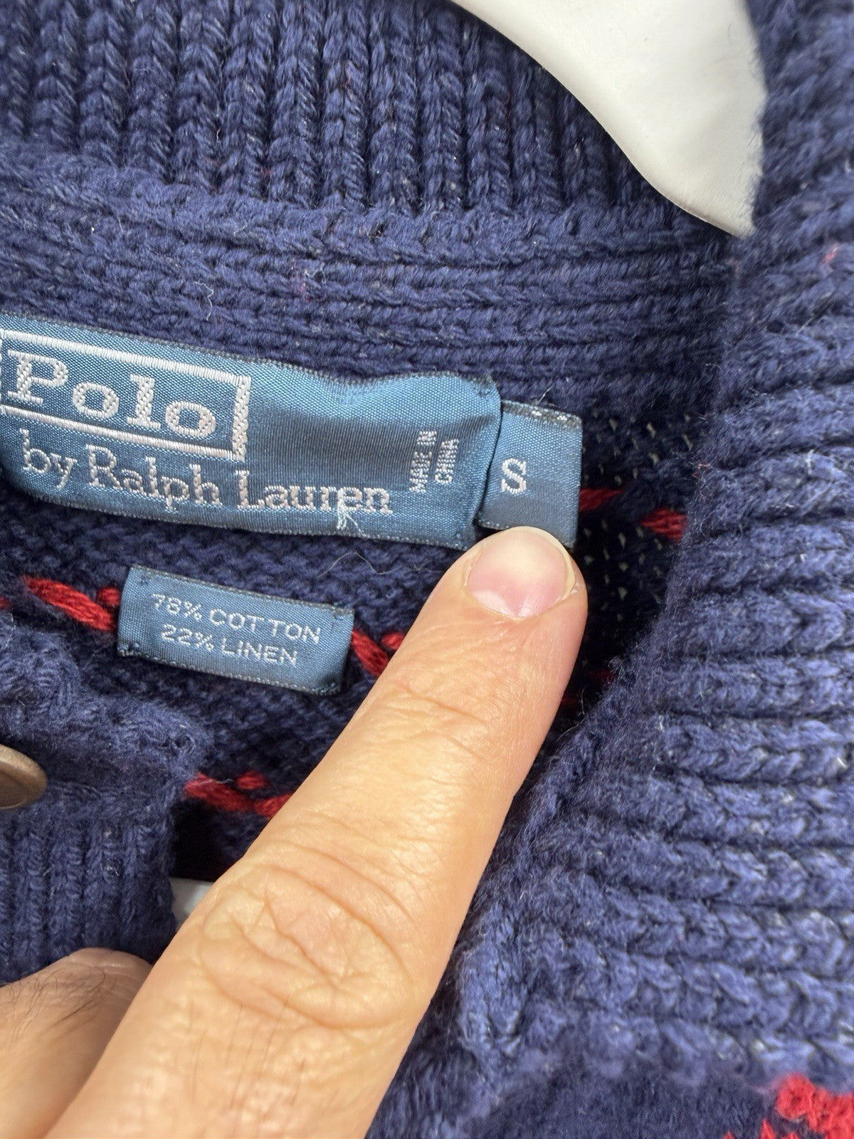 This vintage Polo Ralph Lauren Moose Pattern Christmas Sweater in size S features a classic Fair Isle design with a collared neckline and long sleeves, perfect for the winter season. Made from a blend of linen and cotton, this heavyweight sweater in blue and red colors is ideal for casual or travel occasions. The pullover style with a regular fit and all-season features makes it a timeless addition to any wardrobe, showcasing the brand's signature Christmas theme with a touch of reindeer and moose