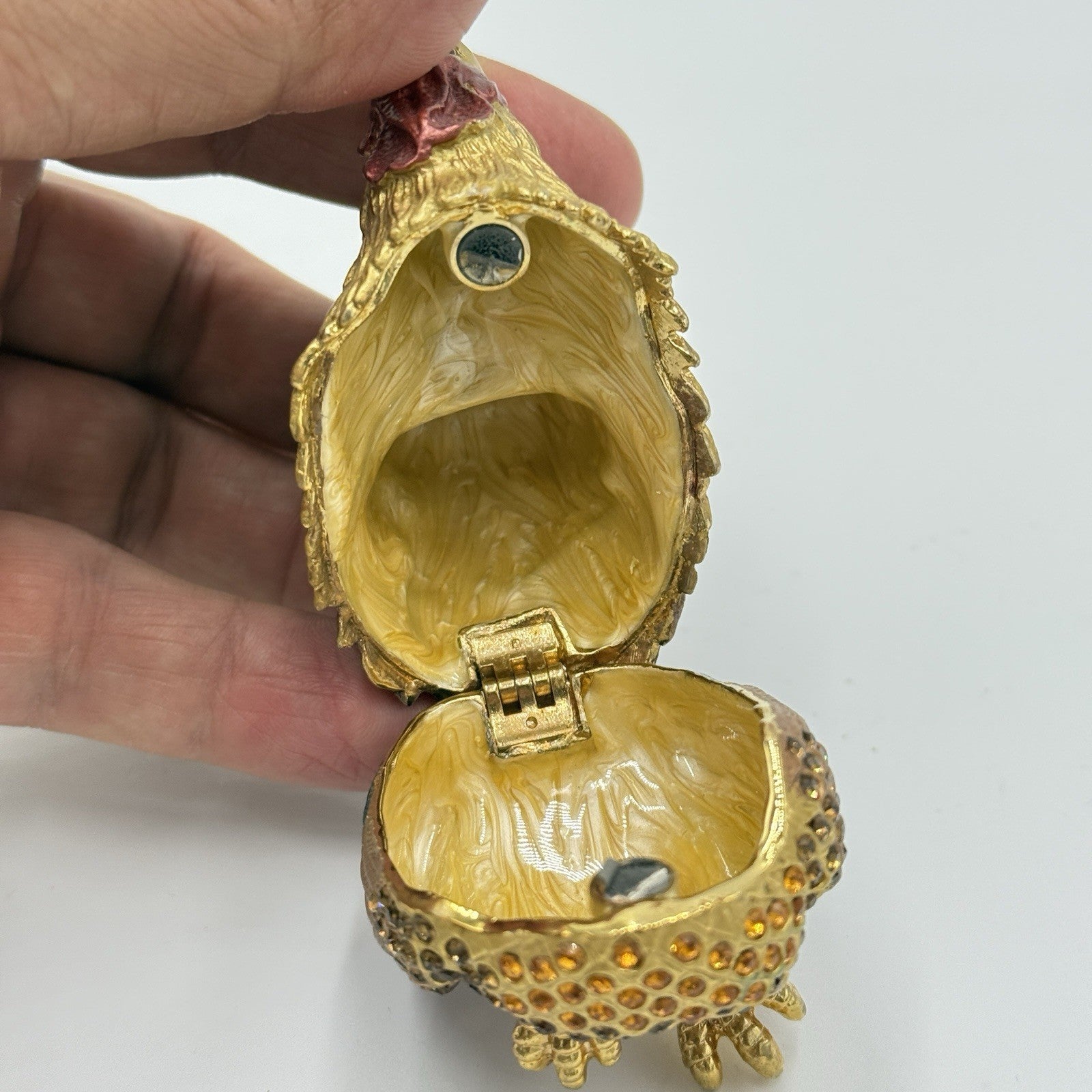 The Vintage Rucinni Rooster Trinket Box is a unique, handmade piece from the 1980s crafted with Swarovski crystals and metal enamel. This asymmetrical trinket box features an abstract rooster design in gold, making it suitable for all occasions and any room. The closure type is magnetic, and it comes in its original packaging, adding to its collectible value. Ideal for adults, this small-sized box is a stylish and eye-catching piece that adds a touch of vintage charm to any collection.