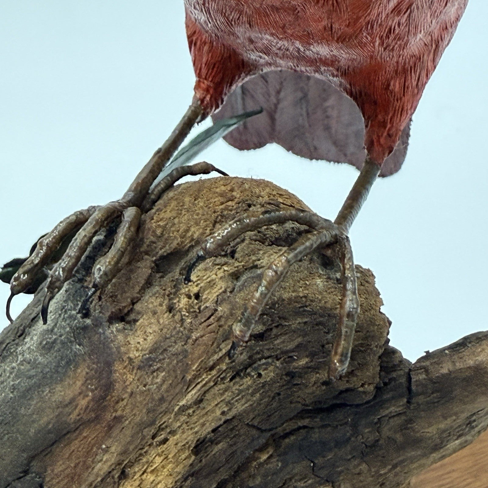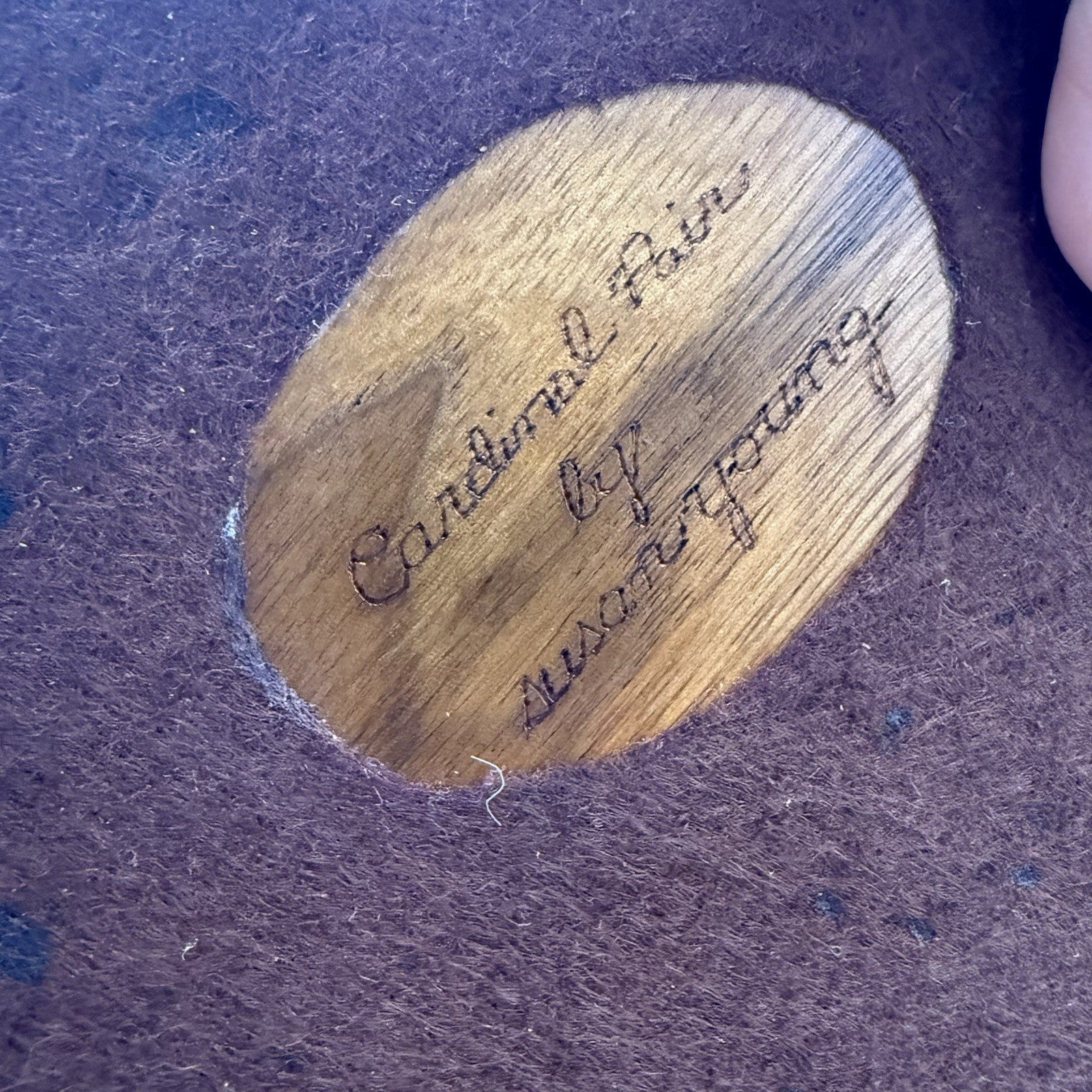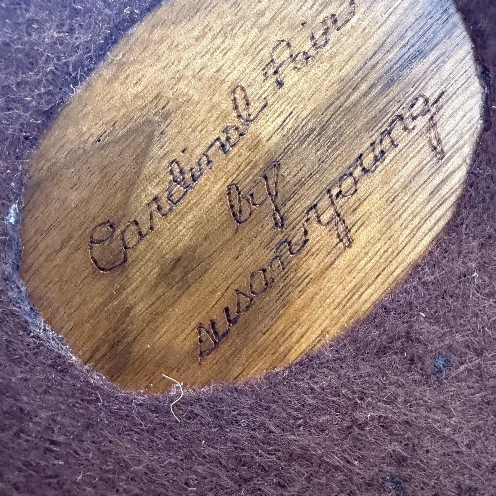 The Vintage Susan Young Folk Art Wood Carving features a pair of Northern Cardinals perched on a branch, signed by the artist herself. This large, handmade piece from 1987 showcases intricate carved details and a matte painted finish, reflecting the 1960s style. The multicolor wood carving is a unique and original addition to any room, perfect for bird enthusiasts and collectors of folk art. Made in the United States, this one-of-a-kind piece by Susan Young adds character and charm to any space.