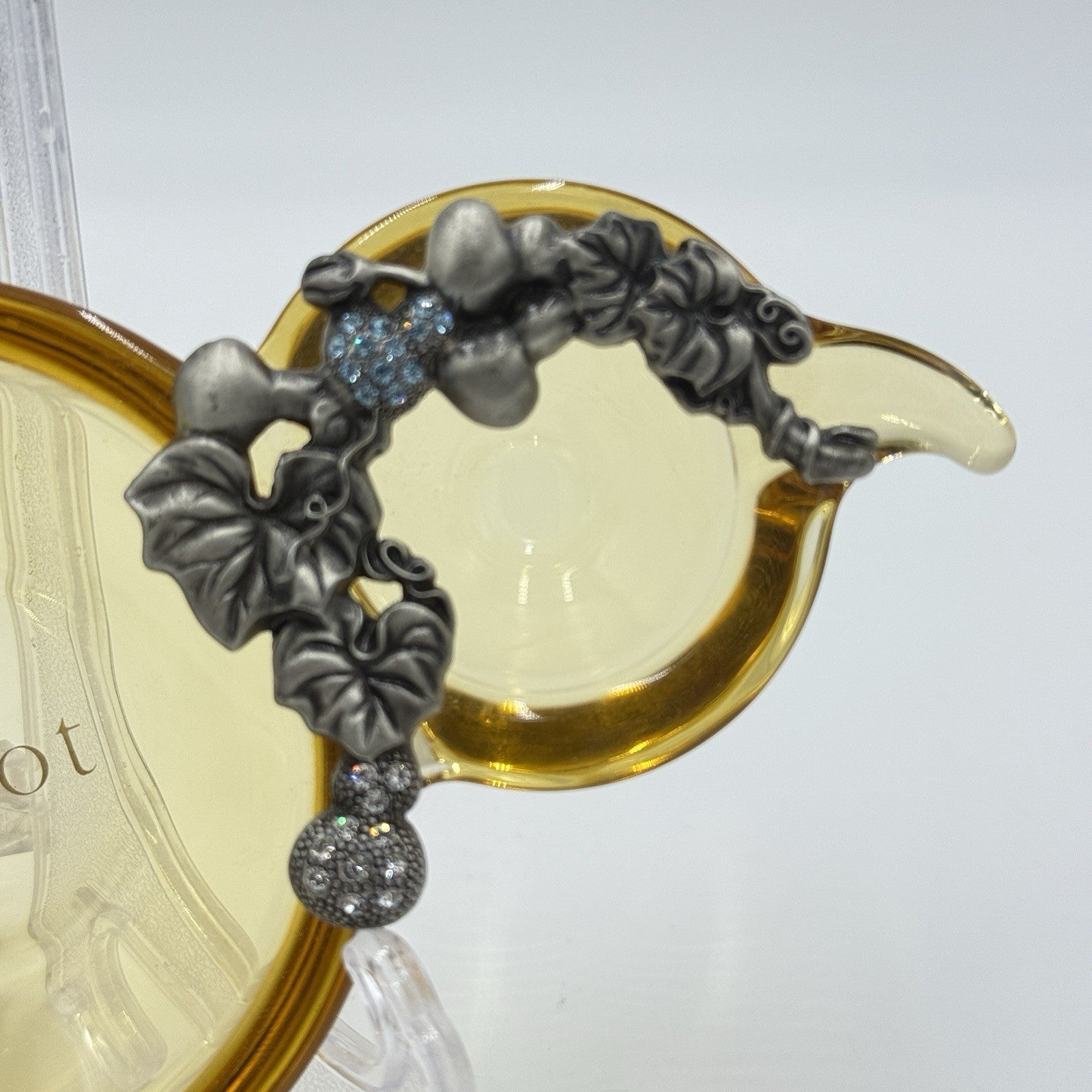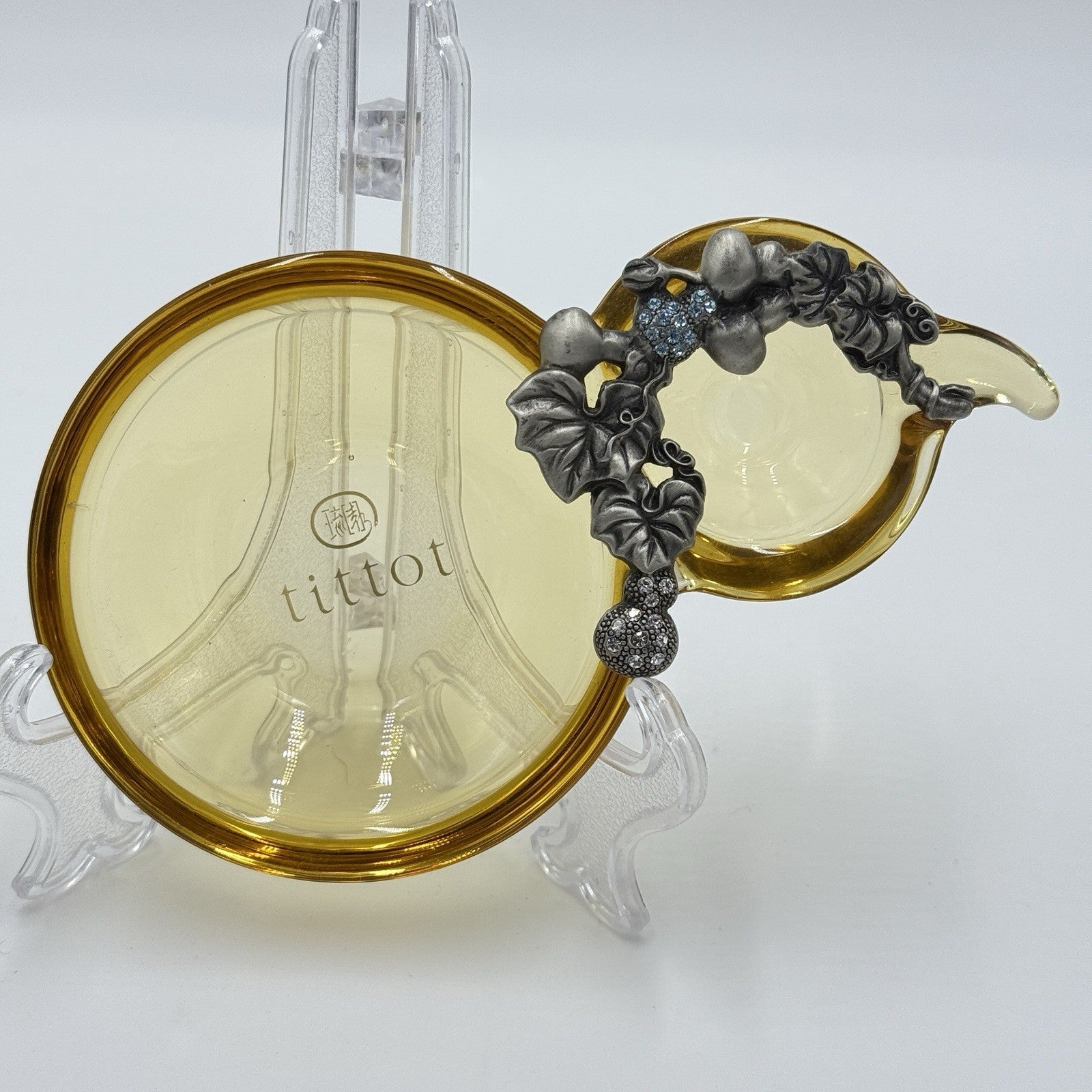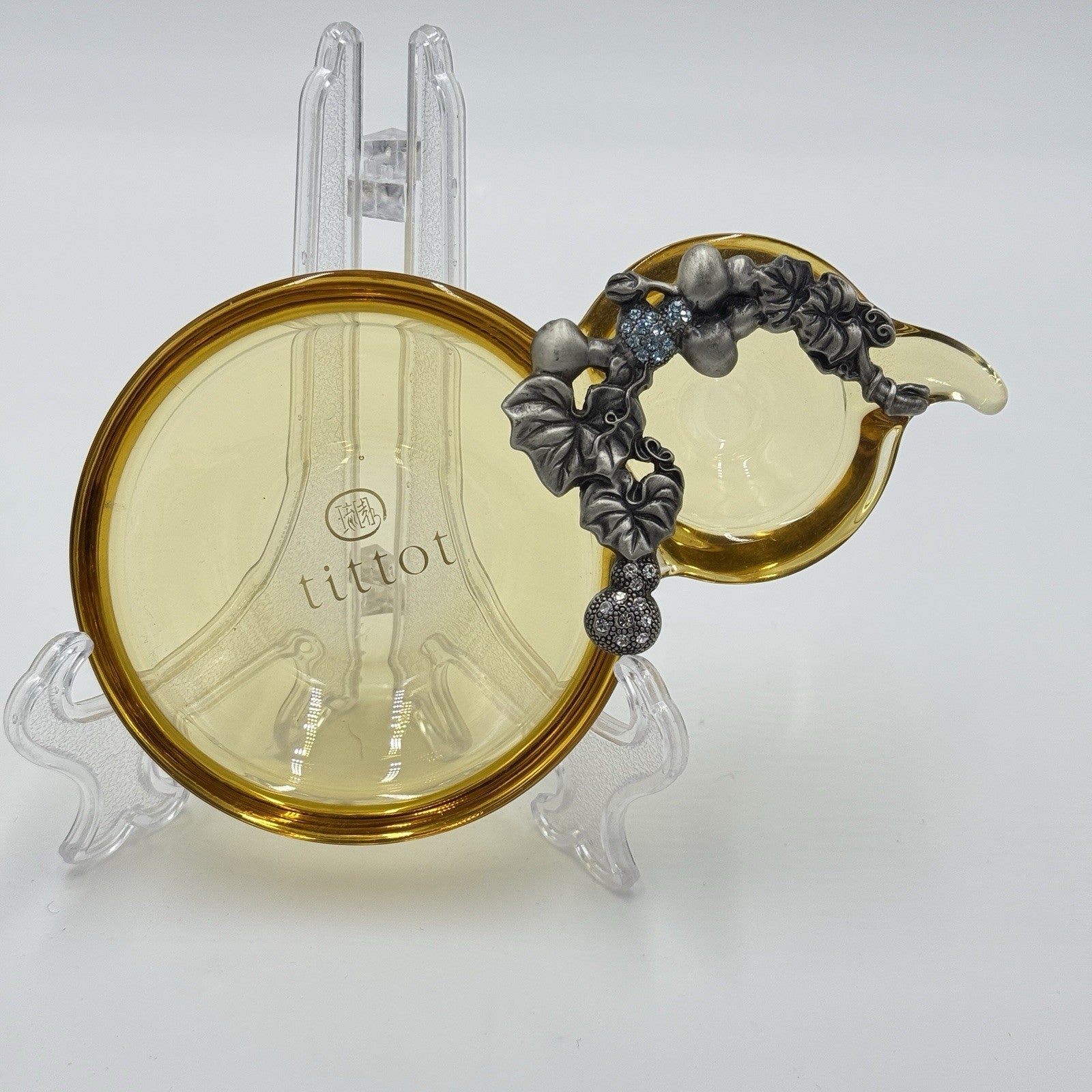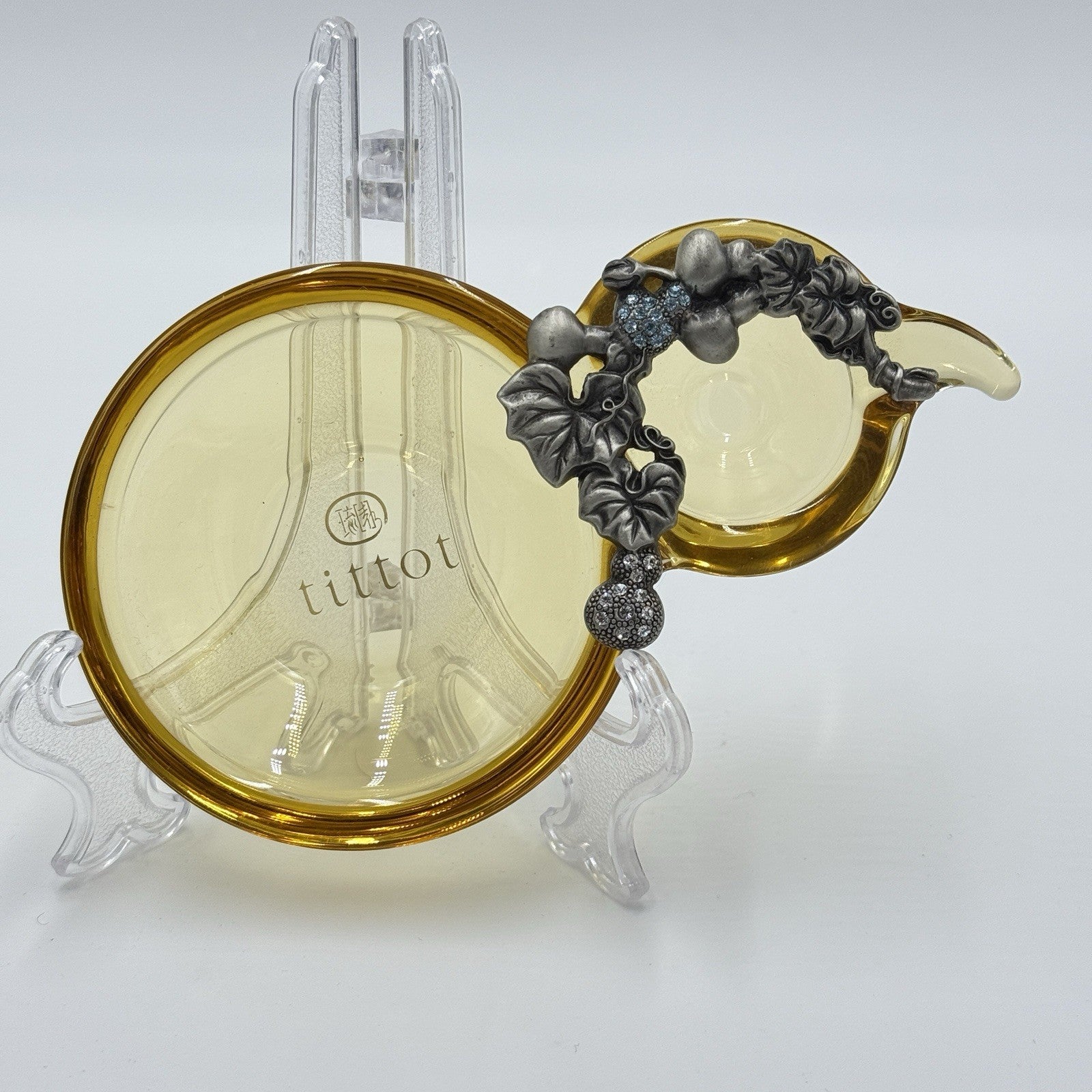 This vintage Tittot Art Glass tray is a stunning addition to any collection. The amber color and pear shape make it a unique and eye-catching piece. The tray is made of high-quality glass and pewter, with a glossy finish that adds to its elegance. It is perfect for use as a jewelry dish or as a decorative tray for your home. The tray is in excellent condition and ready to be enjoyed by a new owner.