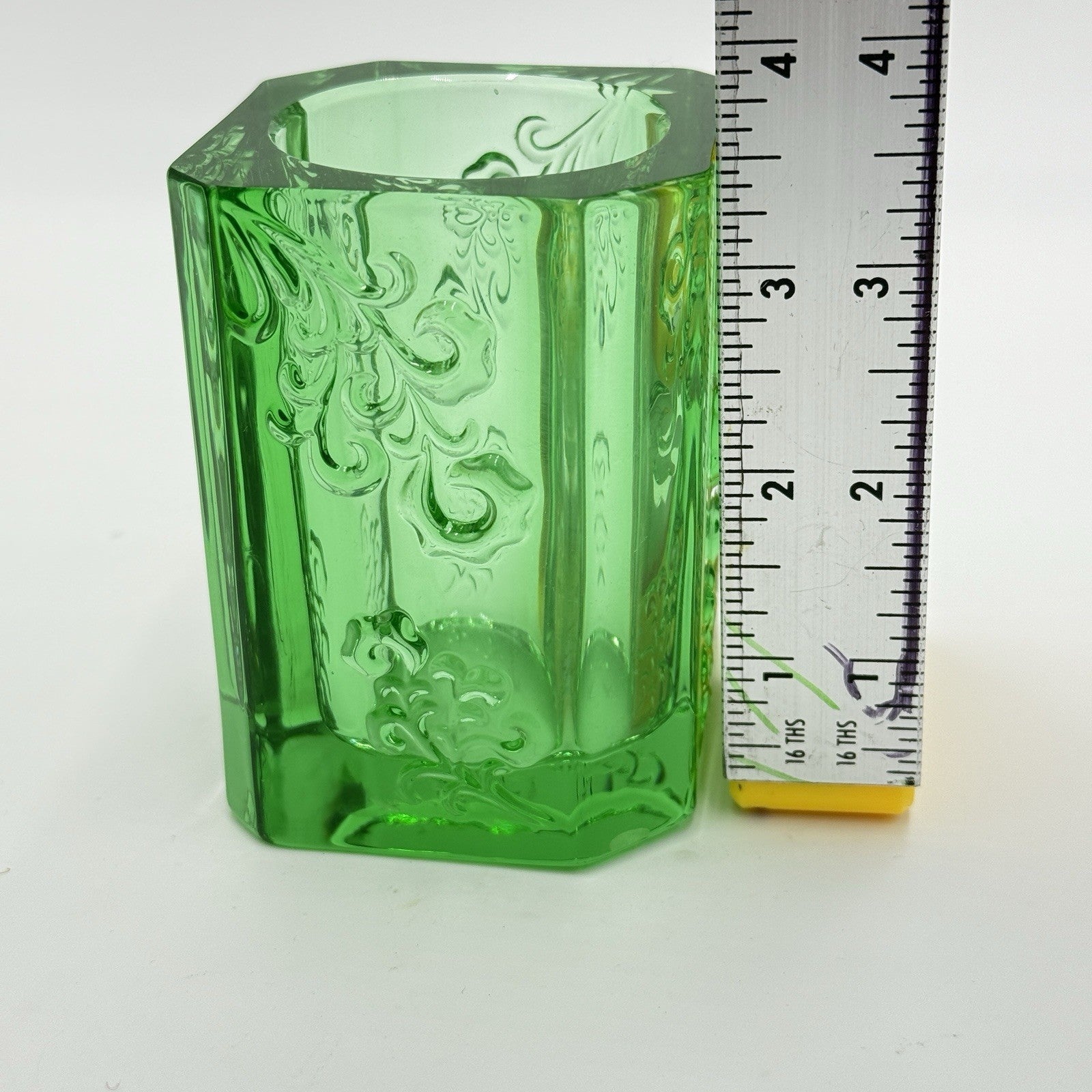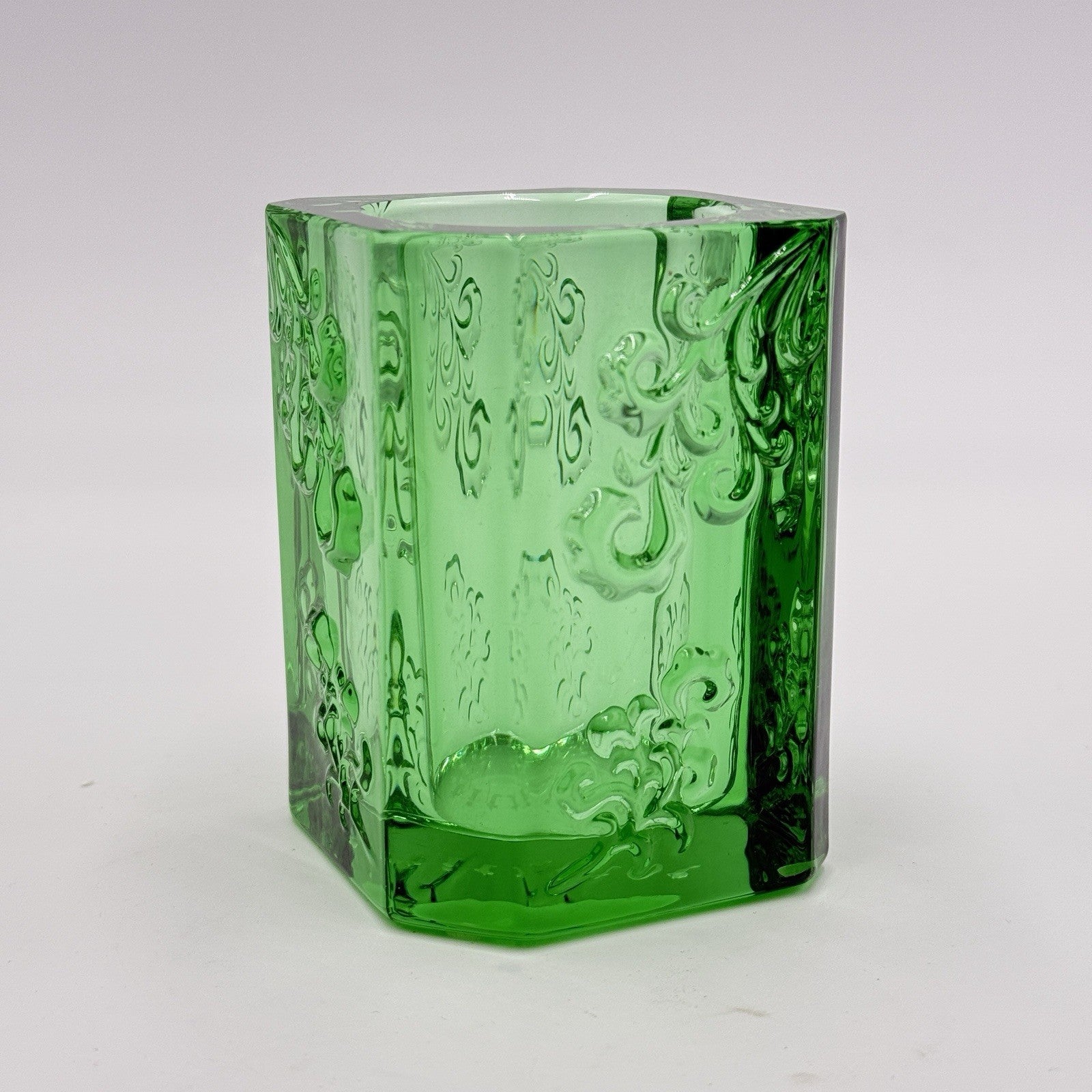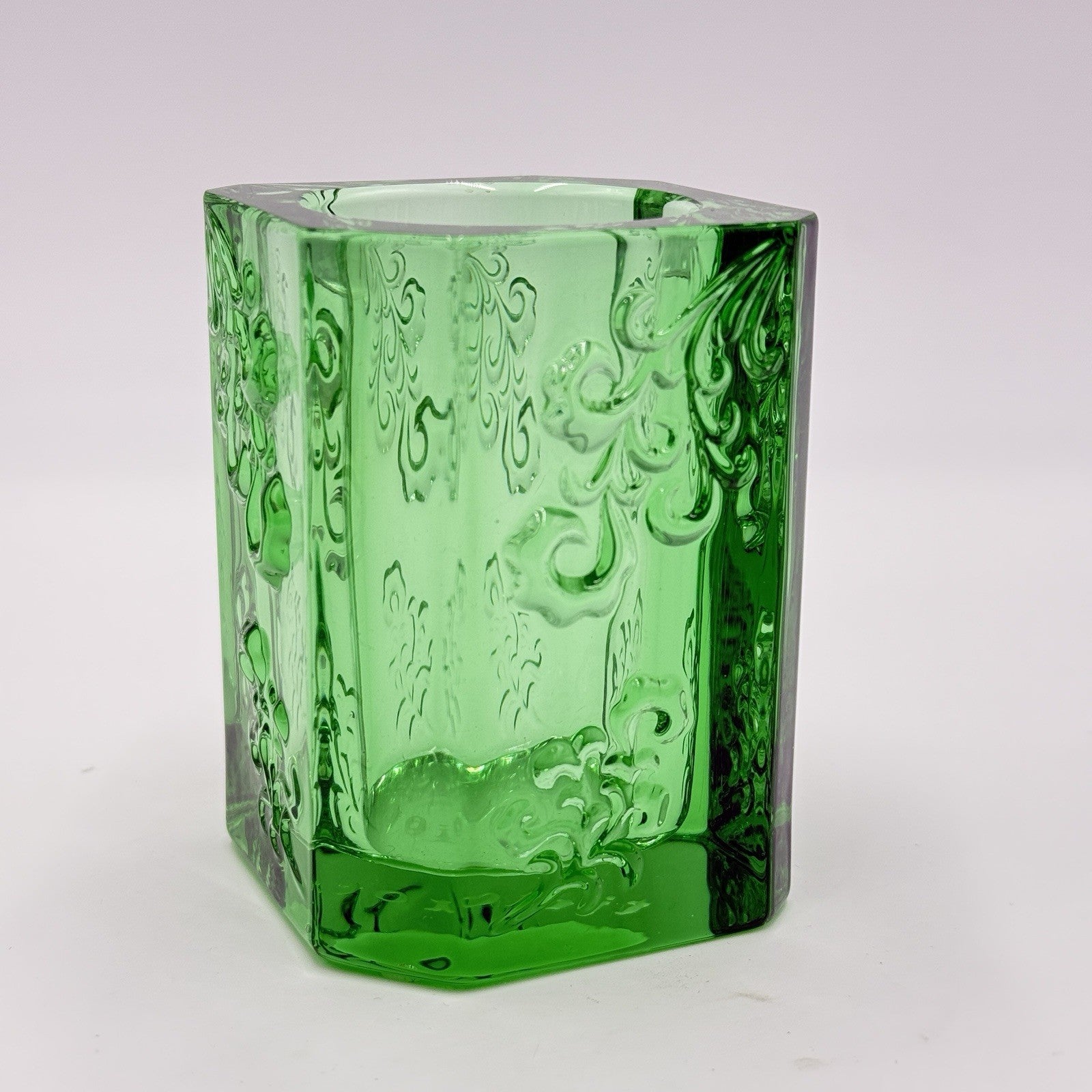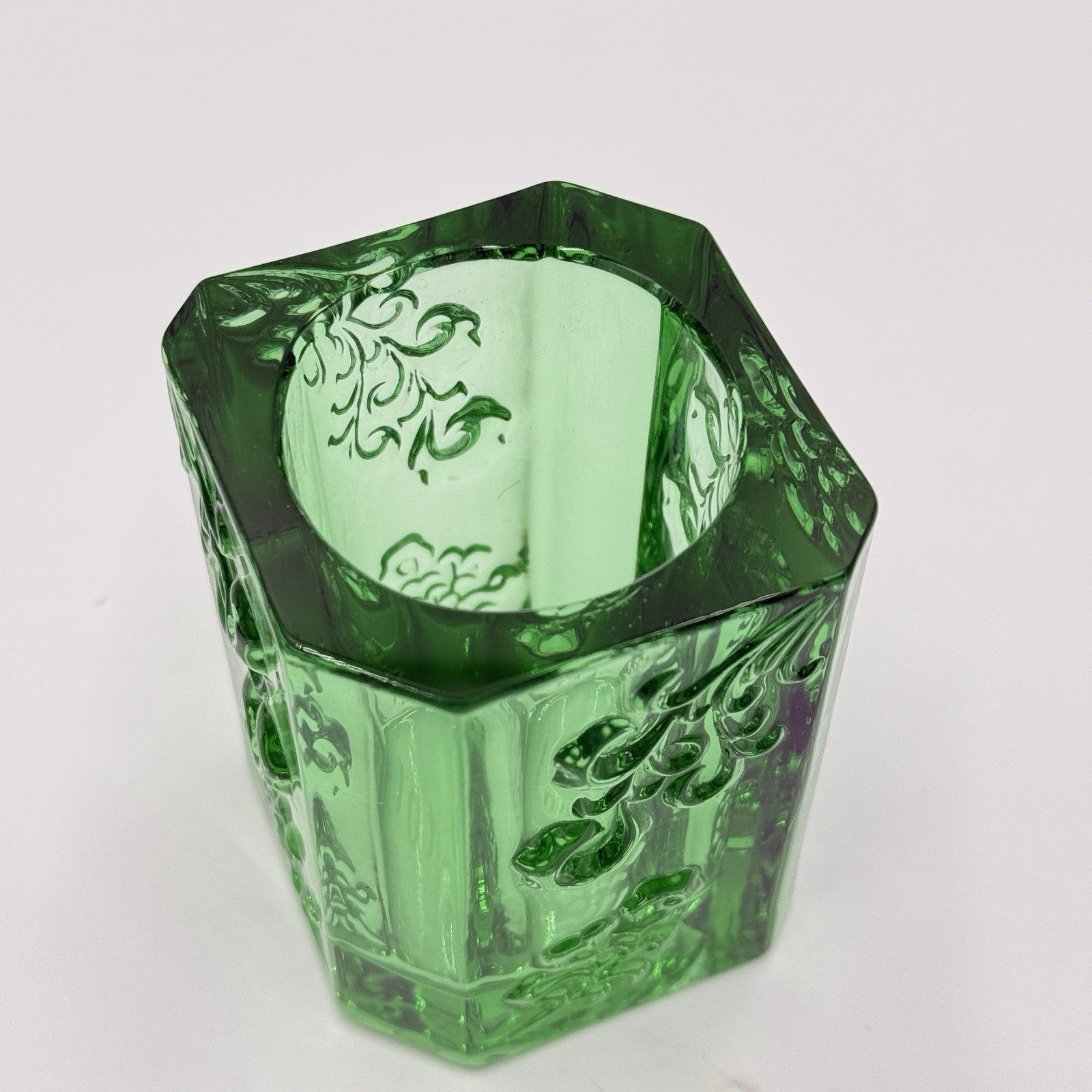 Vintage Tittot Art Glass Green Emerald Embossed Vase 3.5”H Candle Holder Votive