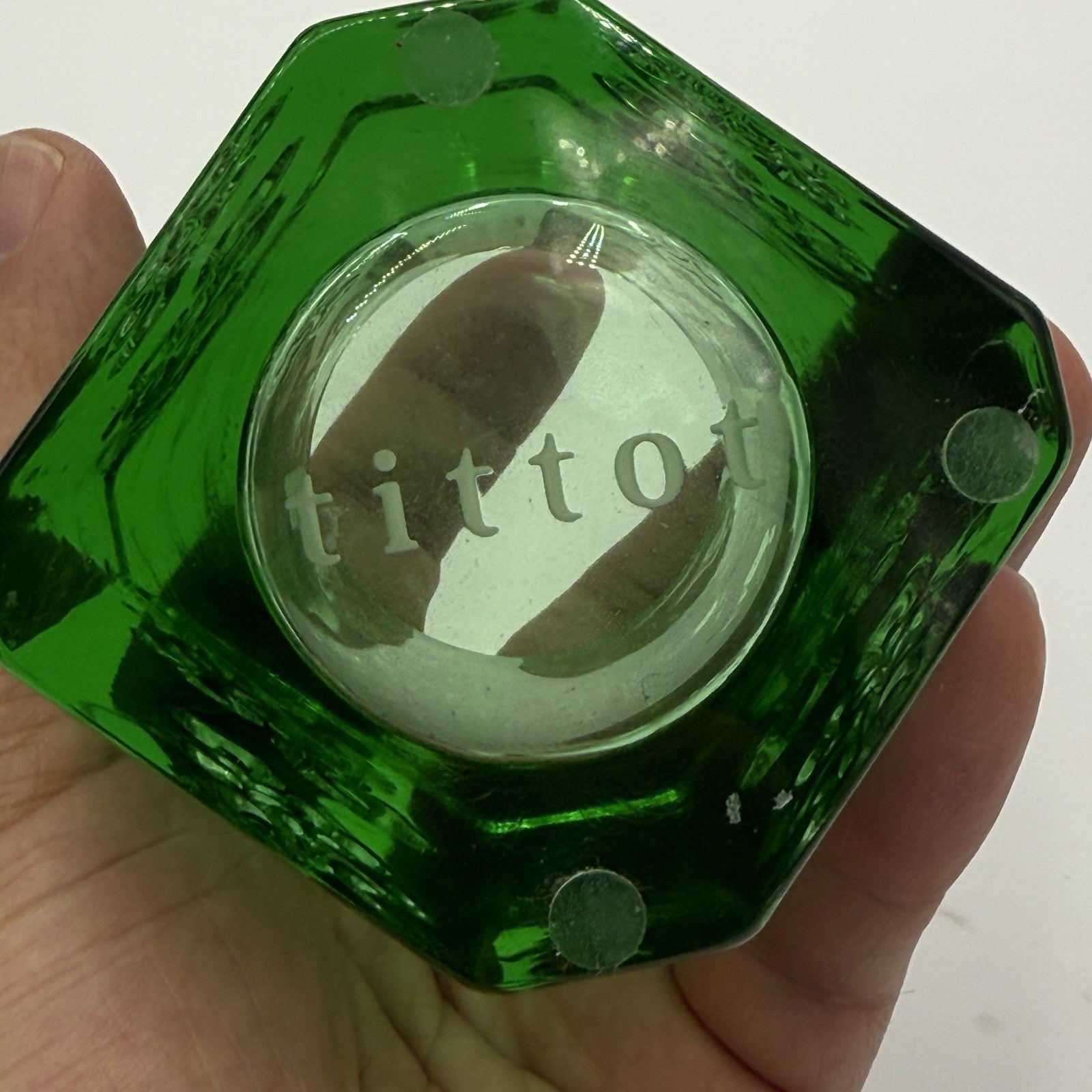 This is a vintage Tittot Art Glass vase that was manufactured in 1995. The vase is made of hand-blown glass and has a glossy finish. It is 3.5 inches tall and is embossed with a green emerald color. The vase is signed and has an incised backstamp. It is an original piece and is in the mid-century modern style. The vase can be used as a candle holder or as a decorative piece.