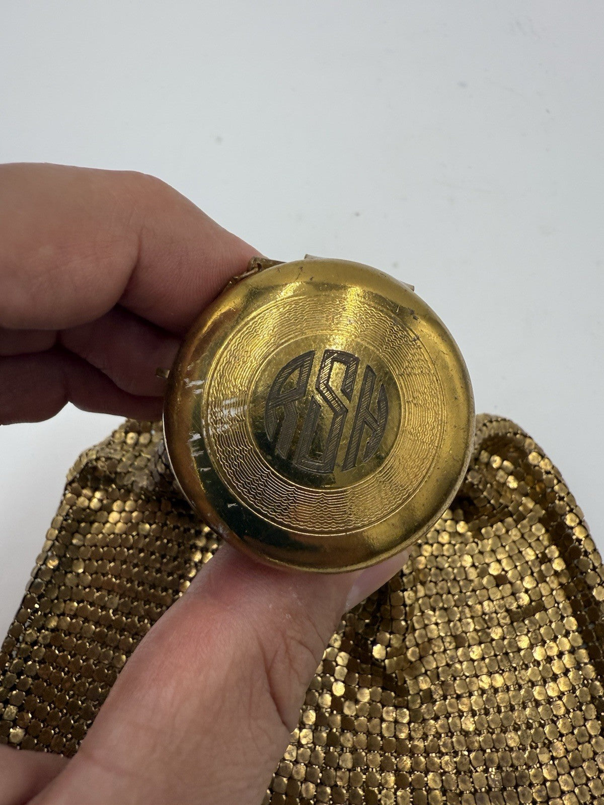 The Vintage Whiting & Davis Gold Mesh Beggars Evening Bag Purse is a stylish and elegant accessory from the 1940s. Made in the United States, this original piece features a unique expandable gate top design, perfect for special occasions. The art deco look and gold color give it a classic and timeless appeal, ideal for women looking to add a touch of vintage sophistication to their outfit. Made from fine mesh material, this purse exudes luxury and charm, making it a must-have for any fashion-forward collector.