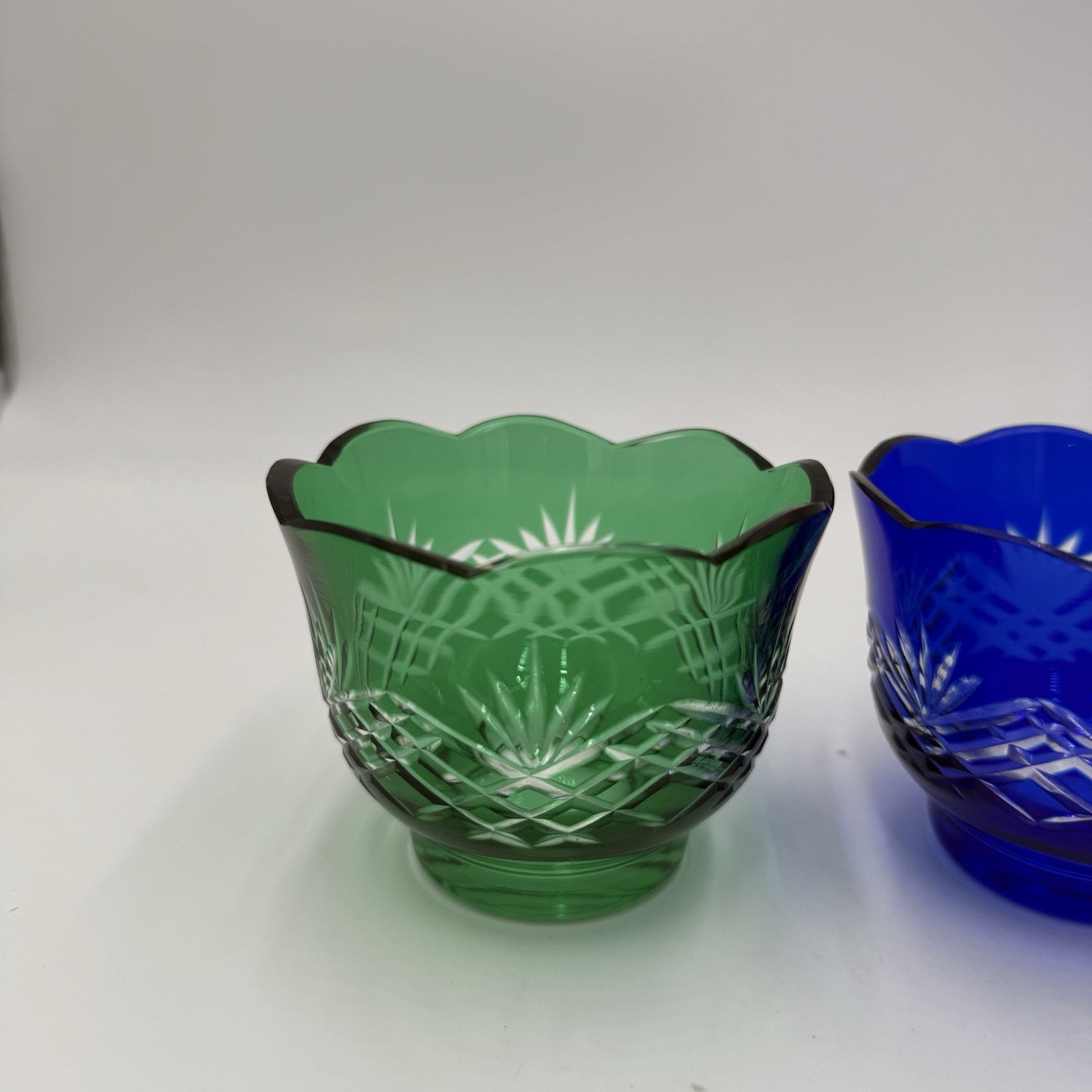 Vtg Bohemian Colored Crystal Cut Scalloped Edge Votive Green Blue Purple 3 Pcs