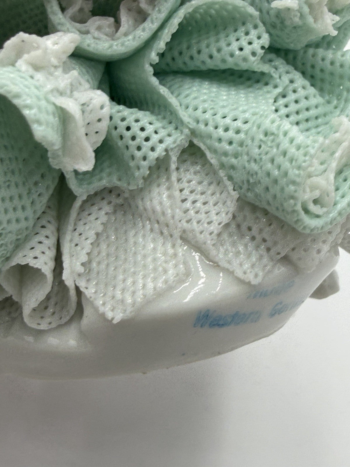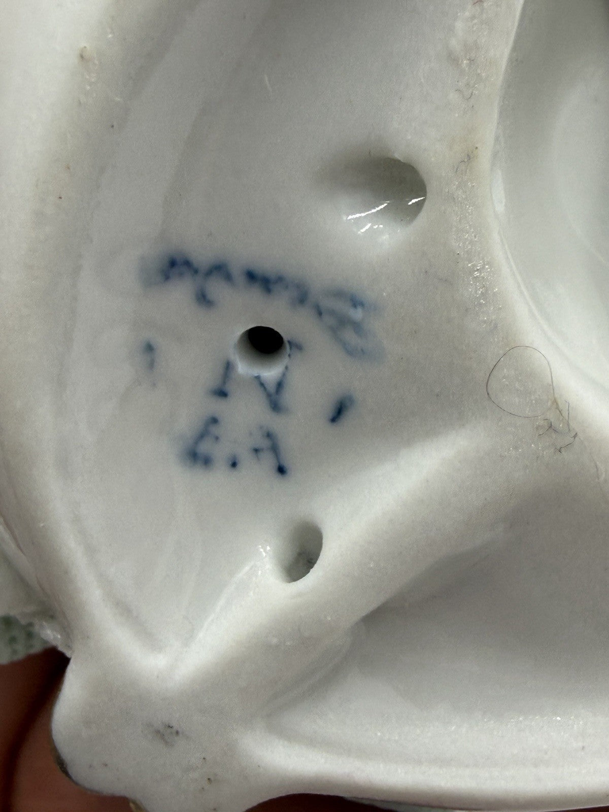 This vintage Dresden Porcelain figurine features a Victorian lady seated in a green lace dress, standing at 3 inches tall. Made in Germany in the 1950s, this collectible piece exudes elegance and romance with its intricate lace pattern and Victorian style. The figurine is part of the Classic Collection, showcasing delicate porcelain craftsmanship and a charming theme of art, people, and nostalgia. Perfect for all occasions, this figurine is a beautiful addition to any decor, especially for those who appreciate classic and timeless pieces.