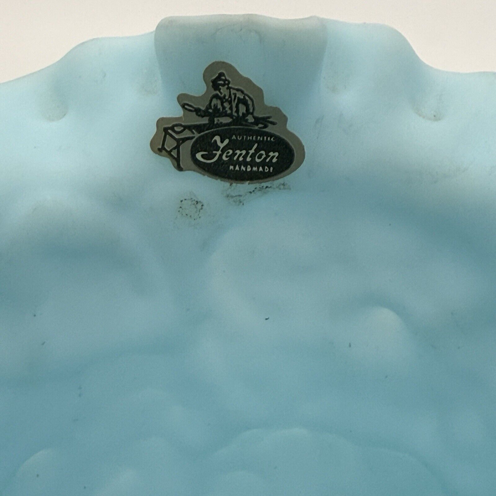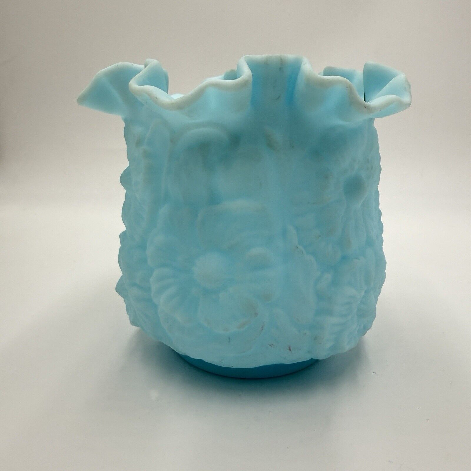 Vtg Fenton Blue Satin Glass Vase Ruffled Edge Poppy/Daisy Large 6" H x 6 1/2" W