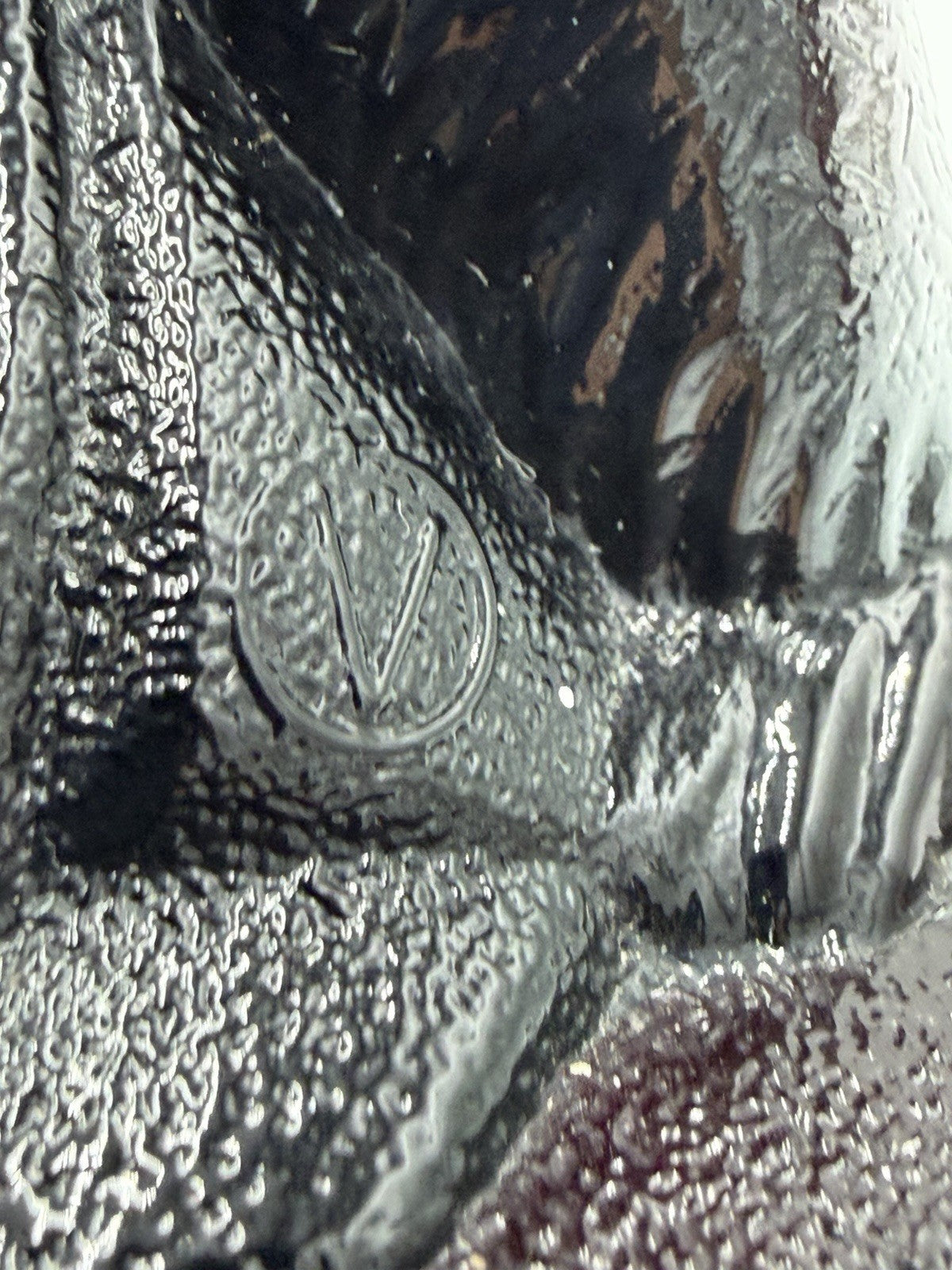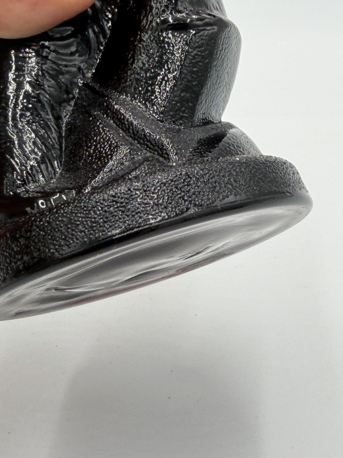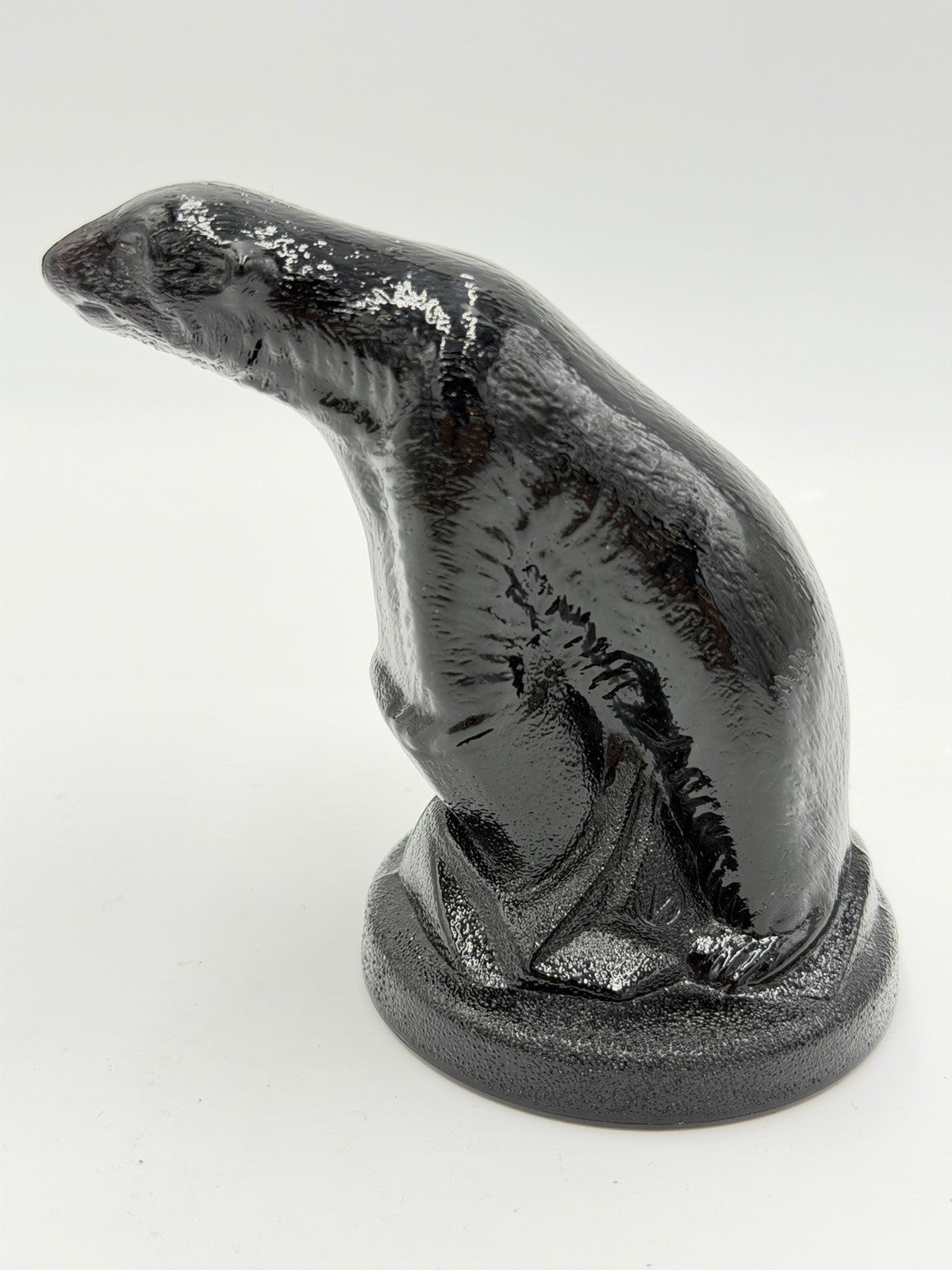 This vintage Summit Art Glass Company Polar Bear figurine from 1972 is a rare and unique piece of American Directoire style glassware. The black glass figurine stands at 4 inches tall and features a glossy finish, with an incised backstamp showcasing its originality. With its 3D effect and iconic subject of a polar bear, this figurine is a charming addition to any collector's display of decorative pottery and glassware.