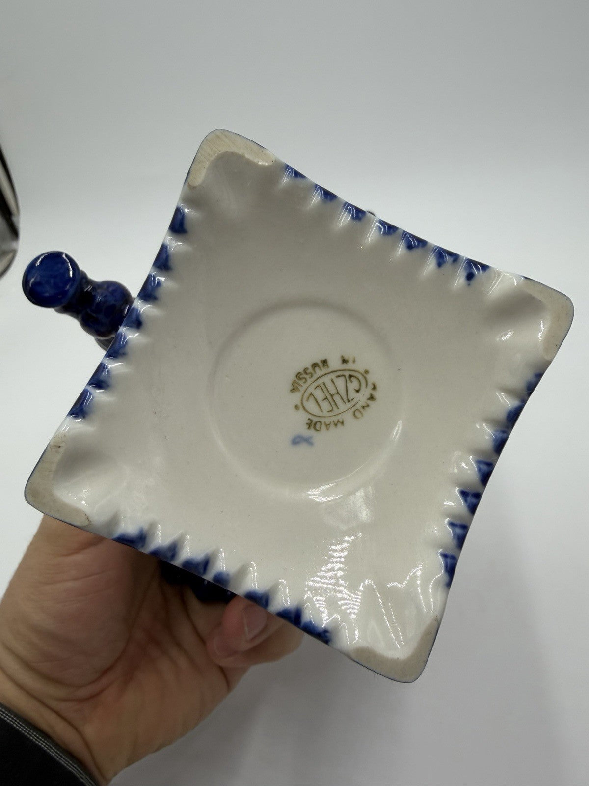 This vintage USSR Porcelain GZHEL Samovar is a handmade tea urn featuring a beautiful floral pattern in white and blue colors. With a medium size at 8.5 inches, this samovar is perfect for all occasions and showcases a bohemian style. Made of glazed porcelain, it has handles for easy filling and originates from the Russian Federation. Perfect for collectors of unique and traditional kitchen and home items, this samovar adds a touch of charm and history to any tea set collection.